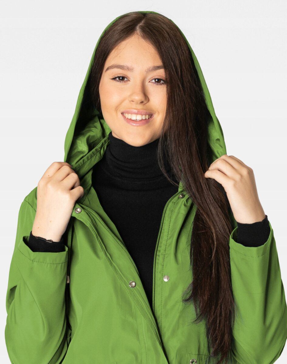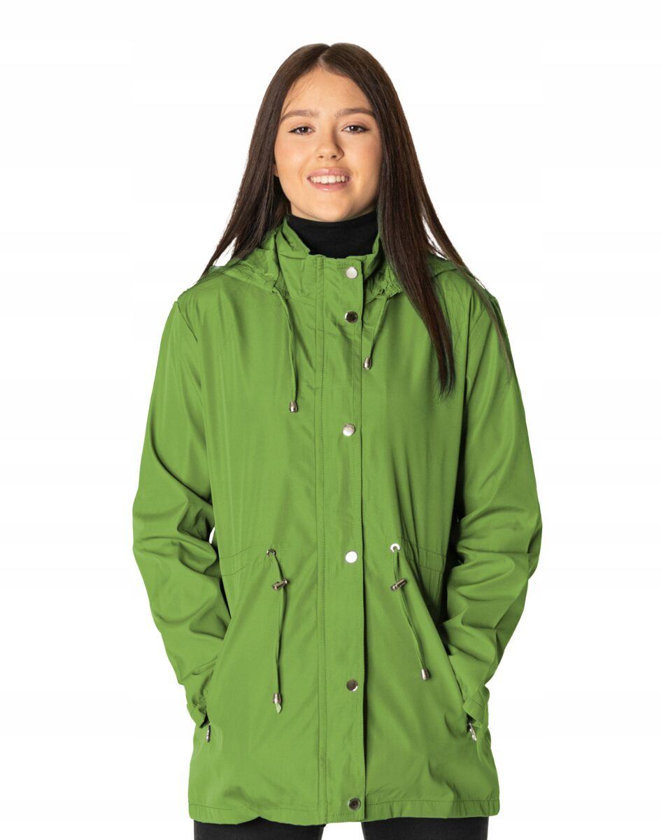 Kurtka jest wiatroszczelna, wodoodporna i zapinana w całości na zamek błyskawiczny kryty plisą zapinaną na napy. Odpinany na zamek i regulowany taśmą ściągającą kaptur osłoni Twoją głowę przed deszczem, chłodem i wiatrem. Wysoki kołnierz typu stójka skutecznie chroni podbródek i szyję a często zastępuje nawet szalik co jest bardzo wygodne. Kurtka posiada dwie kieszenie przednie na dłonie zasuwane na zamki błyskawiczne oraz wewnętrzną kieszeń na portfel, dokumenty, telefon komórkowy MP3 itp. Ściągacz regulacyjny wszyty w talii pozwala na precyzyjne dopasowanie kurtki do ciała, co znacznie zapobiega utracie ciepła i zgrabnie modeluje sylwetkę w talii nadając jej właściwe proporcje. Materiał zewnętrzny jest wiatroszczelny i wodoodporny zapewniając wygodę oraz komfort termiczny użytkowania nawet w mniej sprzyjających warunkach pogodowych. Wewnętrzna strona kurtki wykończona jest materiałową podszewką. Długość do połowy uda, która świetnie podkreśli elegancję i kobiecość w twoim wyglądzie, jak również trzyma ciepło i przytulność przy zmiennej pogodzie. Nie krępuje ruchów i z powodzeniem zakrywa części ciała wrażliwe na chłód jak plecy na wysokości nerek i pośladki.