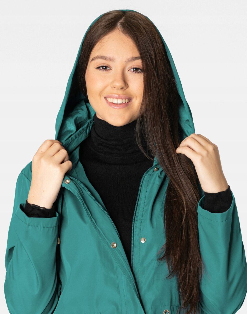 Kurtka jest wiatroszczelna, wodoodporna i zapinana w całości na zamek błyskawiczny kryty plisą zapinaną na napy. Odpinany na zamek i regulowany taśmą ściągającą kaptur osłoni Twoją głowę przed deszczem, chłodem i wiatrem. Wysoki kołnierz typu stójka skutecznie chroni podbródek i szyję a często zastępuje nawet szalik co jest bardzo wygodne. Kurtka posiada dwie kieszenie przednie na dłonie zasuwane na zamki błyskawiczne oraz wewnętrzną kieszeń na portfel, dokumenty, telefon komórkowy MP3 itp. Ściągacz regulacyjny wszyty w talii pozwala na precyzyjne dopasowanie kurtki do ciała, co znacznie zapobiega utracie ciepła i zgrabnie modeluje sylwetkę w talii nadając jej właściwe proporcje. Materiał zewnętrzny jest wiatroszczelny i wodoodporny zapewniając wygodę oraz komfort termiczny użytkowania nawet w mniej sprzyjających warunkach pogodowych. Wewnętrzna strona kurtki wykończona jest materiałową podszewką. Długość do połowy uda, która świetnie podkreśli elegancję i kobiecość w twoim wyglądzie, jak również trzyma ciepło i przytulność przy zmiennej pogodzie. Nie krępuje ruchów i z powodzeniem zakrywa części ciała wrażliwe na chłód jak plecy na wysokości nerek i pośladki.