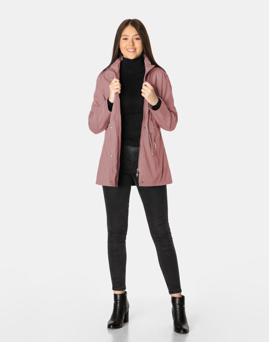 Kurtka jest wiatroszczelna, wodoodporna i zapinana w całości na zamek błyskawiczny kryty plisą zapinaną na napy. Odpinany na zamek i regulowany taśmą ściągającą kaptur osłoni Twoją głowę przed deszczem, chłodem i wiatrem. Wysoki kołnierz typu stójka skutecznie chroni podbródek i szyję a często zastępuje nawet szalik co jest bardzo wygodne. Kurtka posiada dwie kieszenie przednie na dłonie zasuwane na zamki błyskawiczne oraz wewnętrzną kieszeń na portfel, dokumenty, telefon komórkowy MP3 itp. Ściągacz regulacyjny wszyty w talii pozwala na precyzyjne dopasowanie kurtki do ciała, co znacznie zapobiega utracie ciepła i zgrabnie modeluje sylwetkę w talii nadając jej właściwe proporcje. Materiał zewnętrzny jest wiatroszczelny i wodoodporny zapewniając wygodę oraz komfort termiczny użytkowania nawet w mniej sprzyjających warunkach pogodowych. Wewnętrzna strona kurtki wykończona jest materiałową podszewką. Długość do połowy uda, która świetnie podkreśli elegancję i kobiecość w twoim wyglądzie, jak również trzyma ciepło i przytulność przy zmiennej pogodzie. Nie krępuje ruchów i z powodzeniem zakrywa części ciała wrażliwe na chłód jak plecy na wysokości nerek i pośladki.