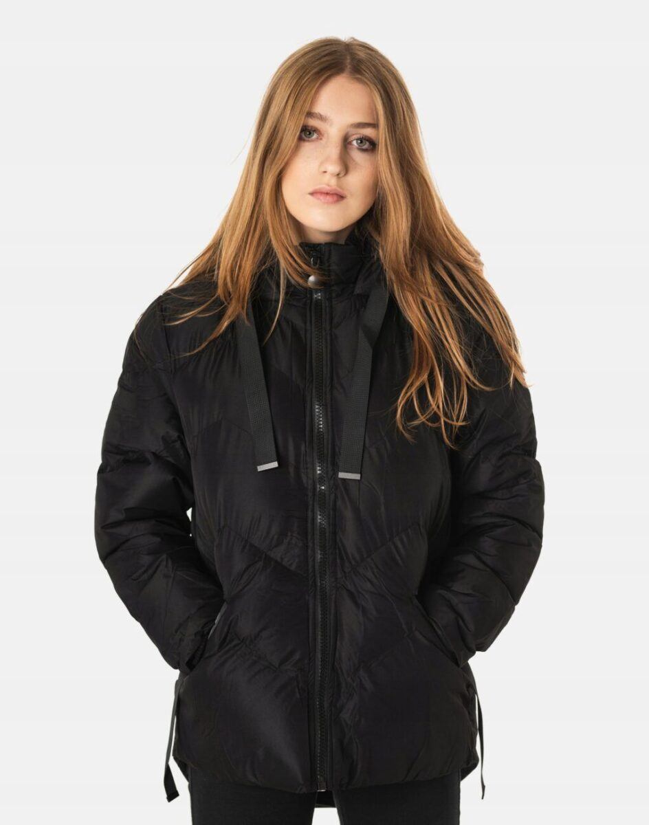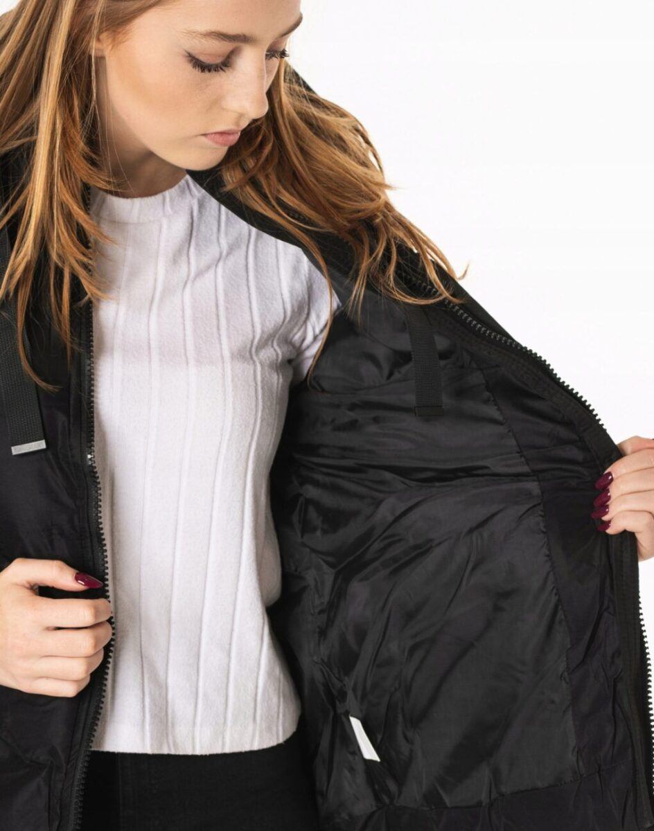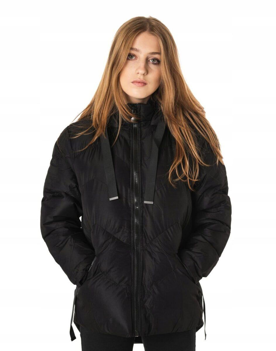 Ciepła zimowa kurtka damska ocieplona w całości puchem syntetycznym z praktycznym ocieplanym kapturem oraz delikatnie taliowanym fasonem, zgrabnie podkreślającym kobiecą sylwetkę. Modnie pikowana (aby w powstałych „kieszonkach” zmieścić jak najwięcej grzejącego surowca) i zasuwana w całości na firmowy zamek błyskawiczny. Kurtka jest wyjątkowo ciepła bo ocieplona w całości wysokiej jakości termicznym puchem syntetycznym. Na bokach ma dwie wpuszczane kieszenie na dłonie zasuwane na wodoodporne zamki błyskawiczne z ozdobnymi czarnymi taśmami. Wysoki kołnierz/stójka, zasłania szyję i chroni gardło, a często zastępuje nawet szalik co jest bardzo wygodne i skutecznie chroni przed zimnem i wiatrem. Praktyczny ocieplony puchem syntetycznym kaptur z możliwością regulacji wielkości i dopasowania 3D osłoni Twoją głowę przed deszczem, wiatrem i mrozem. Elastyczne ściągacze w rękawach skutecznie zapobiegają utracie ciepła i chronią przed podmuchami zimnego wiatru. Wewnętrzna strona kurtki wykończona jest materiałową podszewką. Długość do bioder, asymetryczna, z przodu krótsza a z tyłu dłuższa świetnie podkreśli elegancję i kobiecość w twoim wyglądzie, trzyma ciepło i przytulność przy mroźnej pogodzie. Nie krępuje ruchów a jej przedłużony tył z powodzeniem zakrywa części ciała wrażliwe na chłód jak plecy na wysokości nerek i pośladki. Modny krój pikowanych paneli, talia zgrabnie podkreślona, doskonale wyprofilowana konstrukcja prezentowana obecnie szeroko na modowych blogach. Kurtka została zaprojektowana, aby zapewnić użytkownikowi wygodę, komfort oraz maksymalną ochronę termiczną w ekstremalnych warunkach pogodowych, a dodatkowo przy tym stanowi mocny punkt każdej outdoorowej stylizacji.