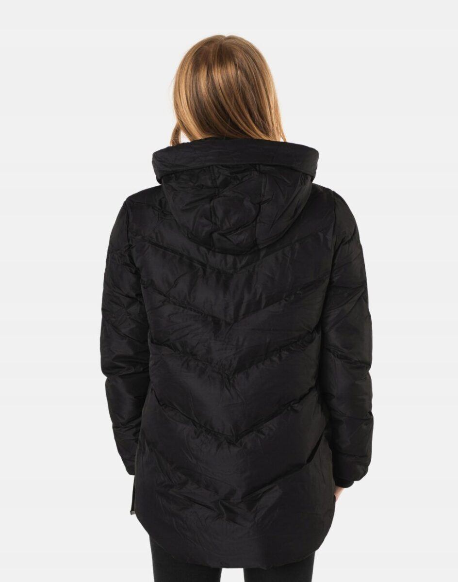 Ciepła Zimowa Kurtka Damska Pikowana z Ocieplanym Kapturem i Asymetrycznym Przedłużonym Tyłem