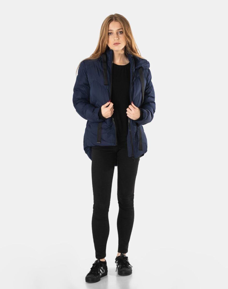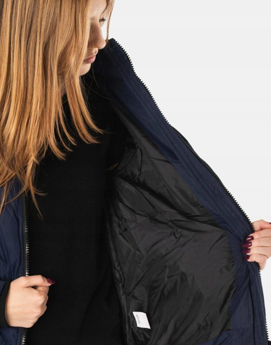Ciepła zimowa kurtka damska ocieplona w całości puchem syntetycznym z praktycznym ocieplanym kapturem oraz delikatnie taliowanym fasonem, zgrabnie podkreślającym kobiecą sylwetkę. Modnie pikowana (aby w powstałych „kieszonkach” zmieścić jak najwięcej grzejącego surowca) i zasuwana w całości na firmowy zamek błyskawiczny. Kurtka jest wyjątkowo ciepła bo ocieplona w całości wysokiej jakości termicznym puchem syntetycznym. Na bokach ma dwie wpuszczane kieszenie na dłonie zasuwane na wodoodporne zamki błyskawiczne z ozdobnymi czarnymi taśmami. Wysoki kołnierz/stójka, zasłania szyję i chroni gardło, a często zastępuje nawet szalik co jest bardzo wygodne i skutecznie chroni przed zimnem i wiatrem. Praktyczny ocieplony puchem syntetycznym kaptur z możliwością regulacji wielkości i dopasowania 3D osłoni Twoją głowę przed deszczem, wiatrem i mrozem. Elastyczne ściągacze w rękawach skutecznie zapobiegają utracie ciepła i chronią przed podmuchami zimnego wiatru. Wewnętrzna strona kurtki wykończona jest materiałową podszewką. Długość do bioder, asymetryczna, z przodu krótsza a z tyłu dłuższa świetnie podkreśli elegancję i kobiecość w twoim wyglądzie, trzyma ciepło i przytulność przy mroźnej pogodzie. Nie krępuje ruchów a jej przedłużony tył z powodzeniem zakrywa części ciała wrażliwe na chłód jak plecy na wysokości nerek i pośladki. Modny krój pikowanych paneli, talia zgrabnie podkreślona, doskonale wyprofilowana konstrukcja prezentowana obecnie szeroko na modowych blogach. Kurtka została zaprojektowana, aby zapewnić użytkownikowi wygodę, komfort oraz maksymalną ochronę termiczną w ekstremalnych warunkach pogodowych, a dodatkowo przy tym stanowi mocny punkt każdej outdoorowej stylizacji.