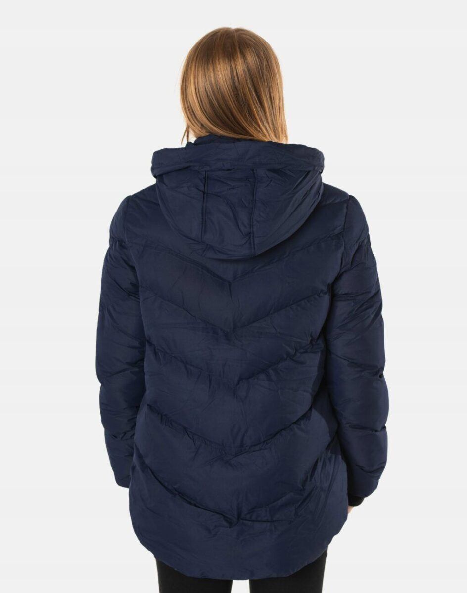 Ciepła Zimowa Kurtka Damska Pikowana z Ocieplanym Kapturem i Asymetrycznym Przedłużonym Tyłem