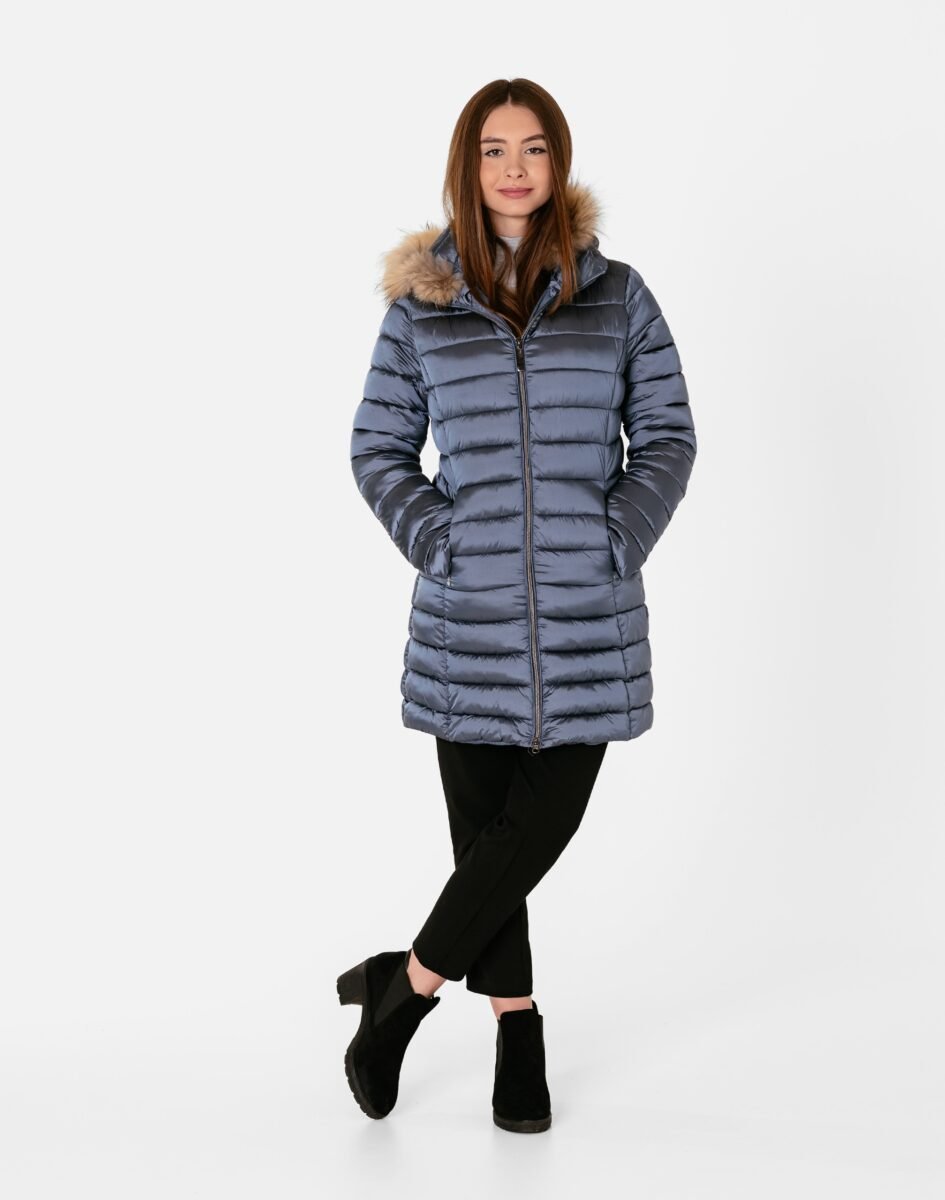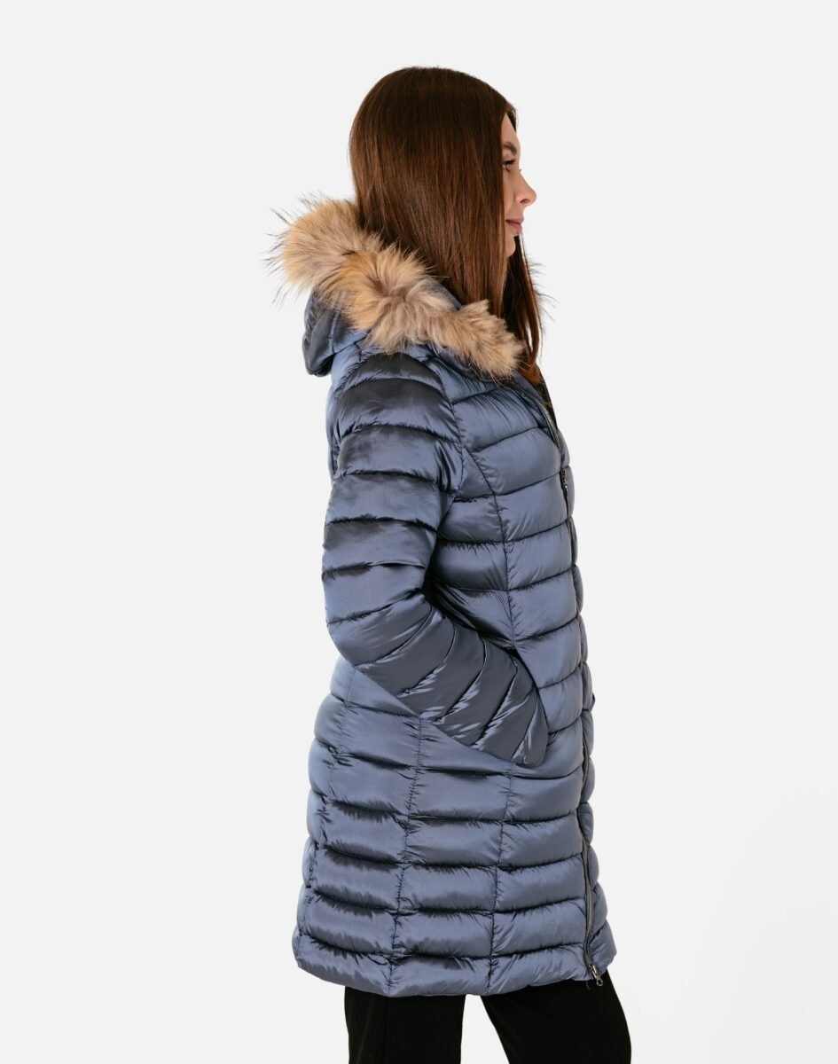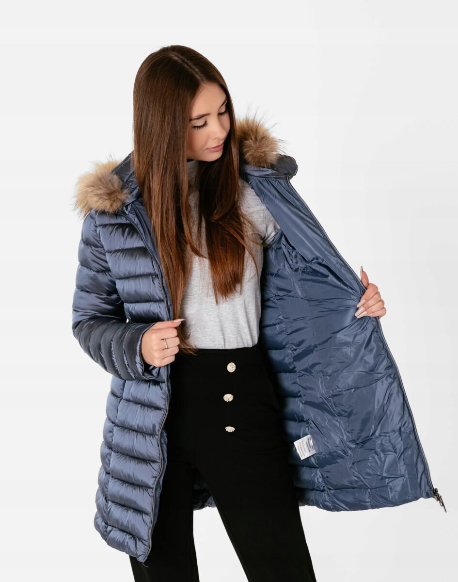 Ciepła zimowa kurtka/płaszczyk damski typu Alaska ocieplony w całości puchem syntetycznym, z praktycznym ocieplonym i odpinanym na zamek kapturem ozdobionym puszystym futerkiem. Modnie pikowana (aby w powstałych „kieszonkach” zmieścić jak najwięcej grzejącego surowca) i zasuwana w całości na firmowy zamek błyskawiczny. Materiał na zewnątrz posiada wykończenie typu Water Repellency, które zapobiega nasączeniu warstwy zewnętrznej wodą. Kurtka/płaszczyk Alaska posiada dwie duże kryte kieszenie na dłonie zasuwane na zamki błyskawiczne. Wysoki, ocieplony kołnierz/stójka, zasłania szyję i chroni gardło, a często zastępuje nawet szalik co jest bardzo wygodne i skutecznie chroni przed zimnem i wiatrem. Praktyczny ocieplony puchem syntetycznym i odpinany na zamek kaptur, ozdobiony ciepłym sztucznym futerkiem osłoni Twoją głowę przed deszczem, wiatrem i chłodem. Talia zgrabnie podkreślona, doskonale wyprofilowana konstrukcja nadaje kobiecej sylwetce atrakcyjne proporcje. Wewnętrzna strona kurtki wykończona jest materiałową podszewką. Długość do połowy uda, która świetnie podkreśli elegancję i kobiecość w twoim wyglądzie, trzyma ciepło i przytulność przy mroźnej pogodzie, nie krępuje ruchów i z powodzeniem zakrywa części ciała wrażliwe na chłód jak plecy na wysokości nerek, pośladki i uda. Modny krój pikowanych paneli i doskonale wyprofilowana konstrukcja prezentowana obecnie szeroko na modowych blogach.