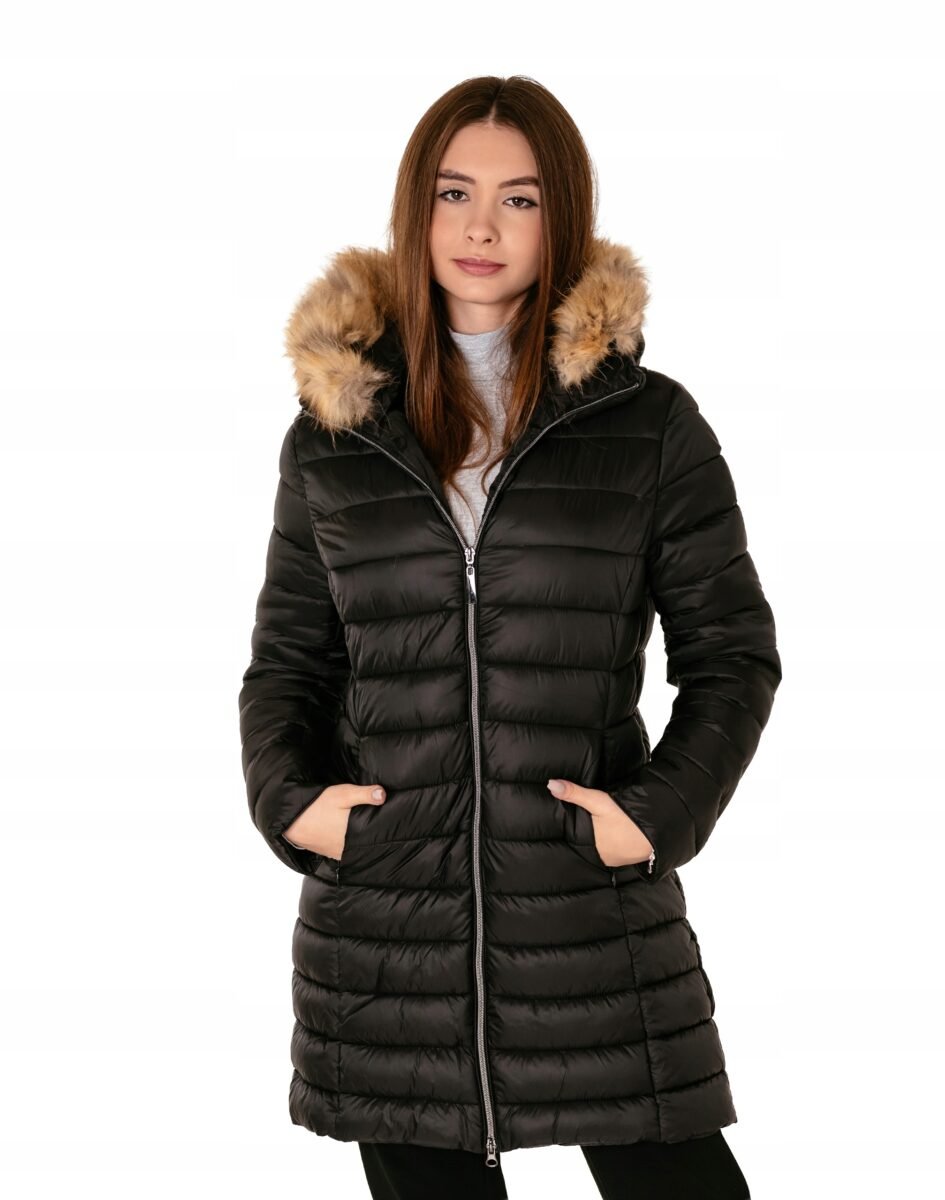 Ciepła zimowa kurtka/płaszczyk damski typu Alaska ocieplony w całości puchem syntetycznym, z praktycznym ocieplonym i odpinanym na zamek kapturem ozdobionym puszystym futerkiem. Modnie pikowana (aby w powstałych „kieszonkach” zmieścić jak najwięcej grzejącego surowca) i zasuwana w całości na firmowy zamek błyskawiczny. Materiał na zewnątrz posiada wykończenie typu Water Repellency, które zapobiega nasączeniu warstwy zewnętrznej wodą. Kurtka/płaszczyk Alaska posiada dwie duże kryte kieszenie na dłonie zasuwane na zamki błyskawiczne. Wysoki, ocieplony kołnierz/stójka, zasłania szyję i chroni gardło, a często zastępuje nawet szalik co jest bardzo wygodne i skutecznie chroni przed zimnem i wiatrem. Praktyczny ocieplony puchem syntetycznym i odpinany na zamek kaptur, ozdobiony ciepłym sztucznym futerkiem osłoni Twoją głowę przed deszczem, wiatrem i chłodem. Talia zgrabnie podkreślona, doskonale wyprofilowana konstrukcja nadaje kobiecej sylwetce atrakcyjne proporcje. Wewnętrzna strona kurtki wykończona jest materiałową podszewką. Długość do połowy uda, która świetnie podkreśli elegancję i kobiecość w twoim wyglądzie, trzyma ciepło i przytulność przy mroźnej pogodzie, nie krępuje ruchów i z powodzeniem zakrywa części ciała wrażliwe na chłód jak plecy na wysokości nerek, pośladki i uda. Modny krój pikowanych paneli i doskonale wyprofilowana konstrukcja prezentowana obecnie szeroko na modowych blogach.