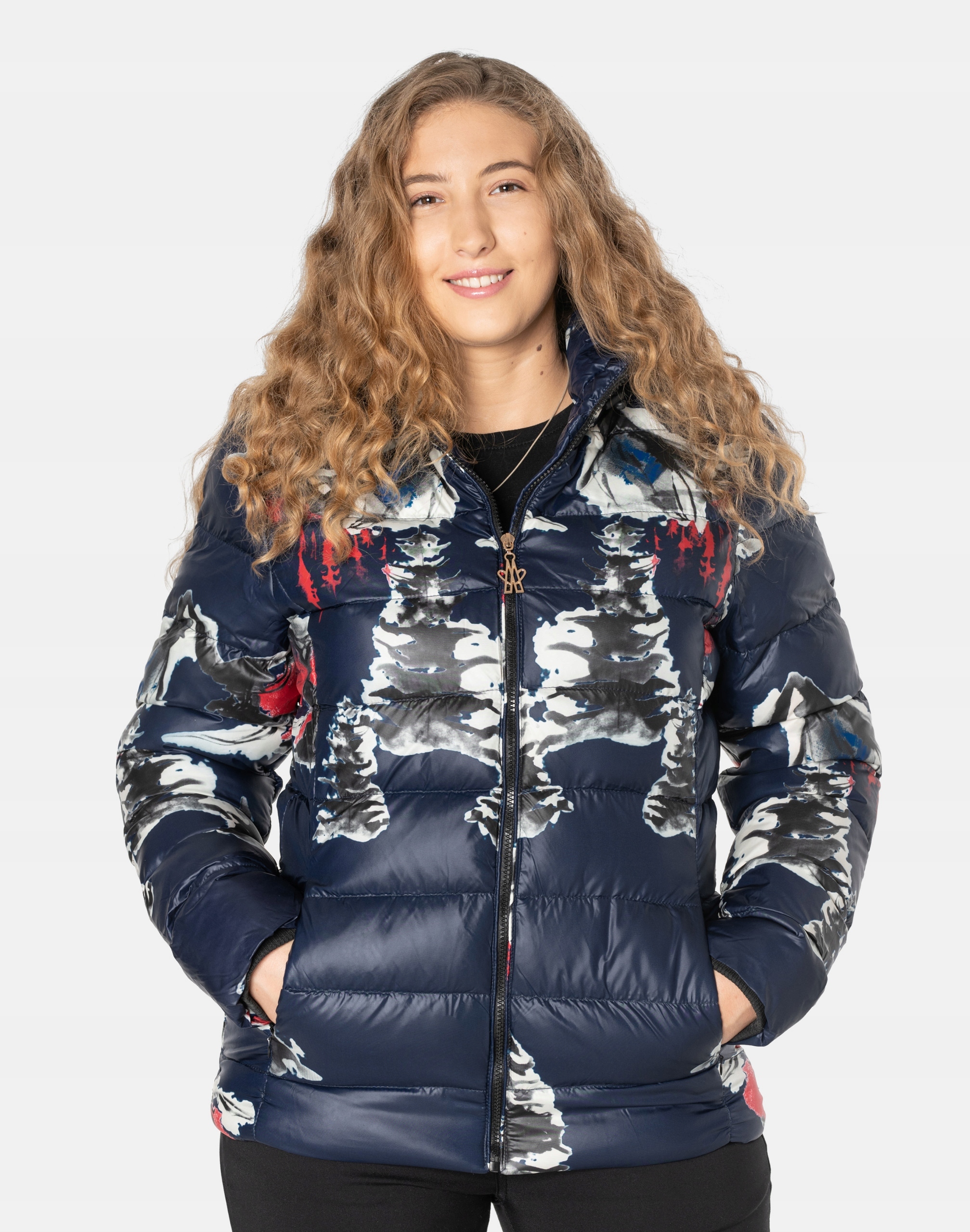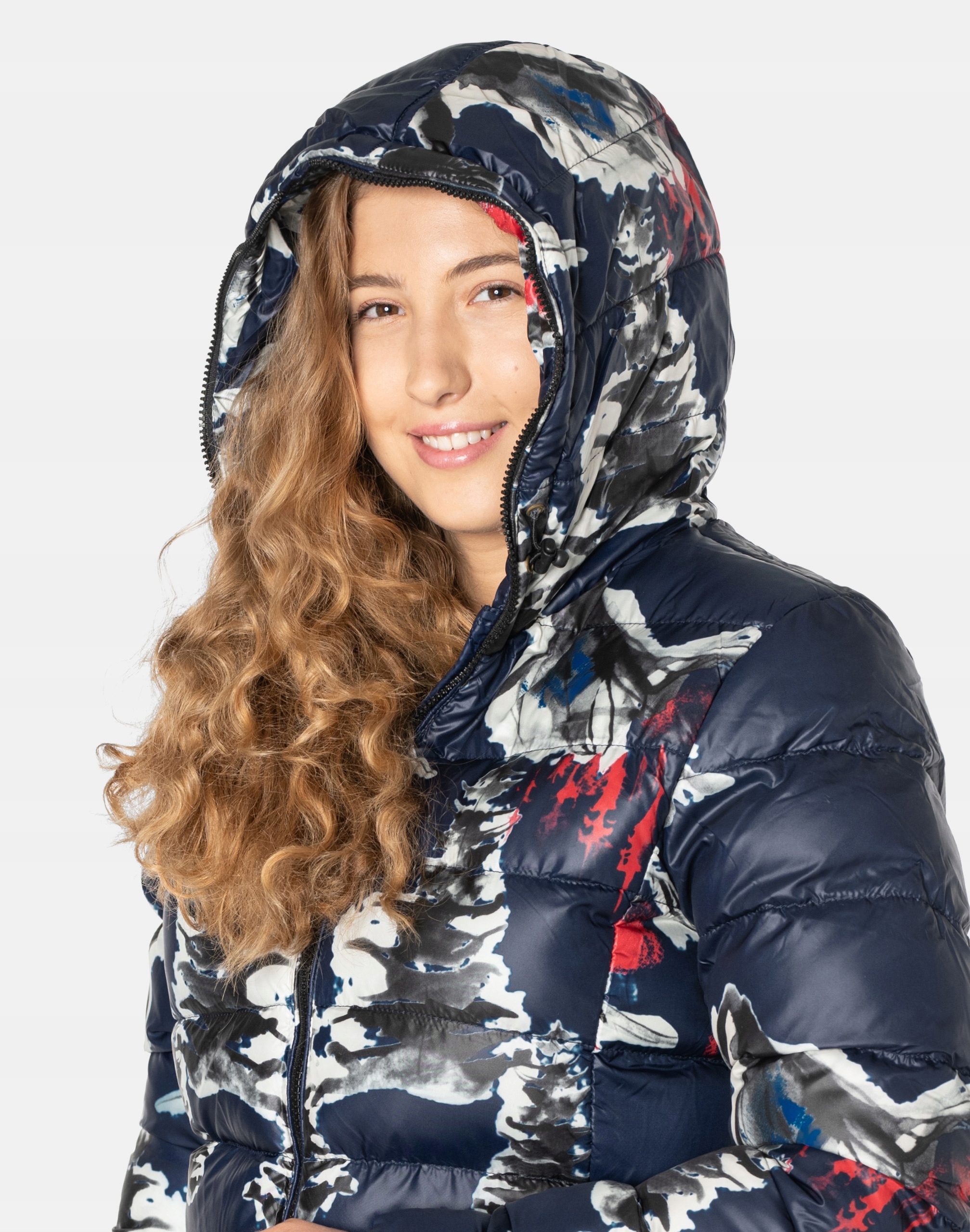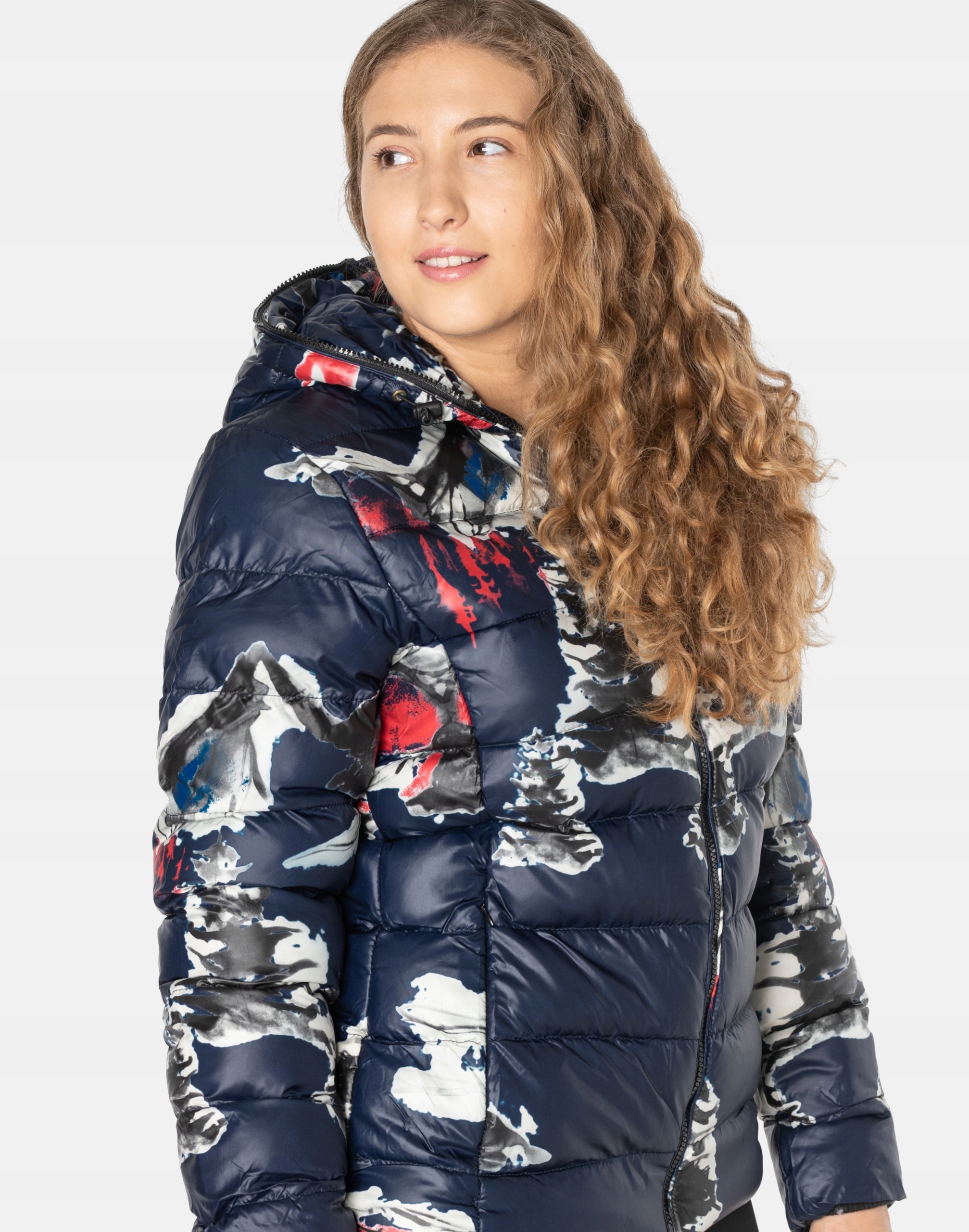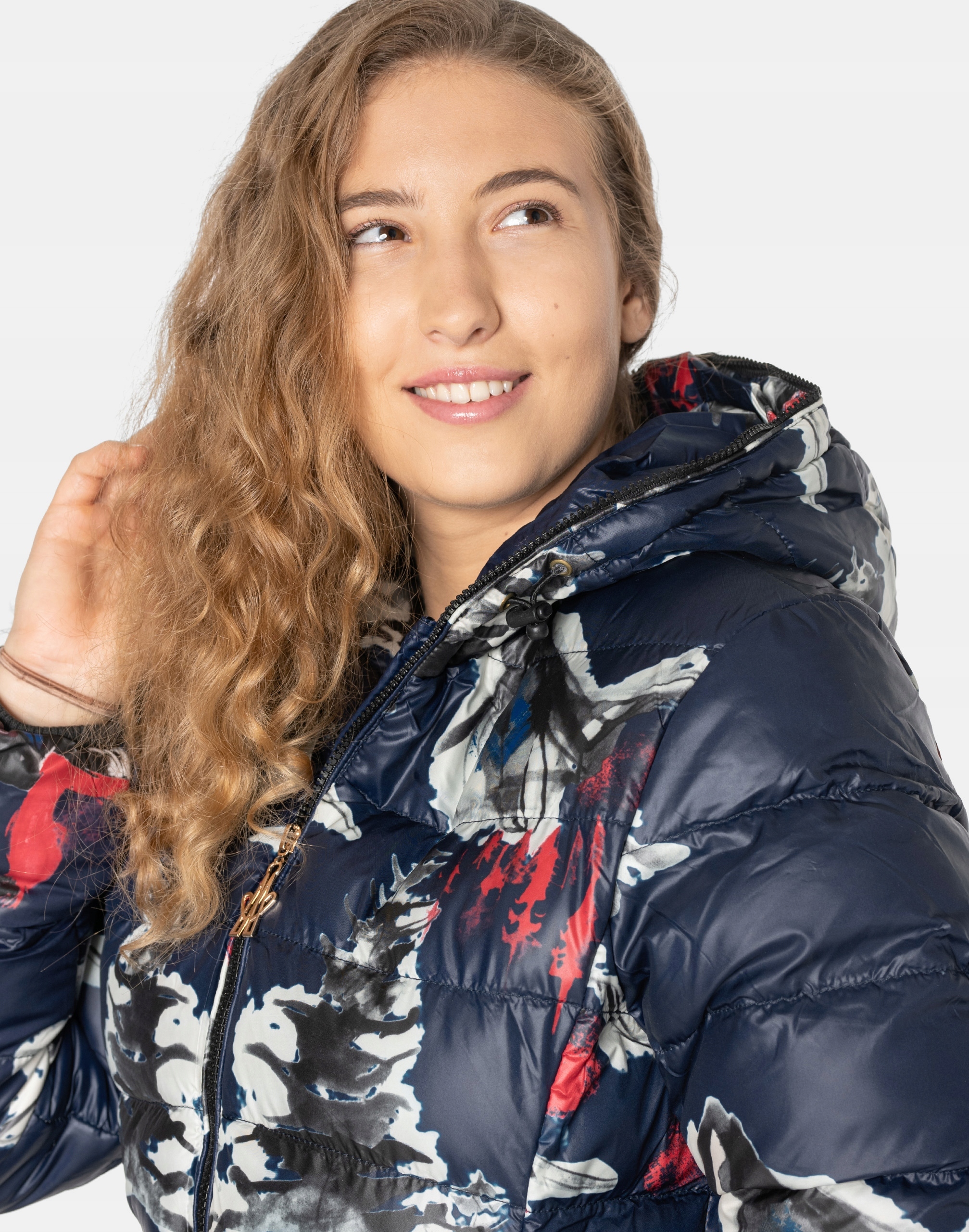 Ciepła zimowa kurtka damska ocieplona w całości puchem syntetycznym i przekonująca efektownym, dopasowanym fasonem, zgrabnie podkreślającym kobiecą sylwetkę. Modnie pikowana i zasuwana w całości na firmowy zamek błyskawiczny. Materiał na zewnątrz posiada wykończenie typu Water Repellency, które zapobiega nasączeniu warstwy zewnętrznej wodą. Na bokach ma dwie wpuszczane kieszenie na dłonie zasuwane na zamki błyskawiczne a od wewnętrznej strony kieszeń naszywaną zapinaną na rzep. Kołnierz/stójka połączony z kapturem, zasłania szyję i chroni gardło a często zastępuje nawet szalik co jest bardzo wygodne i skutecznie chroni przed zimnem i wiatrem. Praktyczny ocieplony puchem syntetycznym kaptur z możliwością regulacji wielkości i dopasowania osłoni Twoją głowę przed deszczem, wiatrem i chłodem. Szerokie elastyczne wiatrołapy w rękawach skutecznie zapobiegają utracie ciepła i chronią przed podmuchami zimnego wiatru. Wewnętrzna strona kurtki wykończona jest materiałową podszewką. Długość do bioder, która świetnie podkreśli elegancję i kobiecość w twoim wyglądzie, trzyma ciepło i przytulność przy zmiennej pogodzie. Nie krępuje ruchów i z powodzeniem zakrywa części ciała wrażliwe na chłód jak plecy na wysokości nerek. Modny krój pikowanych paneli z pionowymi przeszyciami na bokach powoduje optyczne wyszczuplenie damskiej sylwetki. Talia zgrabnie podkreślona, doskonale wyprofilowana konstrukcja prezentowana obecnie szeroko na modowych blogach. Została zaprojektowana aby zapewnić użytkownikowi wygodę, komfort oraz maksymalną ochronę w ekstremalnych warunkach pogodowych a dodatkowo przy tym stanowi mocny punkt każdej outdoorowej stylizacji.