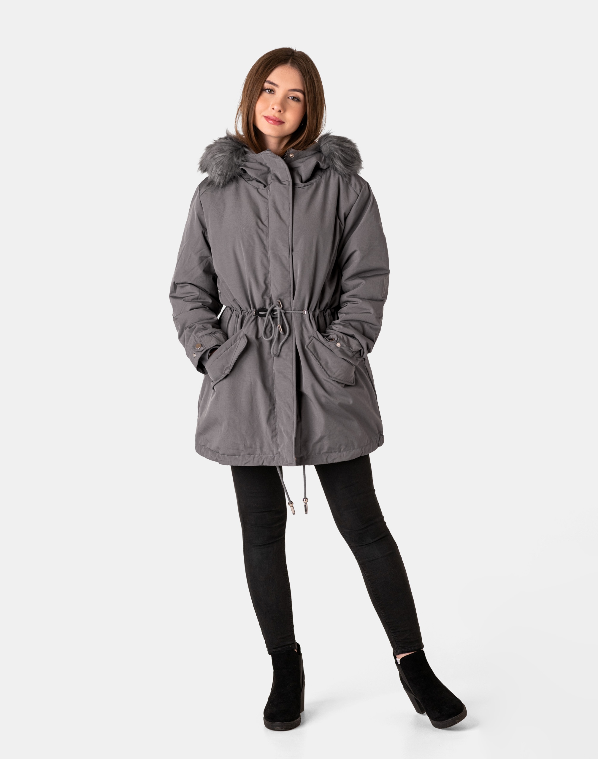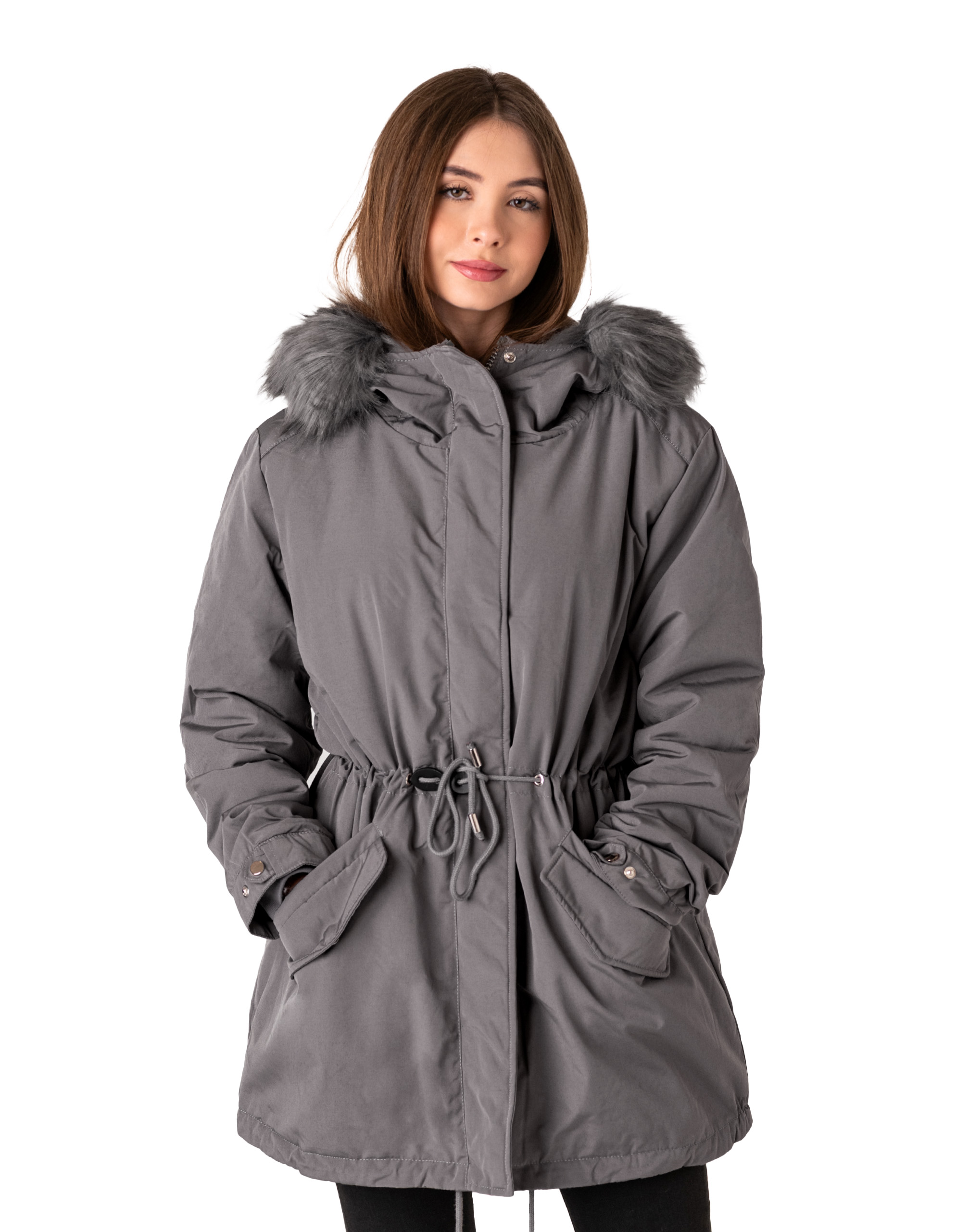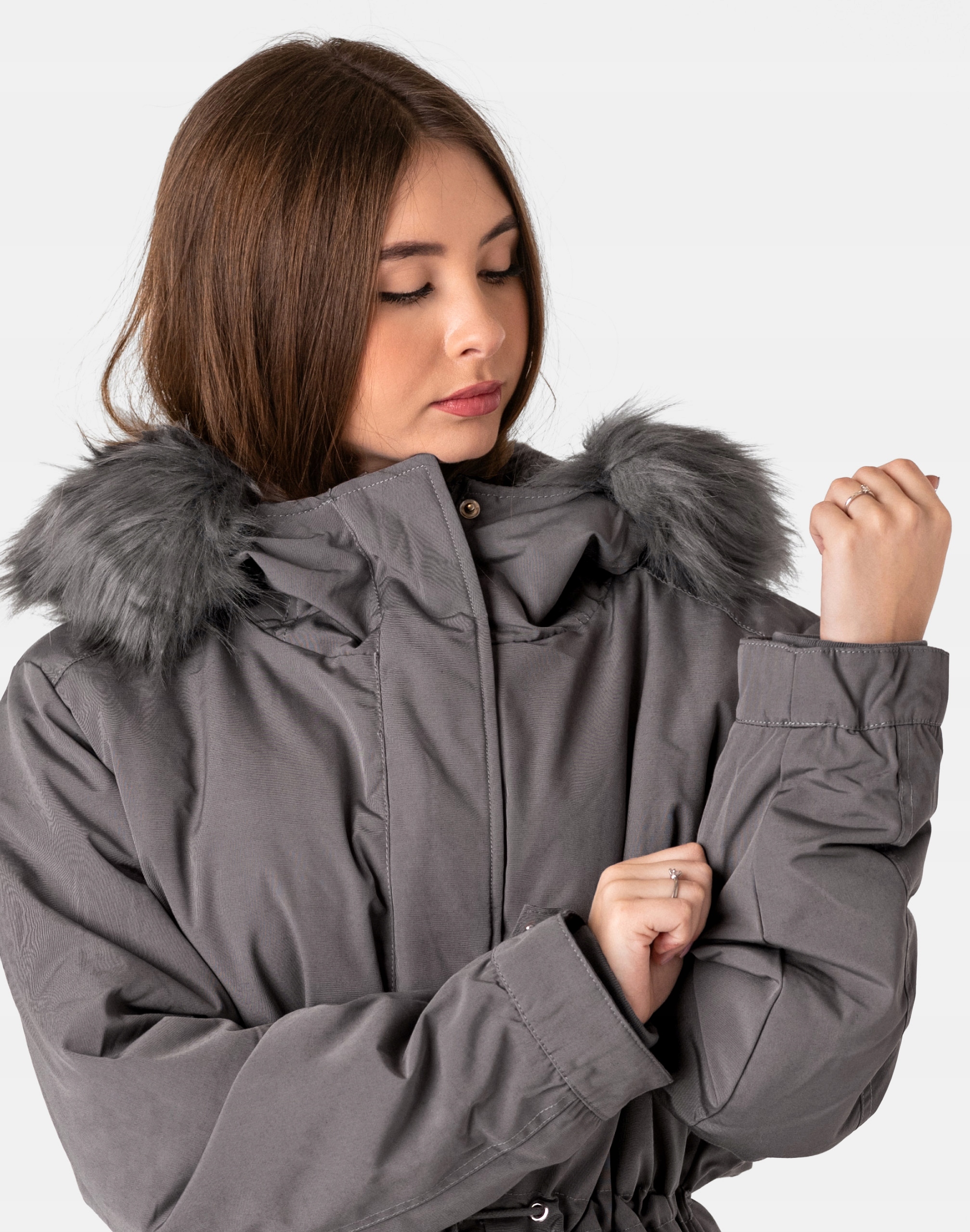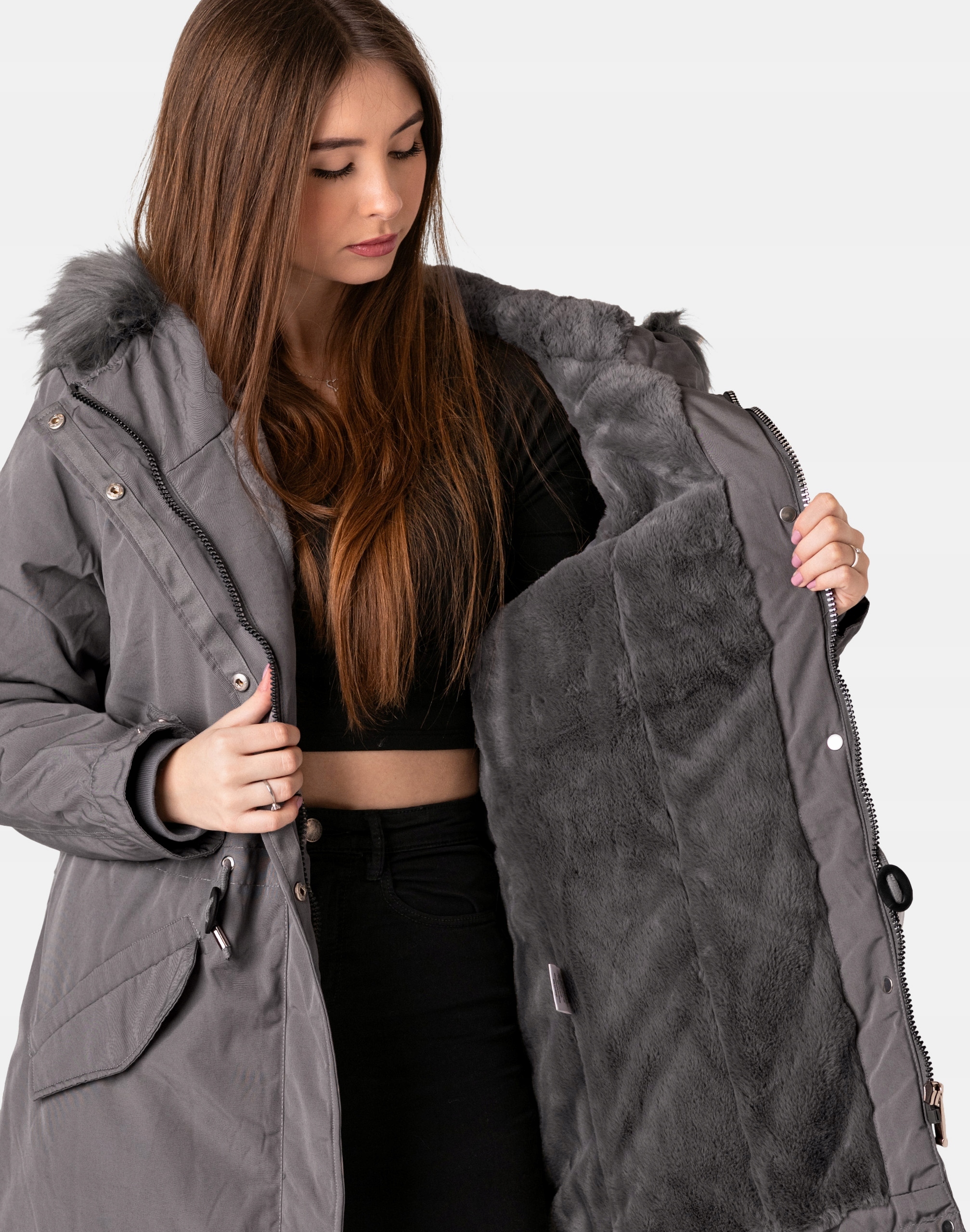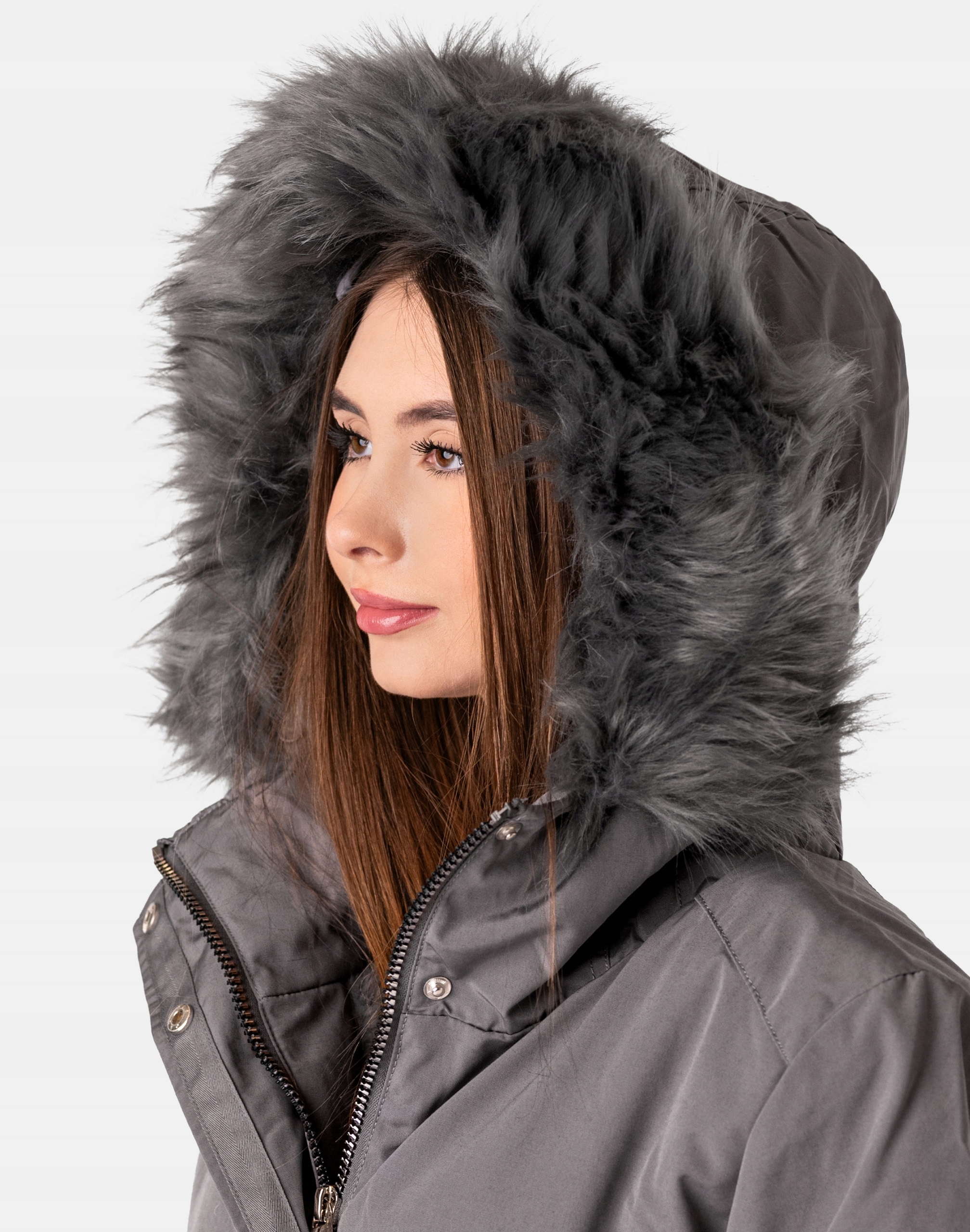 Ciepła zimowa kurtka damska typu Alaska ocieplona w całości puchem syntetycznym, z praktycznym ocieplonym kapturem ozdobionym puszystym futerkiem. Zasuwana w całości na zamek błyskawiczny kryty plisą zapinaną na napy. Materiał na zewnątrz jest wiatroszczelny i posiada wykończenie typu Water Repellency, które zapobiega nasączeniu warstwy zewnętrznej wodą. Na bokach kurtki znajdują się dwie wpuszczane kieszenie na dłonie zapinane na napy. Ściągacz regulacyjny wszyty w talii oraz na dole kurtki pozwala na precyzyjne dopasowanie kurtki do ciała, co znacznie zapobiega utracie ciepła i zgrabnie modeluje sylwetkę w talii nadając jej właściwe proporcje. Wysoki, ocieplony kołnierz/stójka, zasłania szyję i chroni gardło, a często zastępuje nawet szalik co jest bardzo wygodne i skutecznie chroni przed zimnem i wiatrem. Praktyczny ocieplony puchem syntetycznym i ozdobiony odpinanym sztucznym futerkiem kaptur osłoni Twoją głowę przed deszczem, wiatrem i chłodem. Elastyczne wiatrołapy wszyte w rękawach skutecznie zapobiegają utracie ciepła i chronią przed podmuchami zimnego wiatru. Wewnętrzna strona kurtki posiada podszewkę z futerka "Wellsoft" co zapewnia bardzo przyjemny kontakt ze skórą oraz podwójny komfort cieplny. Takie wykończenie wewnętrznej strony kurtki gwarantuje bardzo wysoki wskaźnik ochrony termicznej jak również zdecydowanie podnosi komfort użytkowania jesienią, a zwłaszcza zimą. Długość do połowy uda, która świetnie podkreśli elegancję i kobiecość w twoim wyglądzie, trzyma ciepło i przytulność przy mroźnej pogodzie, nie krępuje ruchów i z powodzeniem zakrywa części ciała wrażliwe na chłód jak plecy na wysokości nerek i pośladki. Fason zgrabnie taliowany oraz doskonale wyprofilowana konstrukcja podkreślająca kobiecą sylwetkę.. To prawdziwy evergreen dla udanych zimowych stylizacji.