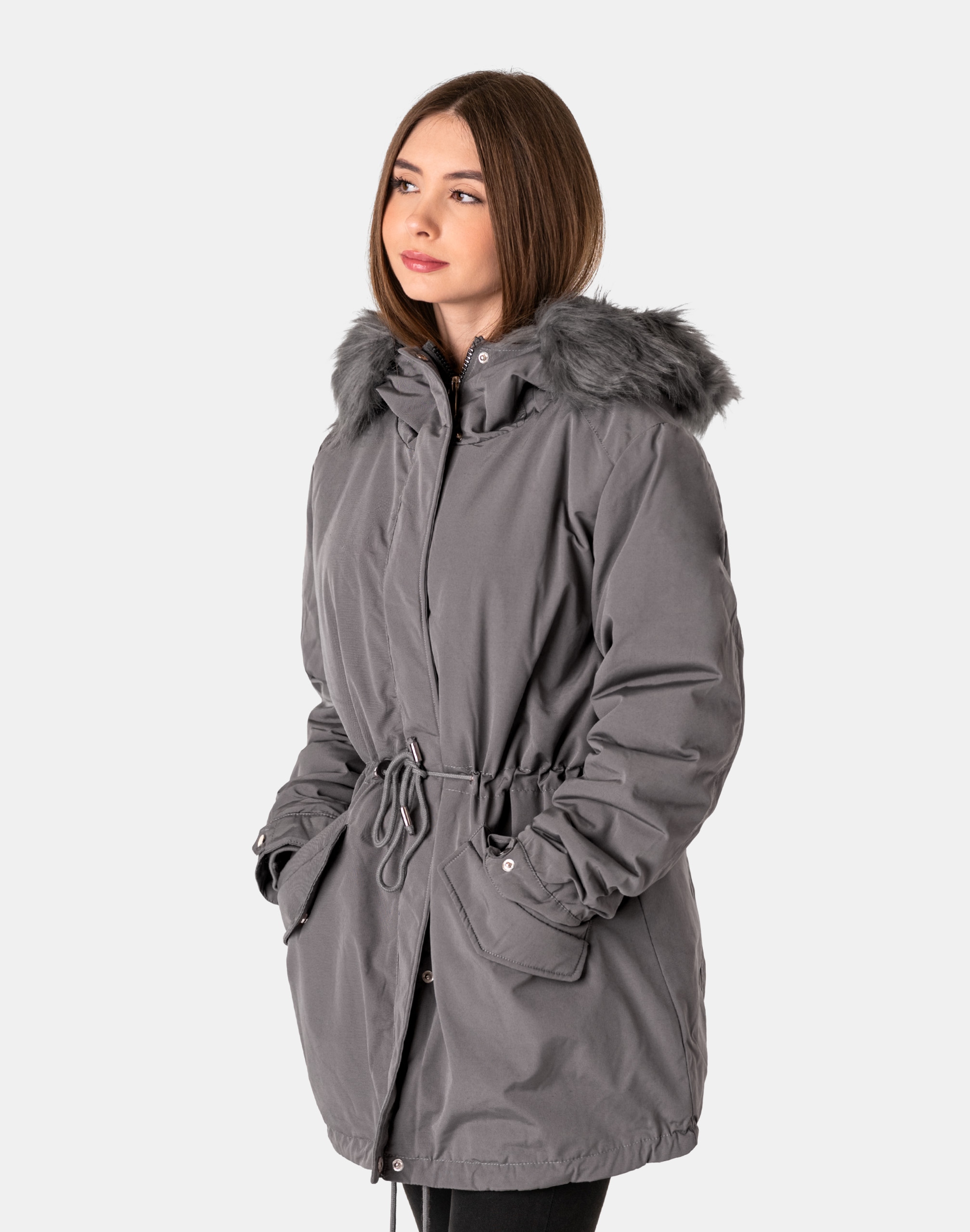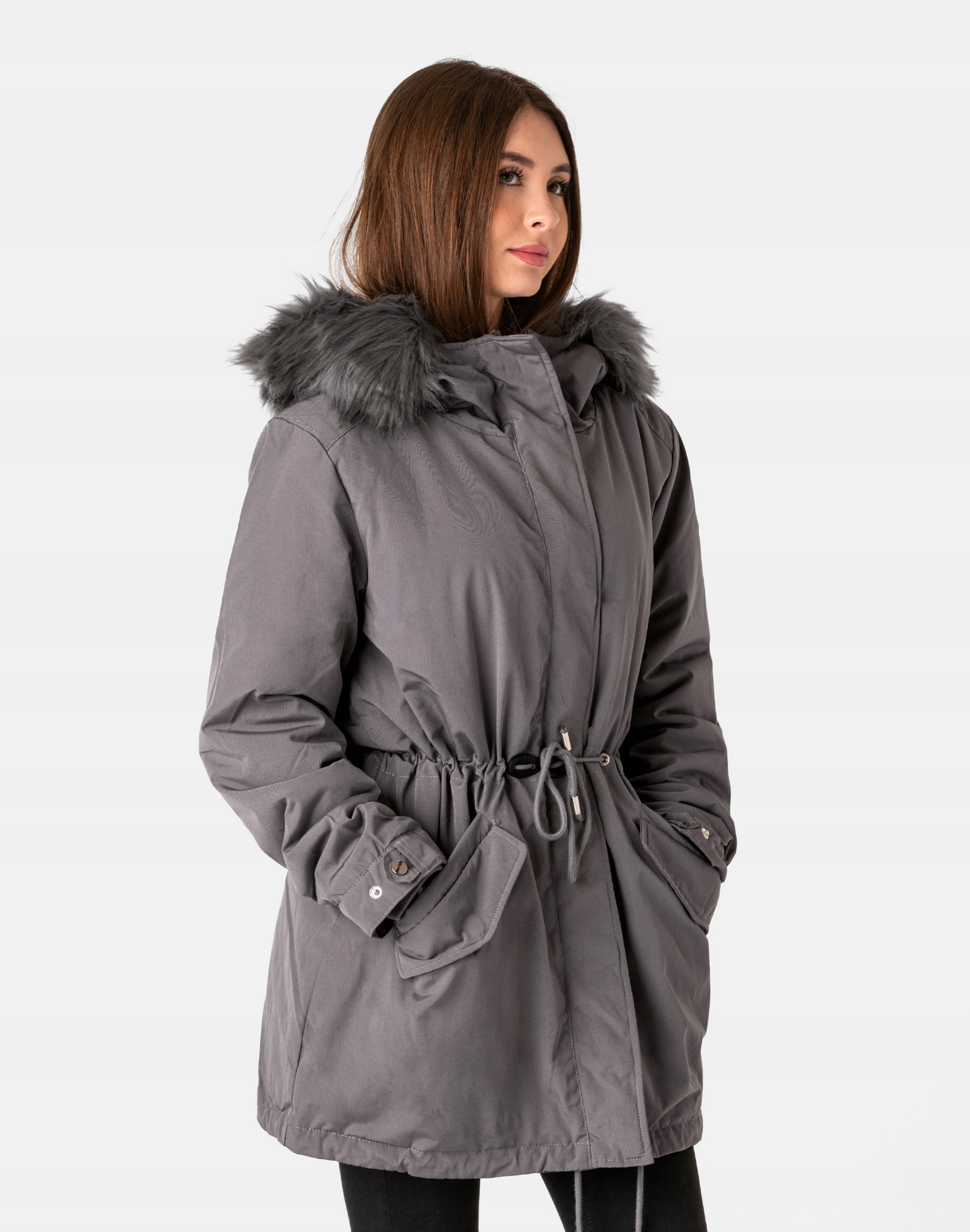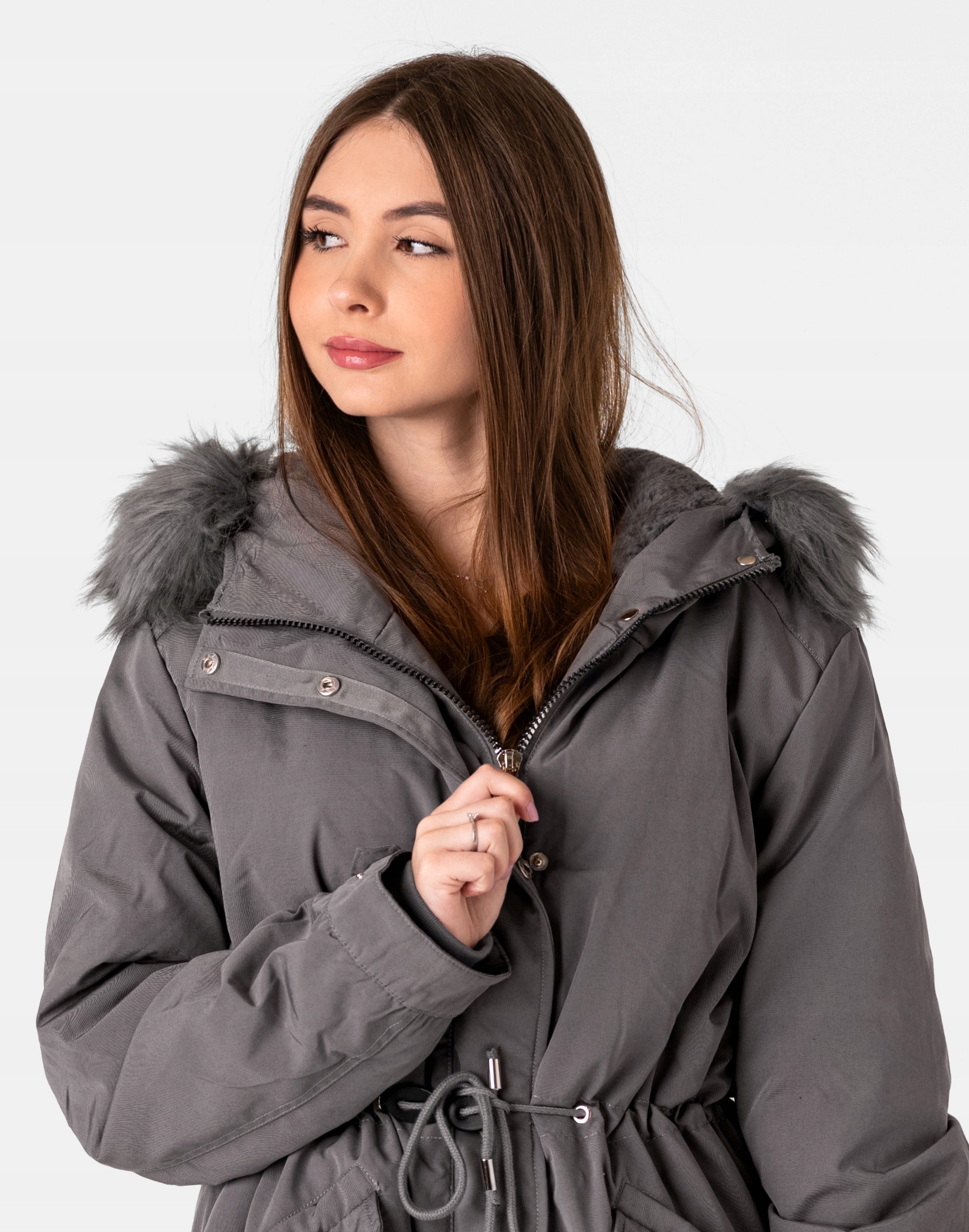 Ciepła zimowa kurtka damska typu Alaska ocieplona w całości puchem syntetycznym, z praktycznym ocieplonym kapturem ozdobionym puszystym futerkiem. Zasuwana w całości na zamek błyskawiczny kryty plisą zapinaną na napy. Materiał na zewnątrz jest wiatroszczelny i posiada wykończenie typu Water Repellency, które zapobiega nasączeniu warstwy zewnętrznej wodą. Na bokach kurtki znajdują się dwie wpuszczane kieszenie na dłonie zapinane na napy. Ściągacz regulacyjny wszyty w talii oraz na dole kurtki pozwala na precyzyjne dopasowanie kurtki do ciała, co znacznie zapobiega utracie ciepła i zgrabnie modeluje sylwetkę w talii nadając jej właściwe proporcje. Wysoki, ocieplony kołnierz/stójka, zasłania szyję i chroni gardło, a często zastępuje nawet szalik co jest bardzo wygodne i skutecznie chroni przed zimnem i wiatrem. Praktyczny ocieplony puchem syntetycznym i ozdobiony odpinanym sztucznym futerkiem kaptur osłoni Twoją głowę przed deszczem, wiatrem i chłodem. Elastyczne wiatrołapy wszyte w rękawach skutecznie zapobiegają utracie ciepła i chronią przed podmuchami zimnego wiatru. Wewnętrzna strona kurtki posiada podszewkę z futerka "Wellsoft" co zapewnia bardzo przyjemny kontakt ze skórą oraz podwójny komfort cieplny. Takie wykończenie wewnętrznej strony kurtki gwarantuje bardzo wysoki wskaźnik ochrony termicznej jak również zdecydowanie podnosi komfort użytkowania jesienią, a zwłaszcza zimą. Długość do połowy uda, która świetnie podkreśli elegancję i kobiecość w twoim wyglądzie, trzyma ciepło i przytulność przy mroźnej pogodzie, nie krępuje ruchów i z powodzeniem zakrywa części ciała wrażliwe na chłód jak plecy na wysokości nerek i pośladki. Fason zgrabnie taliowany oraz doskonale wyprofilowana konstrukcja podkreślająca kobiecą sylwetkę.. To prawdziwy evergreen dla udanych zimowych stylizacji.