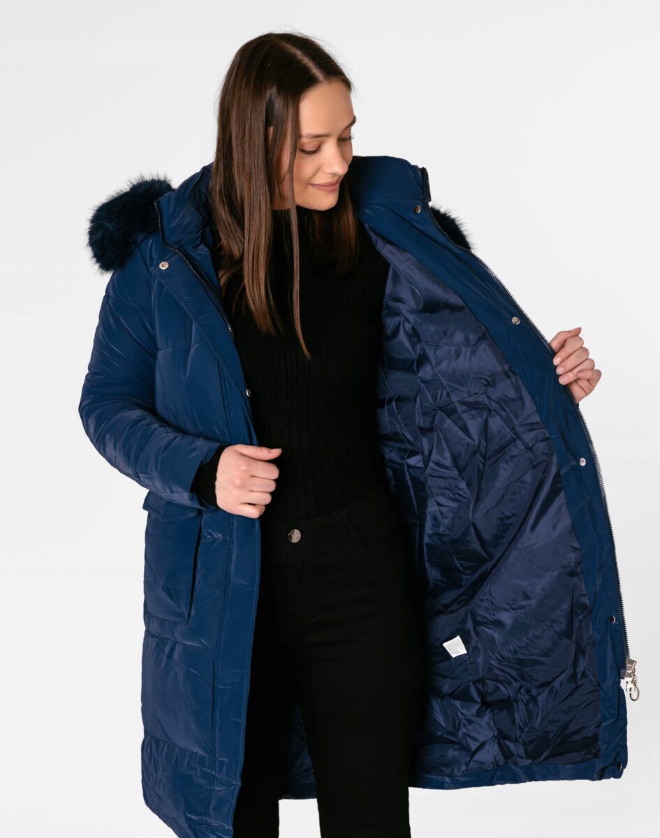 Ciepła zimowa kurtka damska typu Alaska ocieplona w całości puchem syntetycznym, z praktycznym ocieplonym i odpinanym na zamek kapturem ozdobionym puszystym futerkiem. Modnie pikowana (aby w powstałych „kieszonkach” zmieścić jak najwięcej grzejącego surowca) i zasuwana w całości na dwukierunkowy zamek błyskawiczny kryty plisą zapinaną na firmowe napy. Materiał na zewnątrz posiada wykończenie typu Water Repellency, które zapobiega nasączeniu warstwy zewnętrznej wodą. Kurtka posiada dwie duże podwójne kieszenie na dłonie kryte patkami zapinanymi na napy. Wysoki, ocieplony kołnierz/stójka, zasłania szyję i chroni gardło, a często zastępuje nawet szalik co jest bardzo wygodne i skutecznie chroni przed zimnem i wiatrem. Praktyczny ocieplony puchem syntetycznym i odpinany na zamek kaptur, ozdobiony odpinanym sztucznym futerkiem osłoni Twoją głowę przed deszczem, wiatrem i chłodem. Ściągacz regulacyjny wszyty w talii pozwala na precyzyjne dopasowanie kurtki do ciała, co znacznie zapobiega utracie ciepła i zgrabnie modeluje sylwetkę w talii nadając jej właściwe proporcje. Wewnętrzna strona kurtki wykończona jest materiałową podszewką. Długość do kolan, która świetnie podkreśli elegancję i kobiecość w twoim wyglądzie, trzyma ciepło i przytulność przy mroźnej pogodzie, nie krępuje ruchów i z powodzeniwm zakrywa części ciała wrażliwe na chłód jak plecy na wysokości nerek, pośladki i uda. Modny krój pikowanych paneli i doskonale wyprofilowana konstrukcja prezentowana obecnie szeroko na modowych blogach.