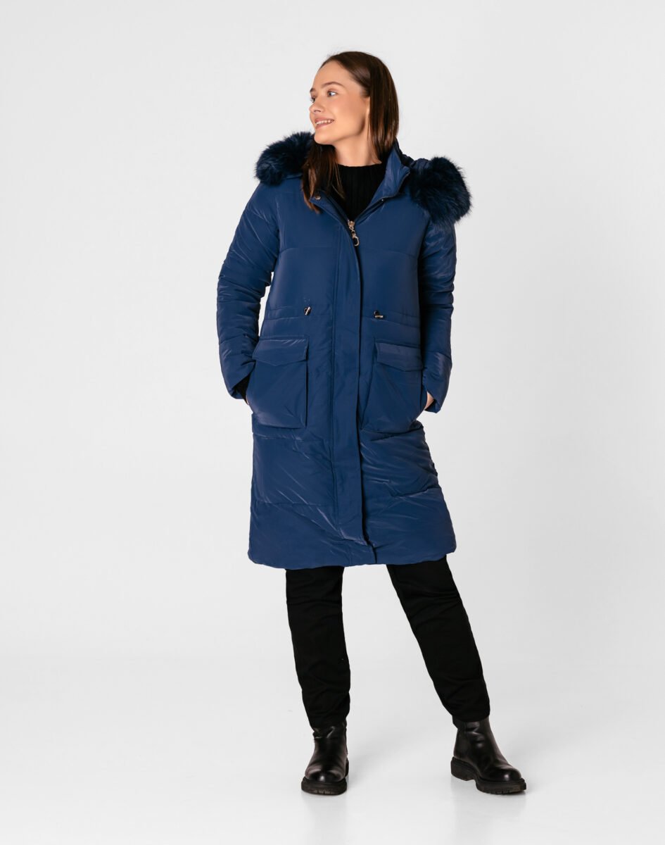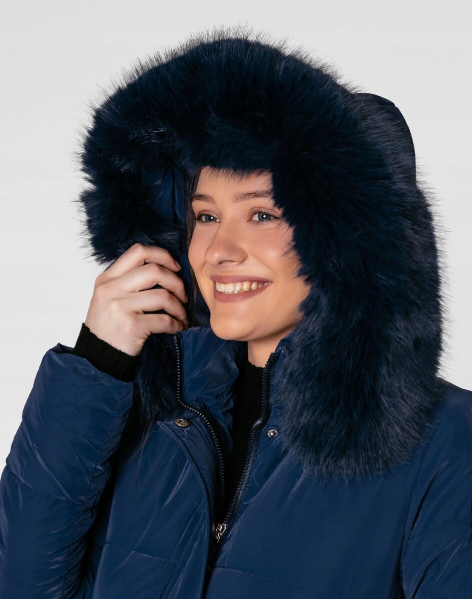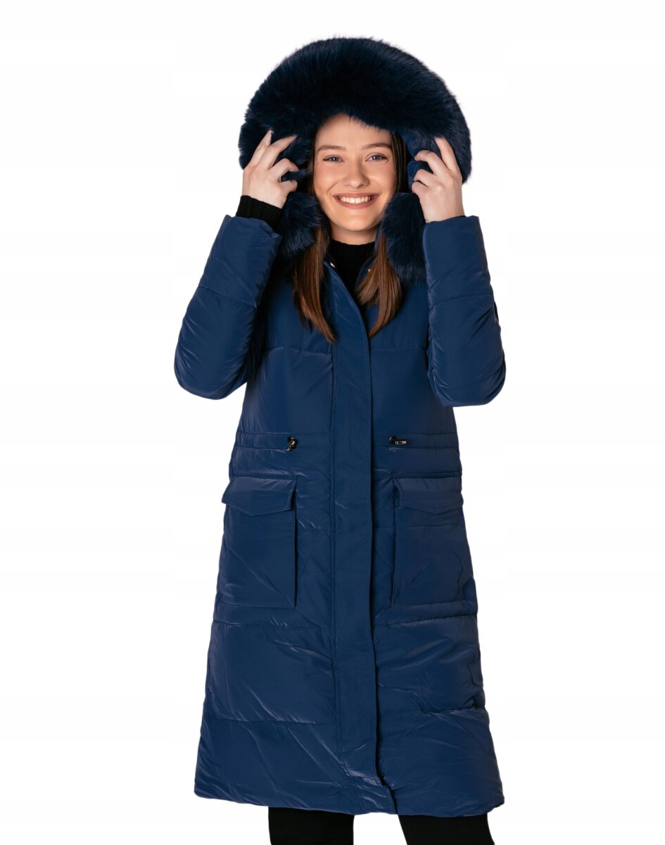 Ciepła zimowa kurtka damska typu Alaska ocieplona w całości puchem syntetycznym, z praktycznym ocieplonym i odpinanym na zamek kapturem ozdobionym puszystym futerkiem. Modnie pikowana (aby w powstałych „kieszonkach” zmieścić jak najwięcej grzejącego surowca) i zasuwana w całości na dwukierunkowy zamek błyskawiczny kryty plisą zapinaną na firmowe napy. Materiał na zewnątrz posiada wykończenie typu Water Repellency, które zapobiega nasączeniu warstwy zewnętrznej wodą. Kurtka posiada dwie duże podwójne kieszenie na dłonie kryte patkami zapinanymi na napy. Wysoki, ocieplony kołnierz/stójka, zasłania szyję i chroni gardło, a często zastępuje nawet szalik co jest bardzo wygodne i skutecznie chroni przed zimnem i wiatrem. Praktyczny ocieplony puchem syntetycznym i odpinany na zamek kaptur, ozdobiony odpinanym sztucznym futerkiem osłoni Twoją głowę przed deszczem, wiatrem i chłodem. Ściągacz regulacyjny wszyty w talii pozwala na precyzyjne dopasowanie kurtki do ciała, co znacznie zapobiega utracie ciepła i zgrabnie modeluje sylwetkę w talii nadając jej właściwe proporcje. Wewnętrzna strona kurtki wykończona jest materiałową podszewką. Długość do kolan, która świetnie podkreśli elegancję i kobiecość w twoim wyglądzie, trzyma ciepło i przytulność przy mroźnej pogodzie, nie krępuje ruchów i z powodzeniwm zakrywa części ciała wrażliwe na chłód jak plecy na wysokości nerek, pośladki i uda. Modny krój pikowanych paneli i doskonale wyprofilowana konstrukcja prezentowana obecnie szeroko na modowych blogach.