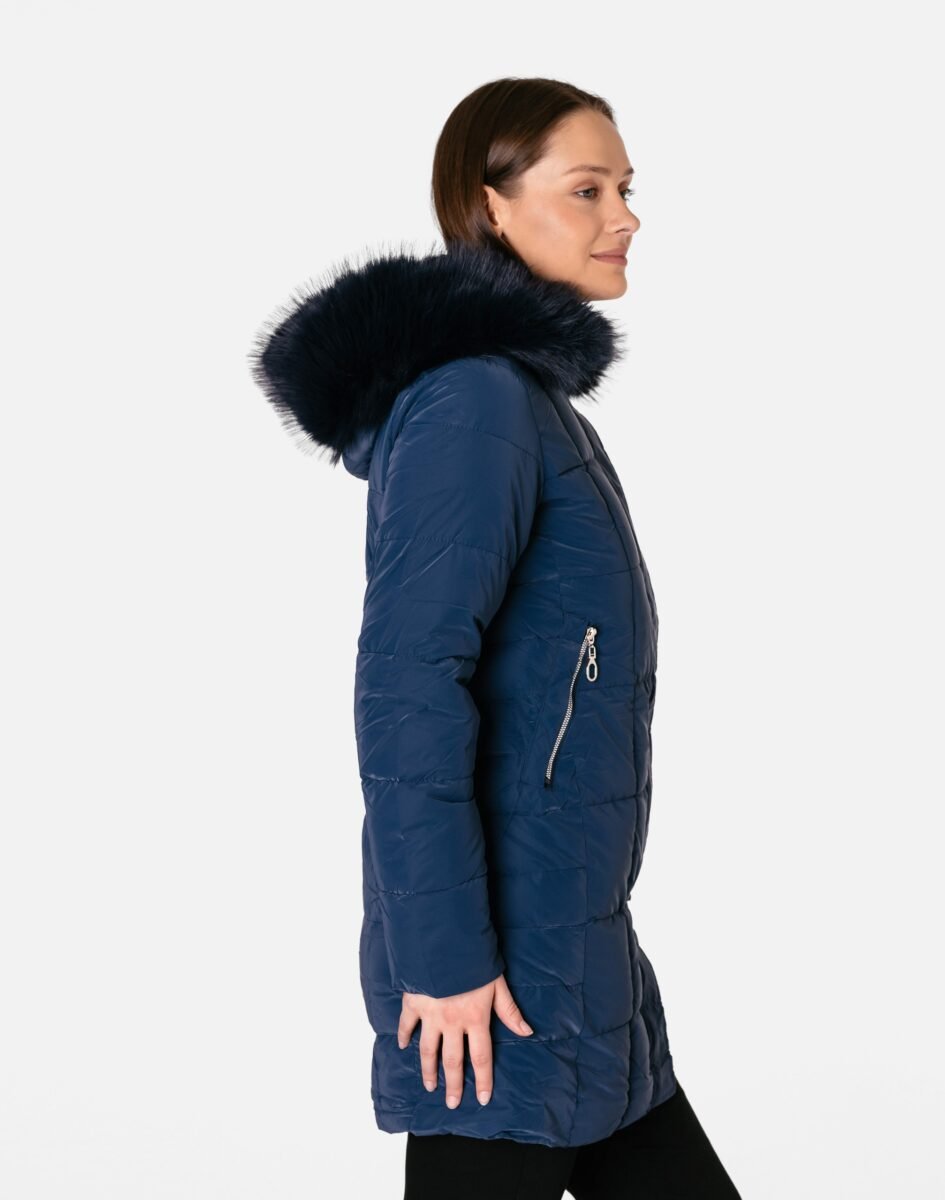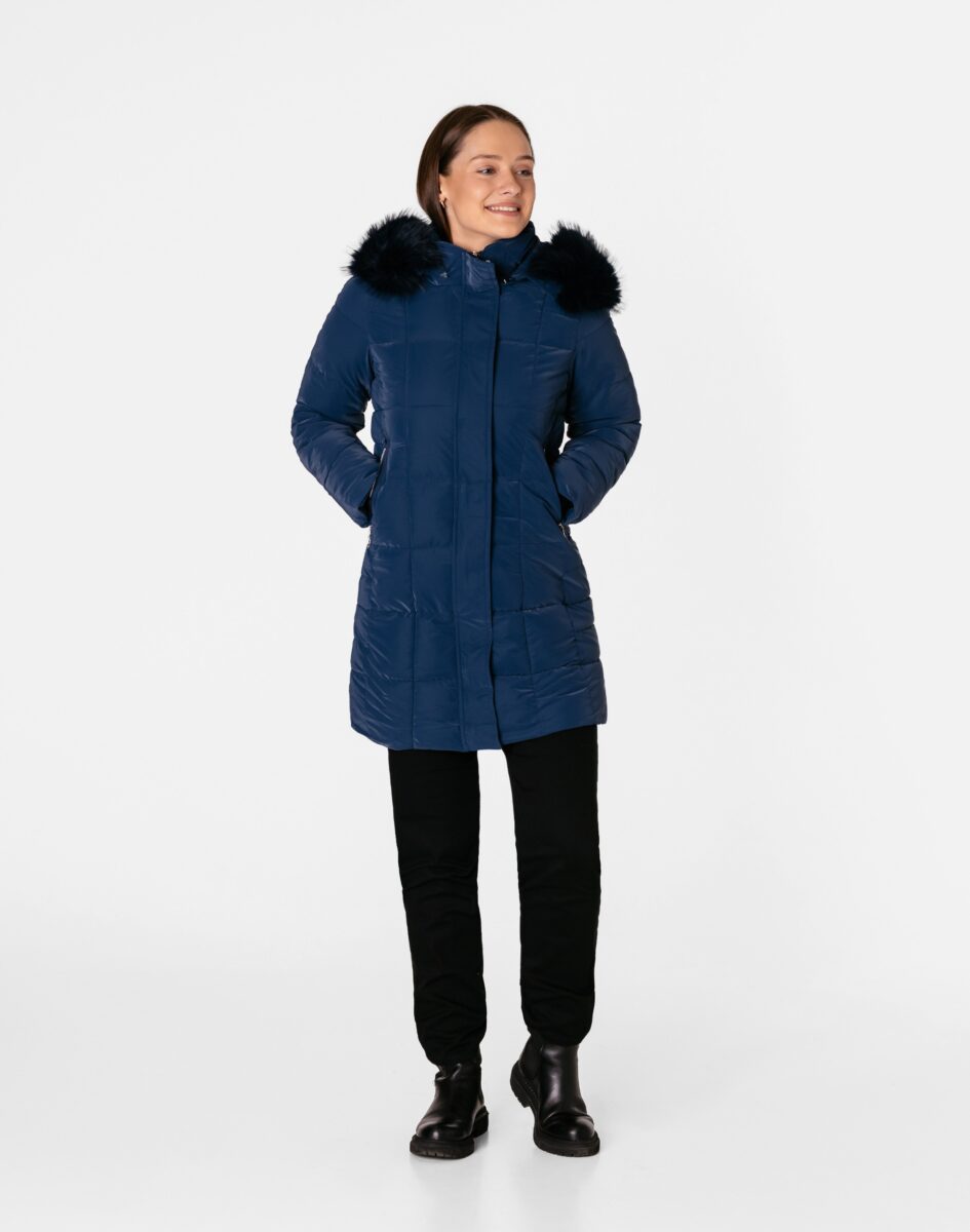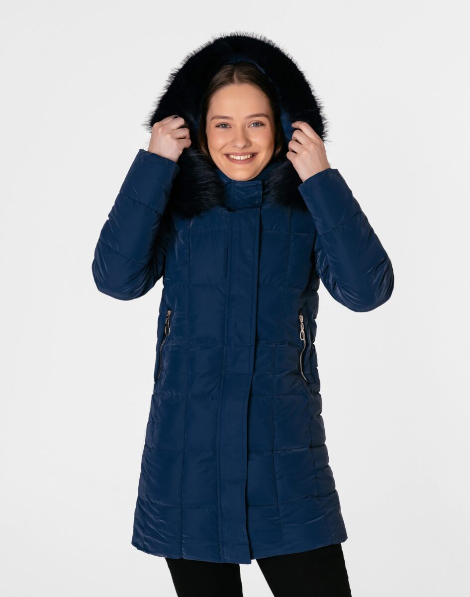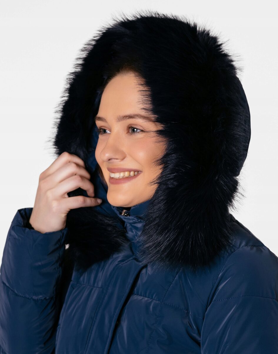 Ciepła zimowa kurtka damska typu Alaska ocieplona w całości puchem syntetycznym, z praktycznym ocieplonym i odpinanym na zamek kapturem ozdobionym puszystym futerkiem. Modnie pikowana (aby w powstałych „kieszonkach” zmieścić jak najwięcej grzejącego surowca) i zasuwana w całości na zamek błyskawiczny kryty plisą zapinaną na napy. Materiał na zewnątrz jest wiatroszczelny i posiada wykończenie typu Water Repellency, które zapobiega nasączeniu warstwy zewnętrznej wodą. Na bokach kurtki znajdują się dwie wpuszczane kieszenie na dłonie zasuwane na zamki błyskawiczne. Wysoki, ocieplony kołnierz/stójka, zasłania szyję i chroni gardło, a często zastępuje nawet szalik co jest bardzo wygodne i skutecznie chroni przed zimnem i wiatrem. Praktyczny ocieplony puchem syntetycznym i odpinany na zamek kaptur, ozdobiony odpinanym sztucznym futerkiem osłoni Twoją głowę przed deszczem, wiatrem i chłodem. Wewnętrzna strona kurtki wykończona jest materiałową podszewką. Długość do połowy uda, która świetnie podkreśli elegancję i kobiecość w twoim wyglądzie, trzyma ciepło i przytulność przy mroźnej pogodzie, nie krępuje ruchów i z powodzeniem zakrywa części ciała wrażliwe na chłód jak plecy na wysokości nerek i pośladki. Modny krój pikowanych paneli i doskonale wyprofilowana konstrukcja prezentowana obecnie szeroko na modowych blogach.