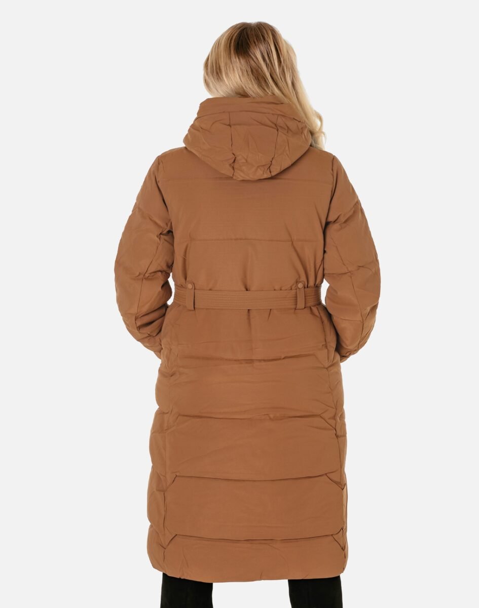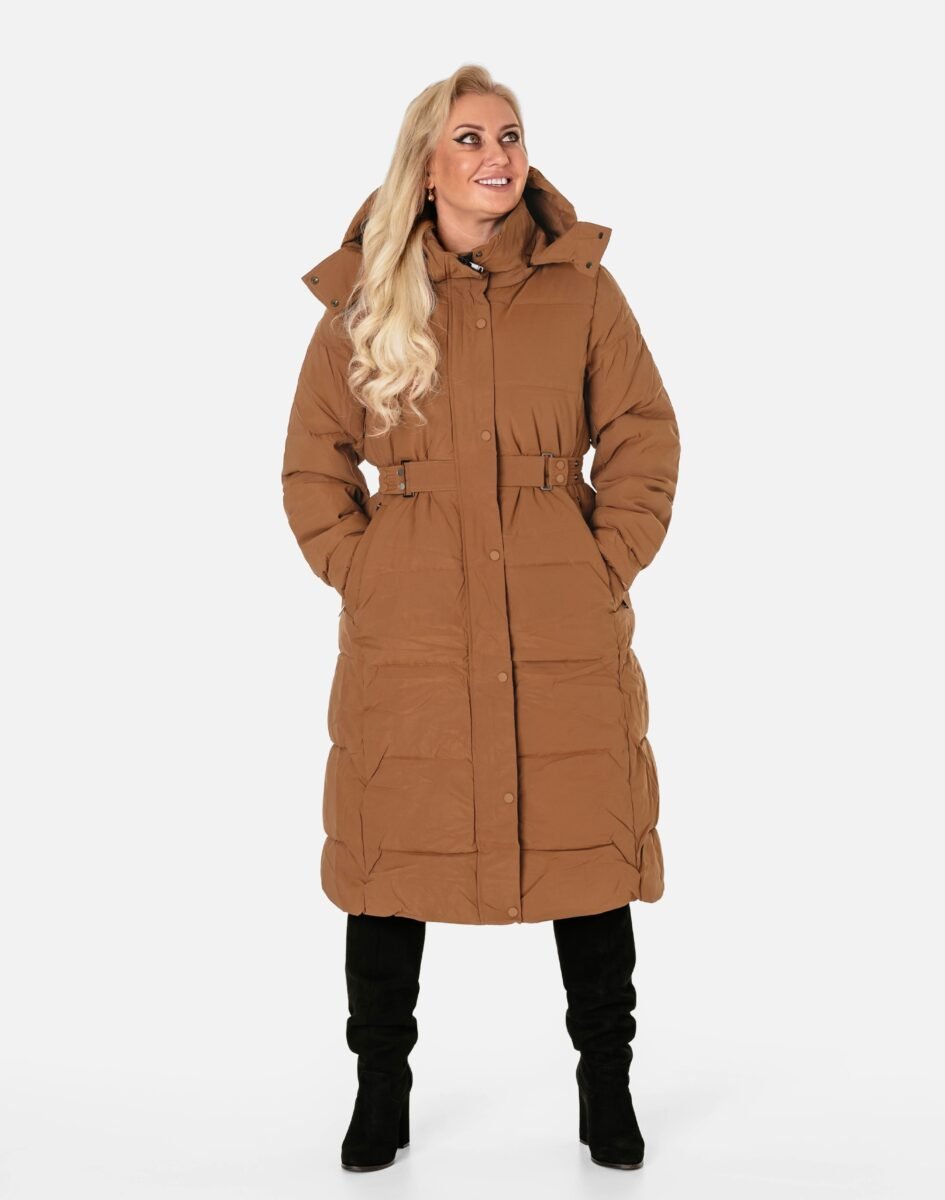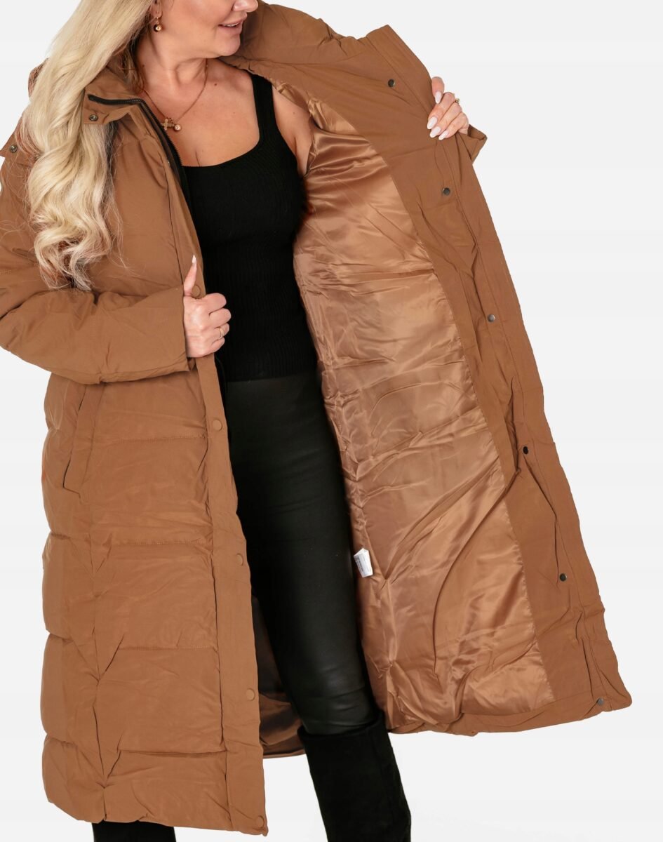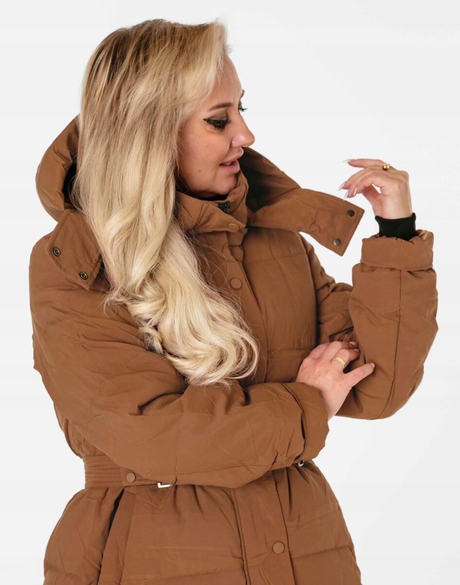 Wyjątkowo ciepły bo ocieplony w całości puchem syntetycznym długi puchowy płaszczyk damskiz praktycznym ocieplonym kapturem, to doskonałe i ponadczasowe okrycie wierzchnie na sezon przejściowy i zimowy. Modnie pikowany (aby w powstałych „kieszonkach” zmieścić jak najwięcej grzejącego surowca) i zasuwany w całości na kryty plisą zapinaną na metalowe napy dwukierunkowy zamek błyskawiczny wraz z wysokim kołnierzem-stójką. Płaszczyk posiada dwie duże wpuszczane kieszenie na dłonie zasuwane na zamki błyskawiczne oraz wysoki, ocieplony kołnierz/stójkę, który skutecznie zasłania szyję i chroni gardło, a często zastępuje nawet szalik co jest bardzo wygodne i skutecznie chroni przed zimnem i wiatrem. Praktyczny odpinany na zamek i ocieplony puchem syntetycznym kaptur, osłoni Twoją głowę przed deszczem, wiatrem i chłodem. Materiał zewnętrzny jest wiatroszczelny i posiada wykończenie typu Water Repellency, które zapobiega nasączeniu warstwy zewnętrznej wodą. Wewnętrzna strona kurtki wykończona jest techniczną materiałową podszewką. Elastyczne wiatrołapy wszyte w rękawach skutecznie zapobiegają utracie ciepła i chronią przed podmuchami zimnego wiatru. Regulowany na metalowe napy szeroki pasek pozwala na indywidualne dopasowanie do ciała i zgrabnie modeluje sylwetkę w talii nadając jej właściwe proporcje. Długość za kolano, która świetnie podkreśli elegancję i kobiecość w twoim wyglądzie, trzyma ciepło i przytulność przy mroźnej pogodzie, nie krępuje ruchów i z powodzeniem zakrywa części ciała wrażliwe na chłód jak plecy na wysokości nerek, pośladki i uda. Modny krój pikowanych paneli i doskonale wyprofilowana konstrukcja prezentowana obecnie szeroko na modowych blogach.