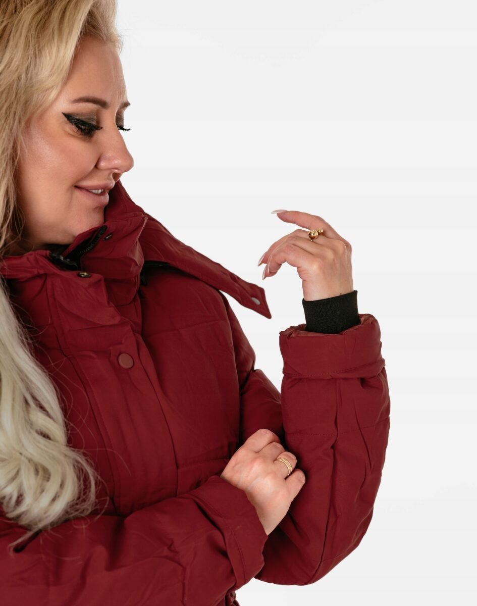 - Fason: puchowy, jednorzędowy z kapturem