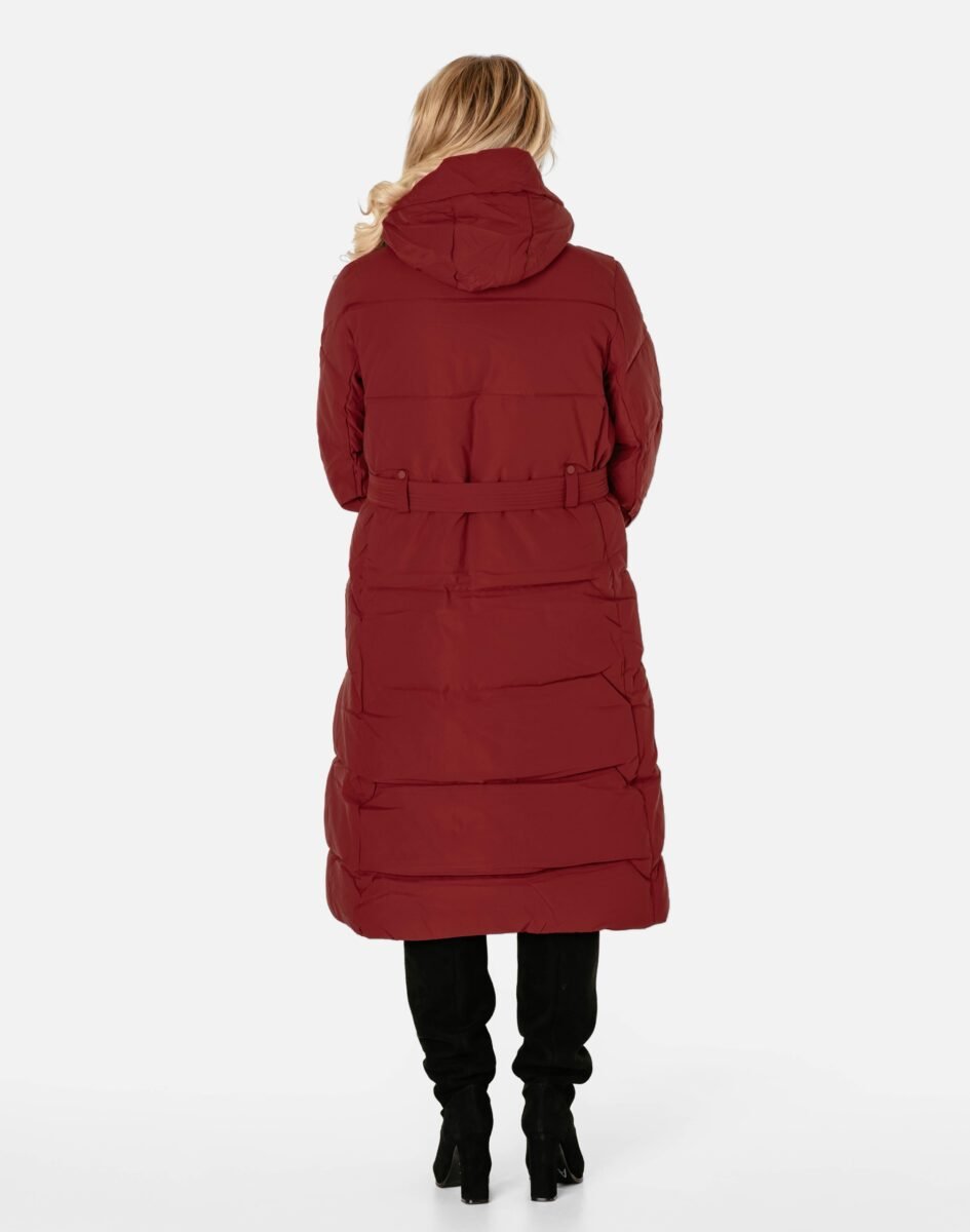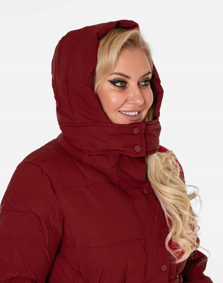 Wyjątkowo ciepły bo ocieplony w całości puchem syntetycznym długi puchowy płaszczyk damskiz praktycznym ocieplonym kapturem, to doskonałe i ponadczasowe okrycie wierzchnie na sezon przejściowy i zimowy. Modnie pikowany (aby w powstałych „kieszonkach” zmieścić jak najwięcej grzejącego surowca) i zasuwany w całości na kryty plisą zapinaną na metalowe napy dwukierunkowy zamek błyskawiczny wraz z wysokim kołnierzem-stójką. Płaszczyk posiada dwie duże wpuszczane kieszenie na dłonie zasuwane na zamki błyskawiczne oraz wysoki, ocieplony kołnierz/stójkę, który skutecznie zasłania szyję i chroni gardło, a często zastępuje nawet szalik co jest bardzo wygodne i skutecznie chroni przed zimnem i wiatrem. Praktyczny odpinany na zamek i ocieplony puchem syntetycznym kaptur, osłoni Twoją głowę przed deszczem, wiatrem i chłodem. Materiał zewnętrzny jest wiatroszczelny i posiada wykończenie typu Water Repellency, które zapobiega nasączeniu warstwy zewnętrznej wodą. Wewnętrzna strona kurtki wykończona jest techniczną materiałową podszewką. Elastyczne wiatrołapy wszyte w rękawach skutecznie zapobiegają utracie ciepła i chronią przed podmuchami zimnego wiatru. Regulowany na metalowe napy szeroki pasek pozwala na indywidualne dopasowanie do ciała i zgrabnie modeluje sylwetkę w talii nadając jej właściwe proporcje. Długość za kolano, która świetnie podkreśli elegancję i kobiecość w twoim wyglądzie, trzyma ciepło i przytulność przy mroźnej pogodzie, nie krępuje ruchów i z powodzeniem zakrywa części ciała wrażliwe na chłód jak plecy na wysokości nerek, pośladki i uda. Modny krój pikowanych paneli i doskonale wyprofilowana konstrukcja prezentowana obecnie szeroko na modowych blogach.