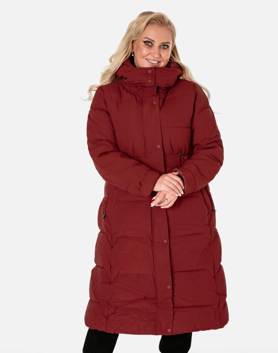 Wyjątkowo ciepły bo ocieplony w całości puchem syntetycznym długi puchowy płaszczyk damskiz praktycznym ocieplonym kapturem, to doskonałe i ponadczasowe okrycie wierzchnie na sezon przejściowy i zimowy. Modnie pikowany (aby w powstałych „kieszonkach” zmieścić jak najwięcej grzejącego surowca) i zasuwany w całości na kryty plisą zapinaną na metalowe napy dwukierunkowy zamek błyskawiczny wraz z wysokim kołnierzem-stójką. Płaszczyk posiada dwie duże wpuszczane kieszenie na dłonie zasuwane na zamki błyskawiczne oraz wysoki, ocieplony kołnierz/stójkę, który skutecznie zasłania szyję i chroni gardło, a często zastępuje nawet szalik co jest bardzo wygodne i skutecznie chroni przed zimnem i wiatrem. Praktyczny odpinany na zamek i ocieplony puchem syntetycznym kaptur, osłoni Twoją głowę przed deszczem, wiatrem i chłodem. Materiał zewnętrzny jest wiatroszczelny i posiada wykończenie typu Water Repellency, które zapobiega nasączeniu warstwy zewnętrznej wodą. Wewnętrzna strona kurtki wykończona jest techniczną materiałową podszewką. Elastyczne wiatrołapy wszyte w rękawach skutecznie zapobiegają utracie ciepła i chronią przed podmuchami zimnego wiatru. Regulowany na metalowe napy szeroki pasek pozwala na indywidualne dopasowanie do ciała i zgrabnie modeluje sylwetkę w talii nadając jej właściwe proporcje. Długość za kolano, która świetnie podkreśli elegancję i kobiecość w twoim wyglądzie, trzyma ciepło i przytulność przy mroźnej pogodzie, nie krępuje ruchów i z powodzeniem zakrywa części ciała wrażliwe na chłód jak plecy na wysokości nerek, pośladki i uda. Modny krój pikowanych paneli i doskonale wyprofilowana konstrukcja prezentowana obecnie szeroko na modowych blogach.