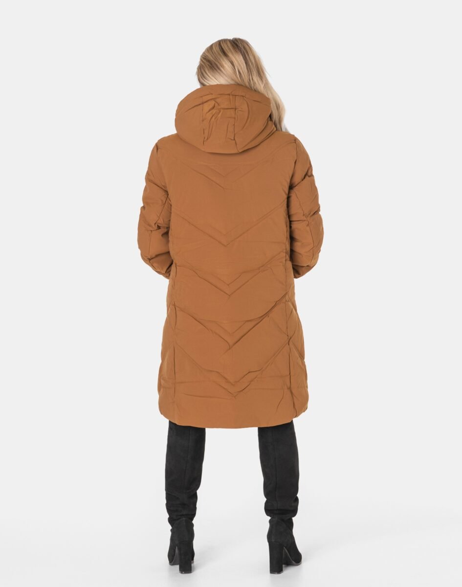 Wyjątkowo ciepły bo ocieplony w całości puchem syntetycznym długi puchowy płaszczyk damskiz praktycznym ocieplonym kapturem, to doskonałe i ponadczasowe okrycie wierzchnie na sezon przejściowy i zimowy. Modnie pikowany (aby w powstałych „kieszonkach” zmieścić jak najwięcej grzejącego surowca) i zasuwany w całości na kryty plisą zapinaną na metalowe napy dwukierunkowy zamek błyskawiczny wraz z wysokim kołnierzem-stójką. Płaszczyk posiada dwie duże wpuszczane kieszenie na dłonie oraz wysoki, ocieplony kołnierz/stójkę, który skutecznie zasłania szyję i chroni gardło, a często zastępuje nawet szalik co jest bardzo wygodne i skutecznie chroni przed zimnem i wiatrem. Praktyczny regulowany w 3D ściągaczem i stoperem ocieplony puchem syntetycznym kaptur, osłoni Twoją głowę przed deszczem, wiatrem i chłodem. Materiał zewnętrzny jest wiatroszczelny i posiada wykończenie typu Water Repellency, które zapobiega nasączeniu warstwy zewnętrznej wodą. Wewnętrzna strona kurtki wykończona jest techniczną materiałową podszewką. Elastyczne wiatrołapy wszyte w rękawach skutecznie zapobiegają utracie ciepła i chronią przed podmuchami zimnego wiatru. Długość za kolano, która świetnie podkreśli elegancję i kobiecość w twoim wyglądzie, trzyma ciepło i przytulność przy mroźnej pogodzie, nie krępuje ruchów i z powodzeniem zakrywa części ciała wrażliwe na chłód jak plecy na wysokości nerek, pośladki i uda. Modny krój pikowanych paneli i doskonale wyprofilowana konstrukcja prezentowana obecnie szeroko na modowych blogach.