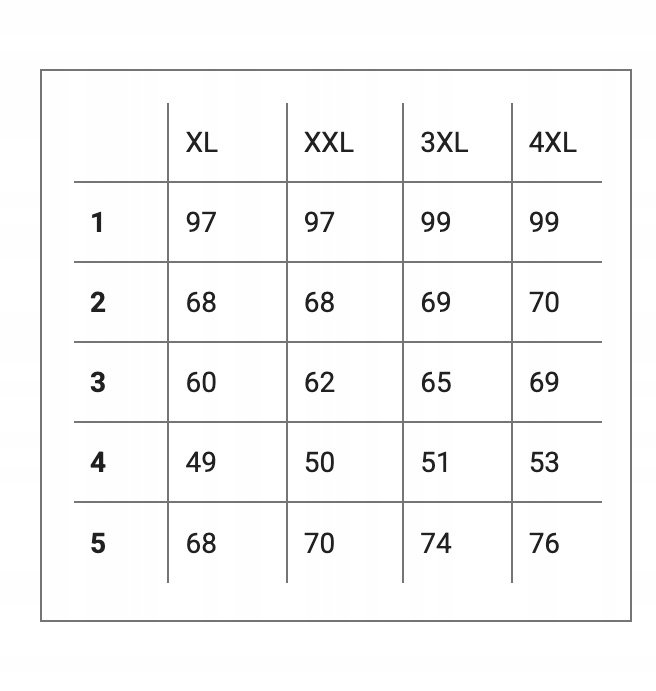 Proszę nie sugerować się rozmiarem podanym na metce przez producenta (np: XL, XXL czy 4XL itp.) ponieważ różne firmy stosują bardzo różne oznaczenia rozmiaru na co my jako sprzedawcy na Allegro nie mamy żadnego wpływu. Najlepiej jest zmierzyć się dokładnie centymetrem a następnie porównać swoje wymiary z tabelą wymiarów podaną przez nas na aukcji i wybrać odpowiedni rozmiar.