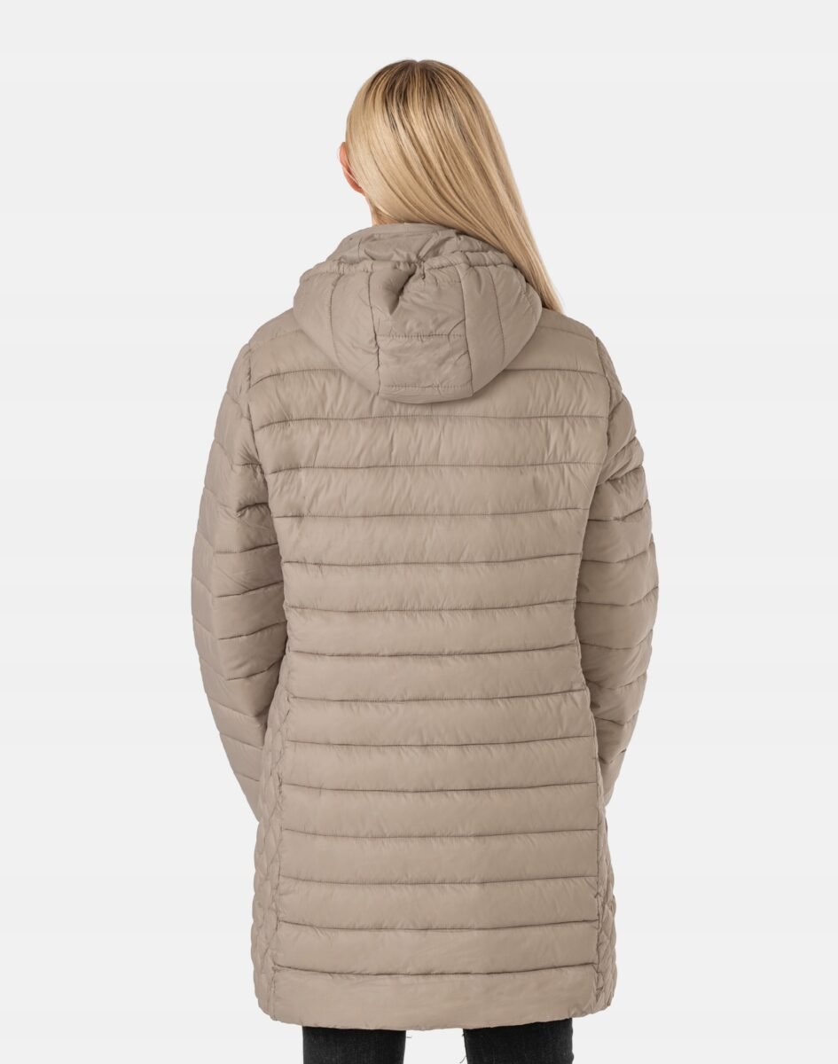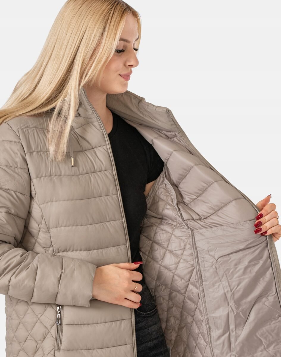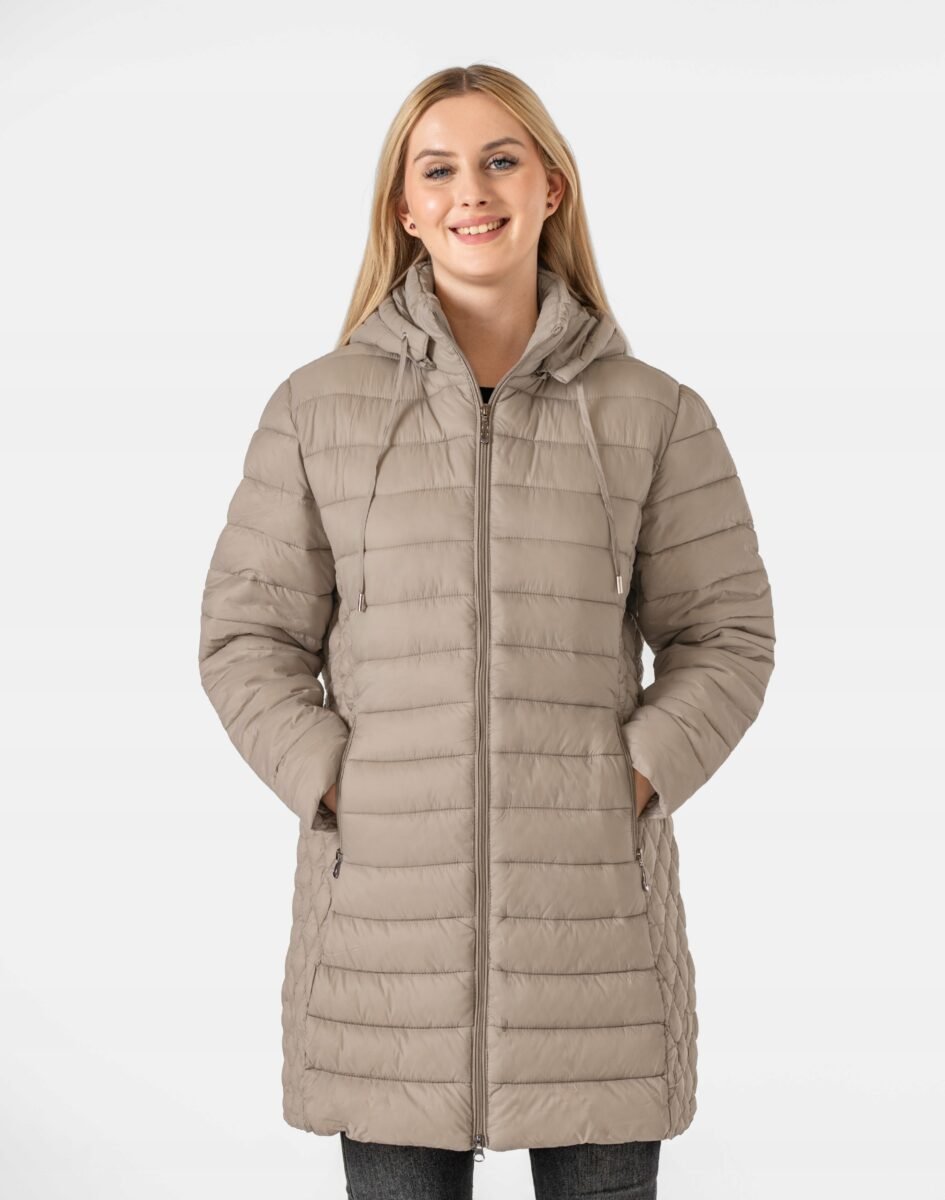 Wyjątkowo ciepły bo ocieplony w całości puchem syntetycznym długi puchowy płaszczyk damskiz praktycznym ocieplonym kapturem, to doskonałe i ponadczasowe okrycie wierzchnie na sezon przejściowy i zimowy. Modnie pikowany (aby w powstałych „kieszonkach” zmieścić jak najwięcej grzejącego surowca) i zasuwany w całości na dwukierunkowy zamek błyskawiczny wraz z wysokim kołnierzem-stójką. Płaszczyk posiada dwie duże wpuszczane kieszenie na dłonie zasuwane na zamki błyskawiczne oraz wysoki, ocieplony kołnierz/stójkę, który skutecznie zasłania szyję i chroni gardło, a często zastępuje nawet szalik co jest bardzo wygodne i skutecznie chroni przed zimnem i wiatrem. Praktyczny, odpinany na zamek, regulowany w 3D taśmą i ocieplony puchem syntetycznym kaptur, osłoni Twoją głowę przed deszczem, wiatrem i chłodem. Materiał zewnętrzny jest wiatroszczelny i posiada wykończenie typu Water Repellency, które zapobiega nasączeniu warstwy zewnętrznej wodą. Wewnętrzna strona płaszcza wykończona jest techniczną materiałową podszewką. Elastyczne wiatrołapy wszyte w rękawach skutecznie zapobiegają utracie ciepła i chronią przed podmuchami zimnego wiatru. Długość do połowy uda, która świetnie podkreśli elegancję i kobiecość w twoim wyglądzie, trzyma ciepło i przytulność przy mroźnej pogodzie, nie krępuje ruchów i z powodzeniem zakrywa części ciała wrażliwe na chłód jak plecy na wysokości nerek, pośladki i uda. Modny krój pikowanych paneli i doskonale wyprofilowana konstrukcja prezentowana obecnie szeroko na modowych blogach.