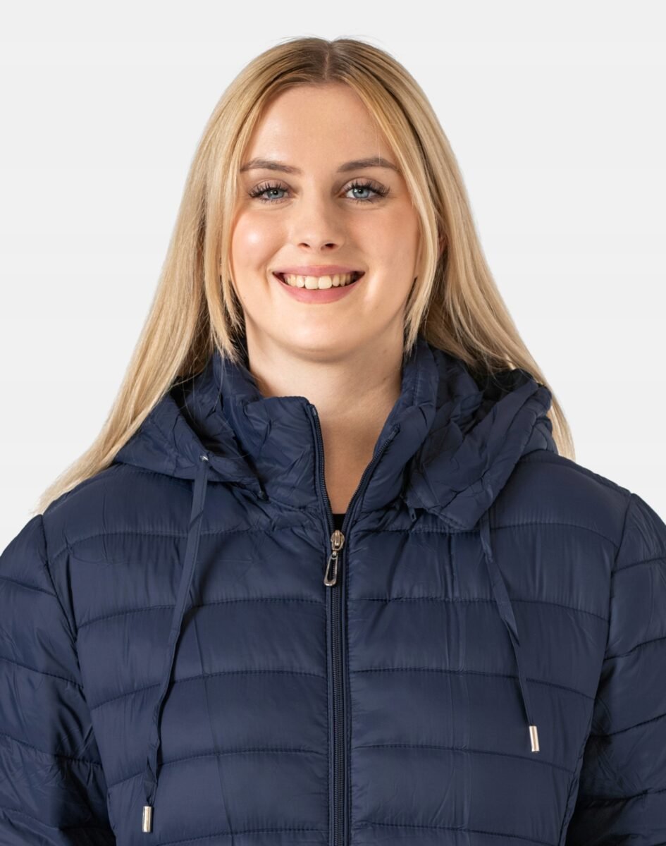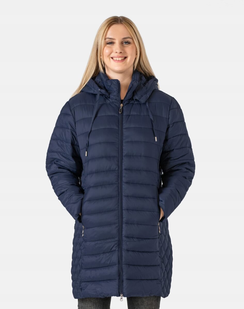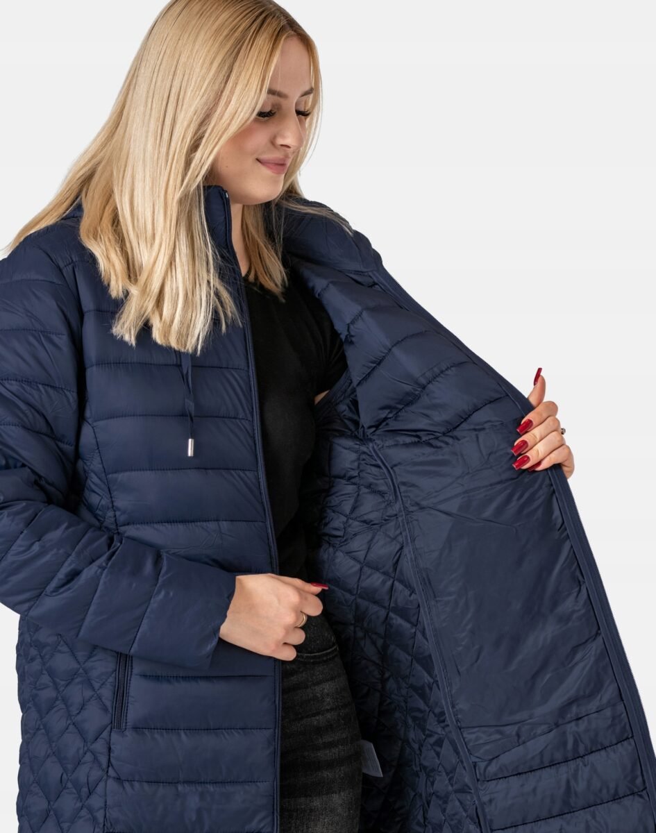 Wyjątkowo ciepły bo ocieplony w całości puchem syntetycznym długi puchowy płaszczyk damskiz praktycznym ocieplonym kapturem, to doskonałe i ponadczasowe okrycie wierzchnie na sezon przejściowy i zimowy. Modnie pikowany (aby w powstałych „kieszonkach” zmieścić jak najwięcej grzejącego surowca) i zasuwany w całości na dwukierunkowy zamek błyskawiczny wraz z wysokim kołnierzem-stójką. Płaszczyk posiada dwie duże wpuszczane kieszenie na dłonie zasuwane na zamki błyskawiczne oraz wysoki, ocieplony kołnierz/stójkę, który skutecznie zasłania szyję i chroni gardło, a często zastępuje nawet szalik co jest bardzo wygodne i skutecznie chroni przed zimnem i wiatrem. Praktyczny, odpinany na zamek, regulowany w 3D taśmą i ocieplony puchem syntetycznym kaptur, osłoni Twoją głowę przed deszczem, wiatrem i chłodem. Materiał zewnętrzny jest wiatroszczelny i posiada wykończenie typu Water Repellency, które zapobiega nasączeniu warstwy zewnętrznej wodą. Wewnętrzna strona płaszcza wykończona jest techniczną materiałową podszewką. Elastyczne wiatrołapy wszyte w rękawach skutecznie zapobiegają utracie ciepła i chronią przed podmuchami zimnego wiatru. Długość do połowy uda, która świetnie podkreśli elegancję i kobiecość w twoim wyglądzie, trzyma ciepło i przytulność przy mroźnej pogodzie, nie krępuje ruchów i z powodzeniem zakrywa części ciała wrażliwe na chłód jak plecy na wysokości nerek, pośladki i uda. Modny krój pikowanych paneli i doskonale wyprofilowana konstrukcja prezentowana obecnie szeroko na modowych blogach.