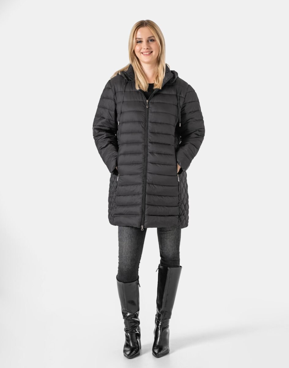 Wyjątkowo ciepły bo ocieplony w całości puchem syntetycznym długi puchowy płaszczyk damskiz praktycznym ocieplonym kapturem, to doskonałe i ponadczasowe okrycie wierzchnie na sezon przejściowy i zimowy. Modnie pikowany (aby w powstałych „kieszonkach” zmieścić jak najwięcej grzejącego surowca) i zasuwany w całości na dwukierunkowy zamek błyskawiczny wraz z wysokim kołnierzem-stójką. Płaszczyk posiada dwie duże wpuszczane kieszenie na dłonie zasuwane na zamki błyskawiczne oraz wysoki, ocieplony kołnierz/stójkę, który skutecznie zasłania szyję i chroni gardło, a często zastępuje nawet szalik co jest bardzo wygodne i skutecznie chroni przed zimnem i wiatrem. Praktyczny, odpinany na zamek, regulowany w 3D taśmą i ocieplony puchem syntetycznym kaptur, osłoni Twoją głowę przed deszczem, wiatrem i chłodem. Materiał zewnętrzny jest wiatroszczelny i posiada wykończenie typu Water Repellency, które zapobiega nasączeniu warstwy zewnętrznej wodą. Wewnętrzna strona płaszcza wykończona jest techniczną materiałową podszewką. Elastyczne wiatrołapy wszyte w rękawach skutecznie zapobiegają utracie ciepła i chronią przed podmuchami zimnego wiatru. Długość do połowy uda, która świetnie podkreśli elegancję i kobiecość w twoim wyglądzie, trzyma ciepło i przytulność przy mroźnej pogodzie, nie krępuje ruchów i z powodzeniem zakrywa części ciała wrażliwe na chłód jak plecy na wysokości nerek, pośladki i uda. Modny krój pikowanych paneli i doskonale wyprofilowana konstrukcja prezentowana obecnie szeroko na modowych blogach.