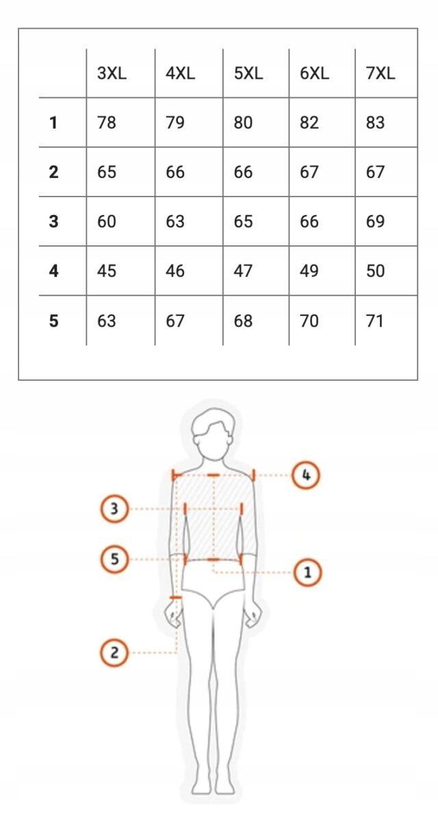 Proszę nie sugerować się rozmiarem podanym na metce przez producenta (np: 3XL, 4XL, 7XL itp.) ponieważ różne firmy stosują bardzo różne oznaczenia rozmiaru na co my jako sprzedawcy na Allegro nie mamy żadnego wpływu. Najlepiej jest zmierzyć się dokładnie centymetrem a następnie porównać swoje wymiary z tabelą wymiarów podaną przez nas na aukcji i wybrać odpowiedni rozmiar.