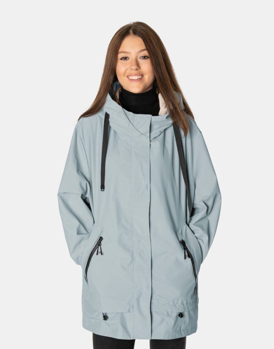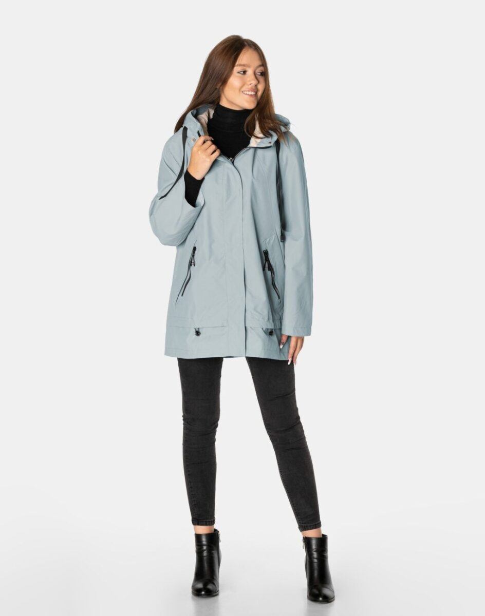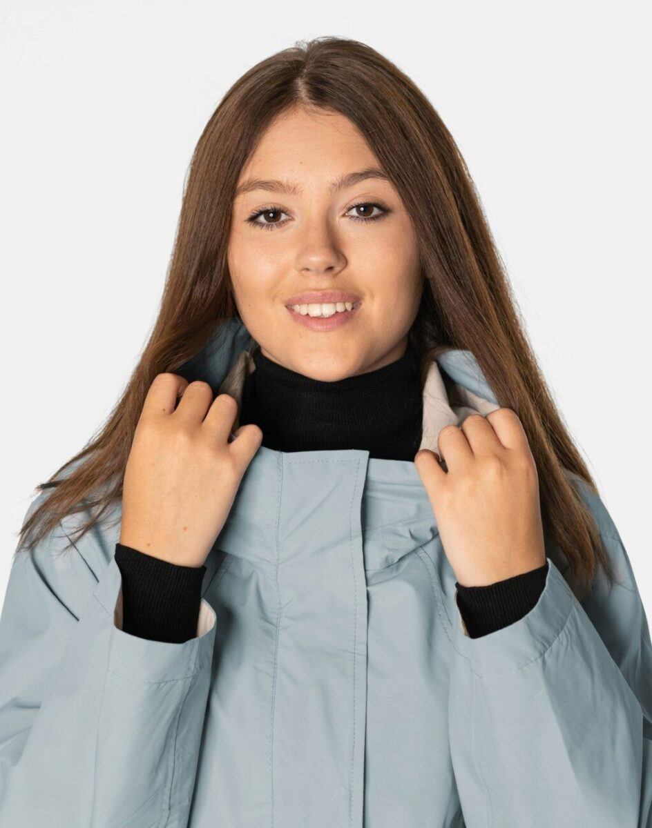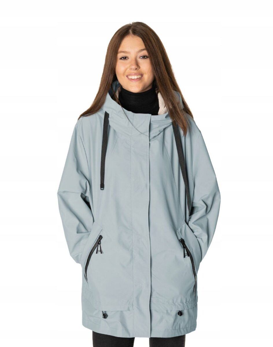 Kurtka jest wiatroszczelna, wodoodporna i zapinana w całości na zamek błyskawiczny kryty plisą zapinaną na napy. Zintegrowany z kołnierzem i regulowany taśmą ściągającą kaptur osłoni Twoją głowę przed deszczem, chłodem i wiatrem. Wysoki kołnierz typu stójka skutecznie chroni podbródek i szyję a często zastępuje nawet szalik co jest bardzo wygodne. Kurtka posiada dwie kieszenie przednie na dłonie oraz wewnętrzną kieszeń na portfel, dokumenty, telefon komórkowy MP3 itp. Ściągacze regulacyjne na dole kurtki oraz przy kapturze pozwalają na precyzyjne dopasowanie kurtki do ciała, co znacznie zapobiega utracie ciepła i skutecznie chroni przed podmuchami wiatru. Materiał zewnętrzny jest wiatroszczelny i wodoodporny zapewniając wygodę oraz komfort termiczny użytkowania nawet w mniej sprzyjających warunkach pogodowych. Wewnętrzna strona kurtki wykończona jest materiałową podszewką. Długość do połowy uda, która świetnie podkreśli elegancję i kobiecość w twoim wyglądzie, jak również trzyma ciepło i przytulność przy zmiennej pogodzie. Nie krępuje ruchów i z powodzeniem zakrywa części ciała wrażliwe na chłód jak plecy na wysokości nerek i pośladki.