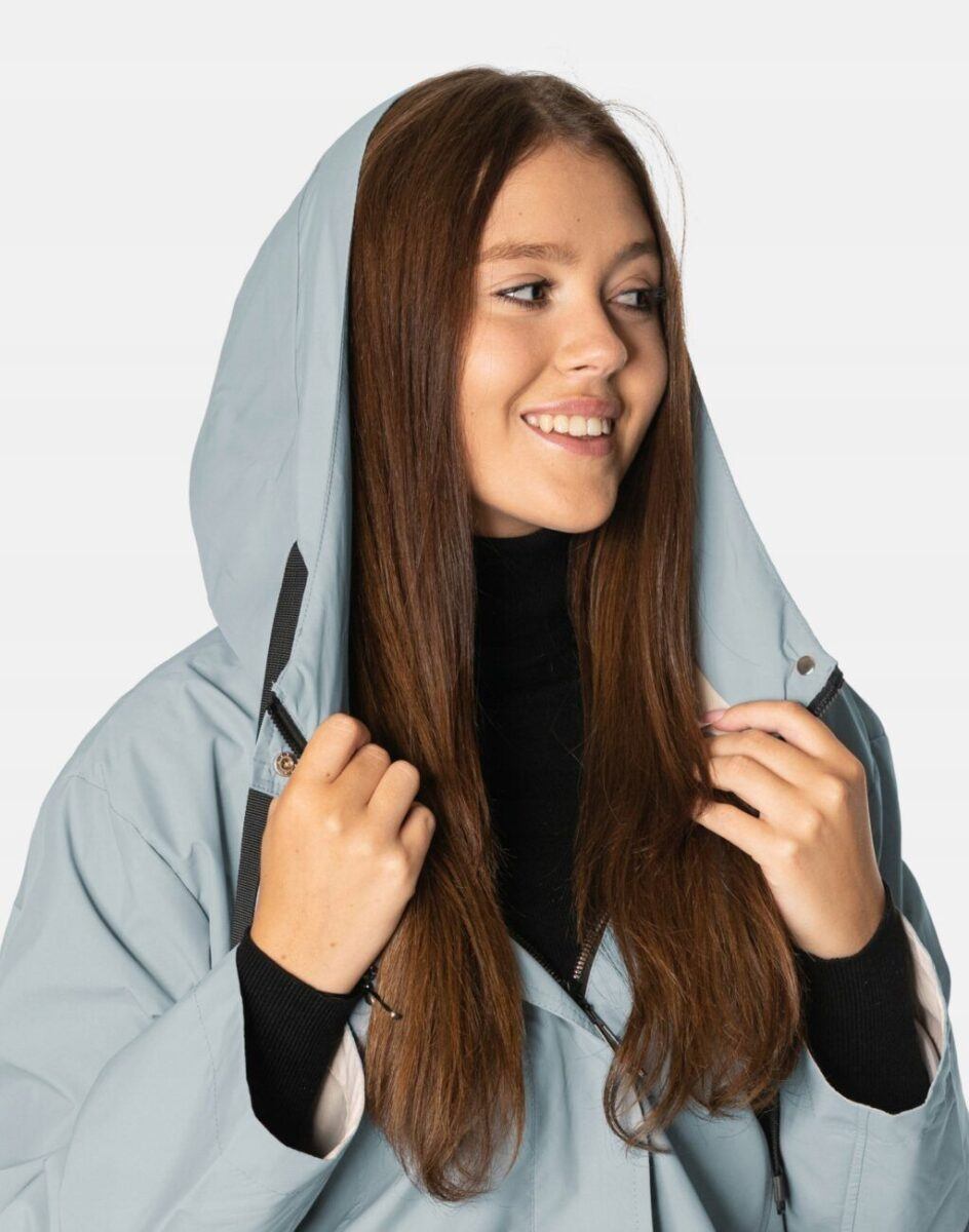- Kształt kołnierza: stojący, zintegrowany z kapturem