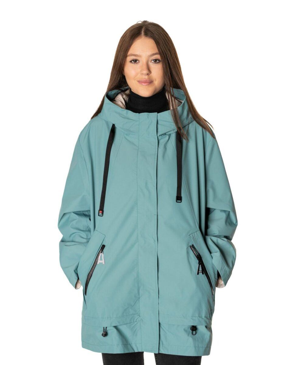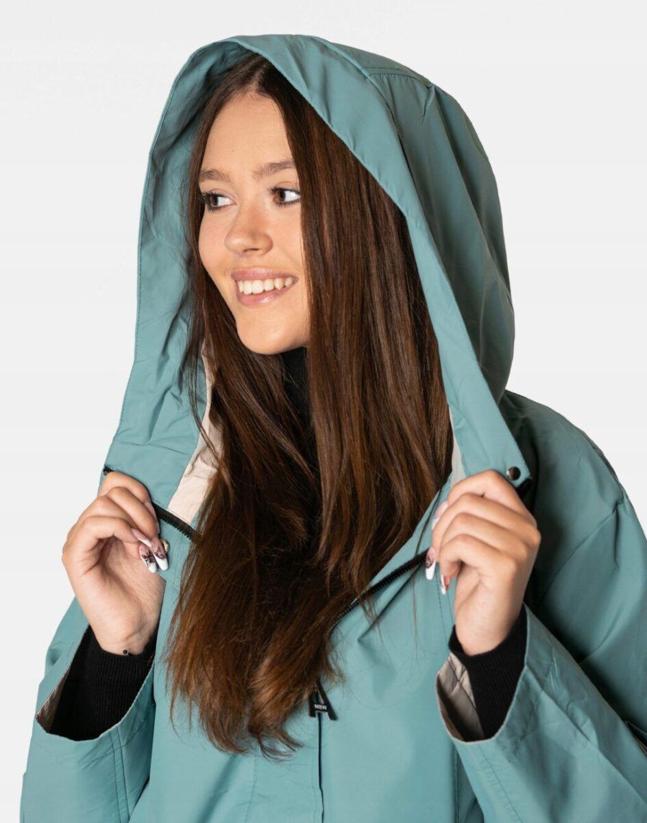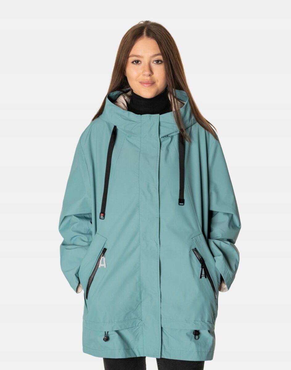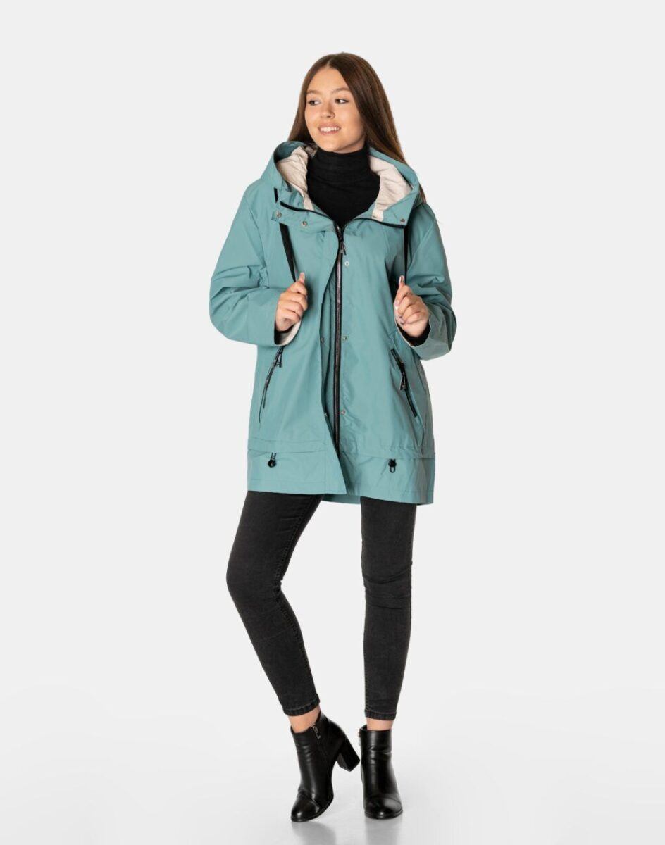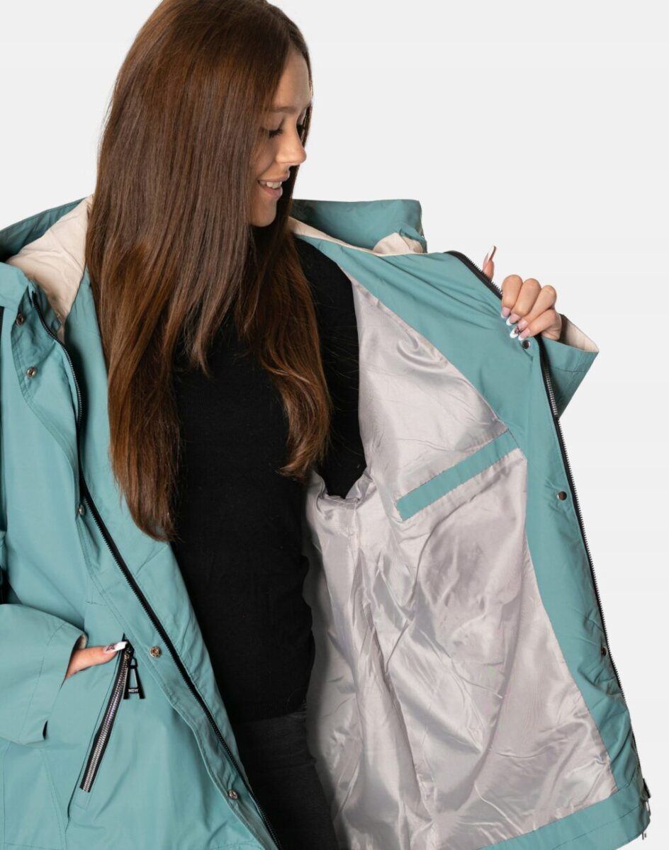 Kurtka jest wiatroszczelna, wodoodporna i zapinana w całości na zamek błyskawiczny kryty plisą zapinaną na napy. Zintegrowany z kołnierzem i regulowany taśmą ściągającą kaptur osłoni Twoją głowę przed deszczem, chłodem i wiatrem. Wysoki kołnierz typu stójka skutecznie chroni podbródek i szyję a często zastępuje nawet szalik co jest bardzo wygodne. Kurtka posiada dwie kieszenie przednie na dłonie oraz wewnętrzną kieszeń na portfel, dokumenty, telefon komórkowy MP3 itp. Ściągacze regulacyjne na dole kurtki oraz przy kapturze pozwalają na precyzyjne dopasowanie kurtki do ciała, co znacznie zapobiega utracie ciepła i skutecznie chroni przed podmuchami wiatru. Materiał zewnętrzny jest wiatroszczelny i wodoodporny zapewniając wygodę oraz komfort termiczny użytkowania nawet w mniej sprzyjających warunkach pogodowych. Wewnętrzna strona kurtki wykończona jest materiałową podszewką. Długość do połowy uda, która świetnie podkreśli elegancję i kobiecość w twoim wyglądzie, jak również trzyma ciepło i przytulność przy zmiennej pogodzie. Nie krępuje ruchów i z powodzeniem zakrywa części ciała wrażliwe na chłód jak plecy na wysokości nerek i pośladki.