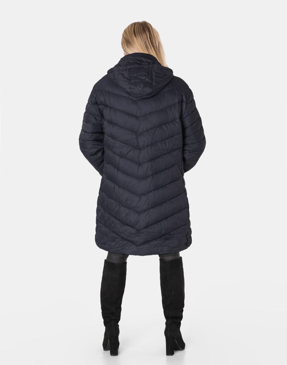 Wyjątkowo ciepły bo ocieplony w całości puchem syntetycznym długi puchowy płaszczyk damskiz praktycznym ocieplonym kapturem, to doskonałe i ponadczasowe okrycie wierzchnie na sezon przejściowy i zimowy. Modnie pikowany (aby w powstałych „kieszonkach” zmieścić jak najwięcej grzejącego surowca) i zasuwany w całości na dwukierunkowy zamek błyskawiczny wraz z wysokim kołnierzem-stójką. Płaszczyk posiada dwie duże wpuszczane kieszenie na dłonie zasuwane na zamki błyskawiczne oraz wysoki, ocieplony kołnierz/stójkę, który skutecznie zasłania szyję i chroni gardło, a często zastępuje nawet szalik co jest bardzo wygodne i skutecznie chroni przed zimnem i wiatrem. Praktyczny, odpinany na zamek, regulowany w 3D ściągaczem oraz stoperem i ocieplony puchem syntetycznym kaptur, osłoni Twoją głowę przed deszczem, wiatrem i chłodem. Materiał zewnętrzny jest wiatroszczelny i posiada wykończenie typu Water Repellency, które zapobiega nasączeniu warstwy zewnętrznej wodą. Wewnętrzna strona płaszcza wykończona jest techniczną materiałową podszewką. Elastyczne wiatrołapy wszyte w rękawach skutecznie zapobiegają utracie ciepła i chronią przed podmuchami zimnego wiatru. Długość za kolano, która świetnie podkreśli elegancję i kobiecość w twoim wyglądzie, trzyma ciepło i przytulność przy mroźnej pogodzie, nie krępuje ruchów i z powodzeniem zakrywa części ciała wrażliwe na chłód jak plecy na wysokości nerek, pośladki i uda. Modny krój pikowanych paneli i doskonale wyprofilowana konstrukcja prezentowana obecnie szeroko na modowych blogach.