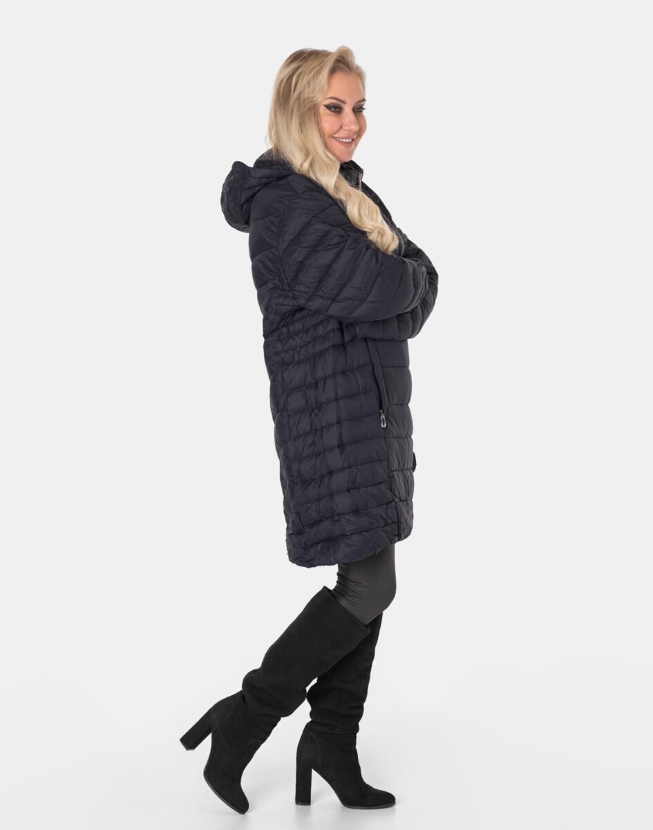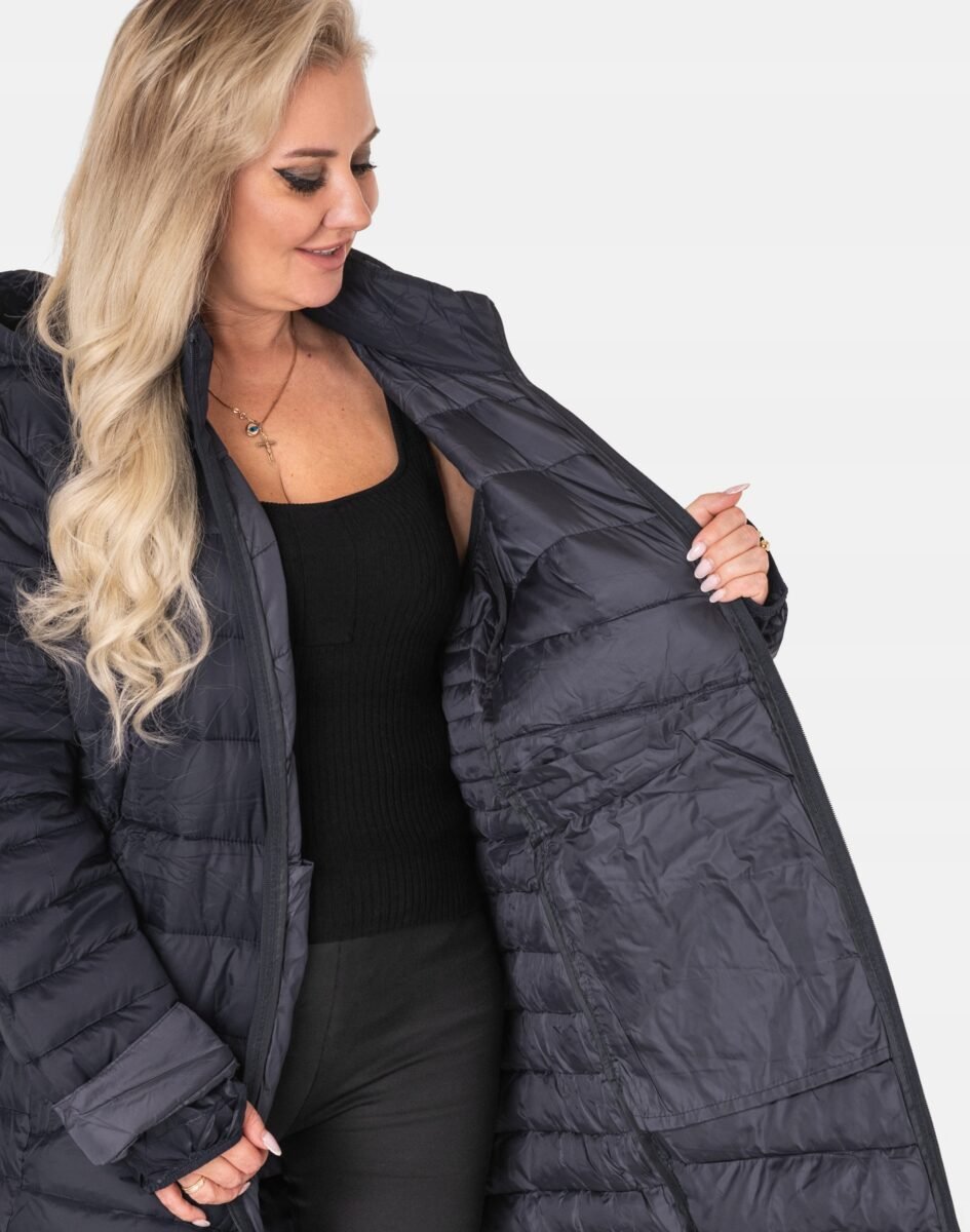 Wyjątkowo ciepły bo ocieplony w całości puchem syntetycznym długi puchowy płaszczyk damskiz praktycznym ocieplonym kapturem, to doskonałe i ponadczasowe okrycie wierzchnie na sezon przejściowy i zimowy. Modnie pikowany (aby w powstałych „kieszonkach” zmieścić jak najwięcej grzejącego surowca) i zasuwany w całości na dwukierunkowy zamek błyskawiczny wraz z wysokim kołnierzem-stójką. Płaszczyk posiada dwie duże wpuszczane kieszenie na dłonie zasuwane na zamki błyskawiczne oraz wysoki, ocieplony kołnierz/stójkę, który skutecznie zasłania szyję i chroni gardło, a często zastępuje nawet szalik co jest bardzo wygodne i skutecznie chroni przed zimnem i wiatrem. Praktyczny, odpinany na zamek, regulowany w 3D ściągaczem oraz stoperem i ocieplony puchem syntetycznym kaptur, osłoni Twoją głowę przed deszczem, wiatrem i chłodem. Materiał zewnętrzny jest wiatroszczelny i posiada wykończenie typu Water Repellency, które zapobiega nasączeniu warstwy zewnętrznej wodą. Wewnętrzna strona płaszcza wykończona jest techniczną materiałową podszewką. Elastyczne wiatrołapy wszyte w rękawach skutecznie zapobiegają utracie ciepła i chronią przed podmuchami zimnego wiatru. Długość za kolano, która świetnie podkreśli elegancję i kobiecość w twoim wyglądzie, trzyma ciepło i przytulność przy mroźnej pogodzie, nie krępuje ruchów i z powodzeniem zakrywa części ciała wrażliwe na chłód jak plecy na wysokości nerek, pośladki i uda. Modny krój pikowanych paneli i doskonale wyprofilowana konstrukcja prezentowana obecnie szeroko na modowych blogach.