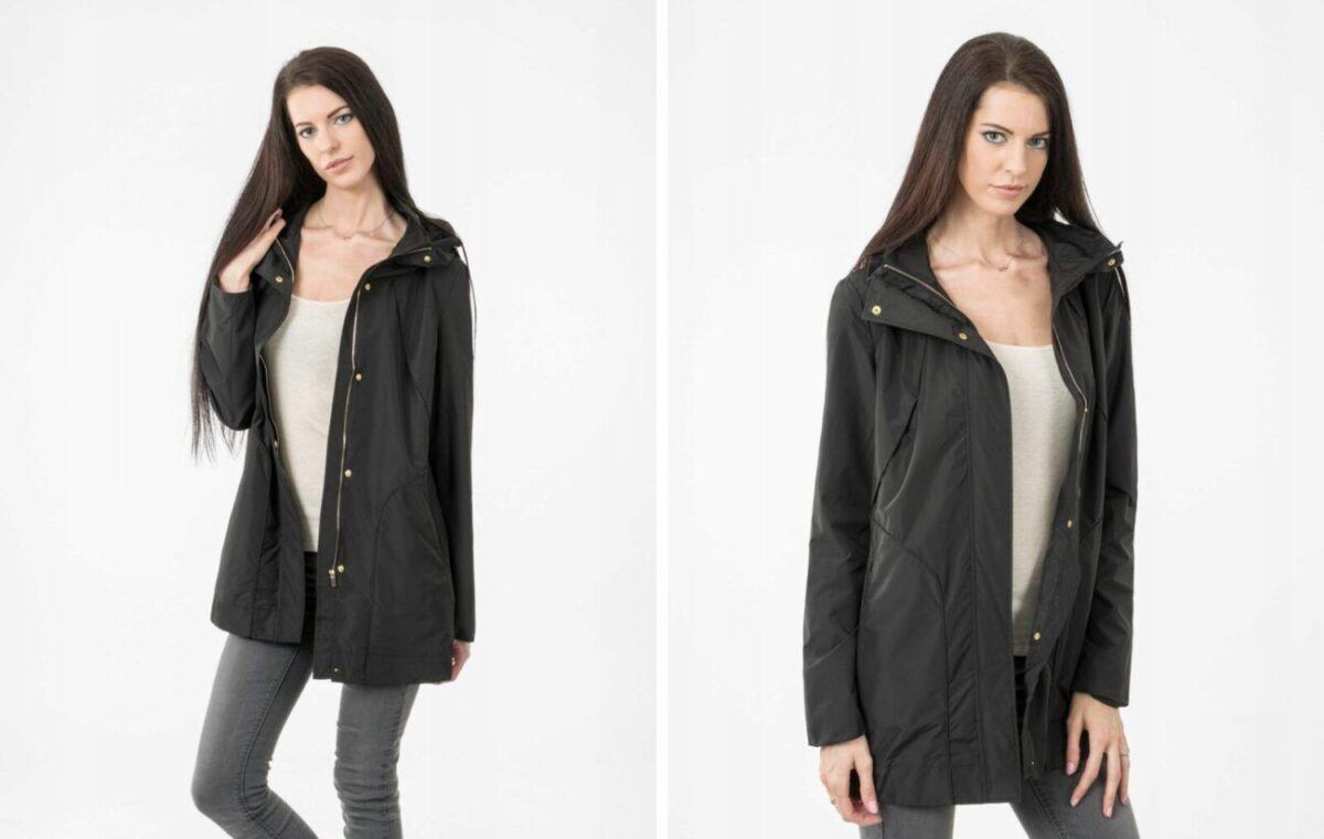 Elegancka kurtka przekonująca efektownym fasonem, szerokim kołnierzem stójką z chowanym wewnątrz kapturem. Kurtka jest zasuwana w całości na zamek błyskawiczny kryty elegancką plisą zapinaną dodatkowo na napy. Z przodu kurtki dwie kieszenie na dłonie zapinane na guzik. Posiada praktyczny, chowany w kołnierzu kaptur. Praktyczne zamki w szwach bocznych umożliwiają regulację i indywidualne dopasowanie szerokościw biodrach. Modny krój efektownie podkreślający kobiecą sylwetkę.