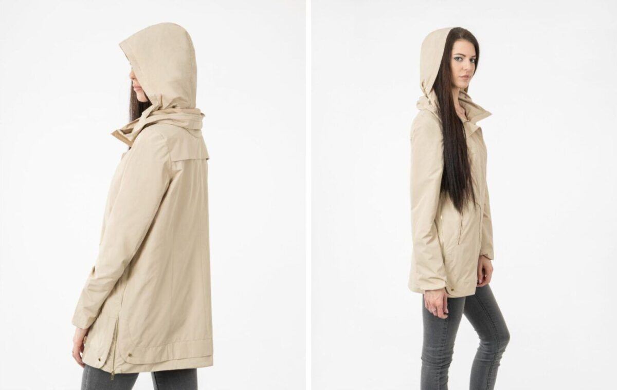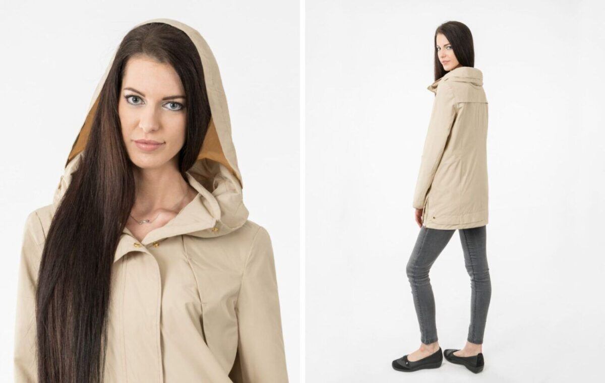 Elegancka kurtka przekonująca efektownym fasonem, szerokim kołnierzem stójką z chowanym wewnątrz kapturem. Kurtka jest zasuwana w całości na zamek błyskawiczny kryty elegancką plisą zapinaną dodatkowo na napy. Z przodu kurtki dwie kieszenie na dłonie zapinane na guzik. Posiada praktyczny, chowany w kołnierzu kaptur. Praktyczne zamki w szwach bocznych umożliwiają regulację i indywidualne dopasowanie szerokościw biodrach. Modny krój efektownie podkreślający kobiecą sylwetkę.