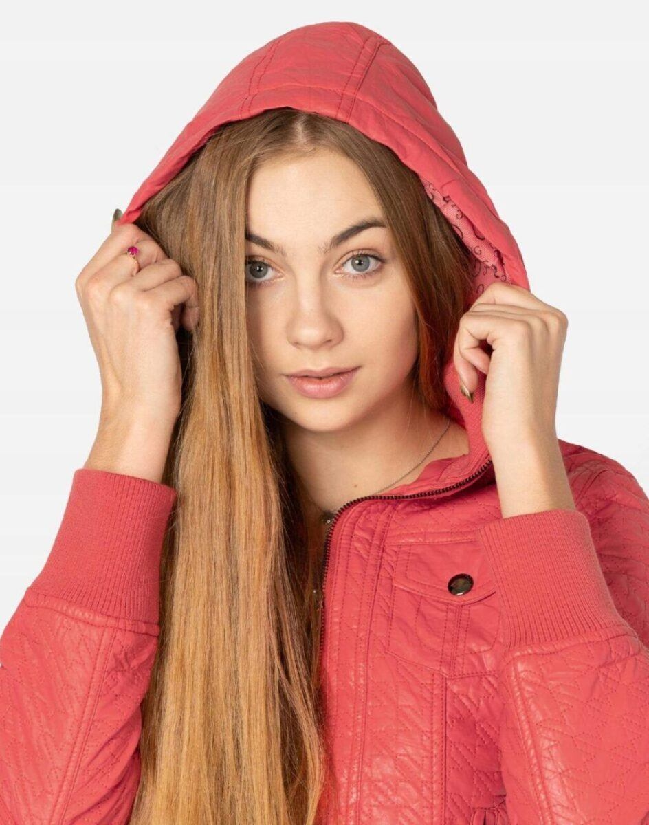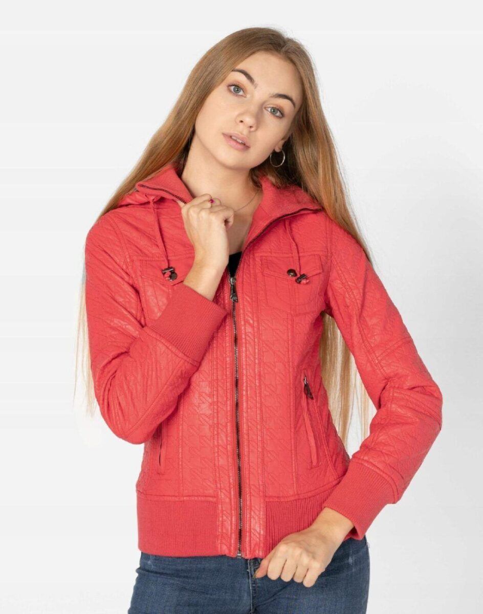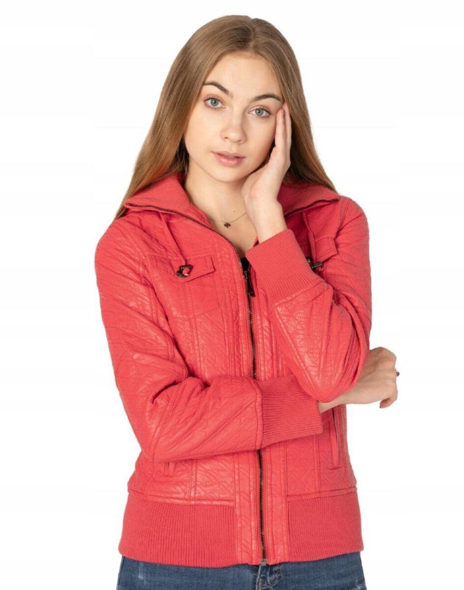 Kurtka jest lekko taliowana i zasuwana w całości na zamek błyskawiczny. Suwaki zasuwają również dwie kieszonki na dłonie na bokach kurtki. Na piersiach dwie małe kieszonki kryte patkami zapinanymi na ozdobne metaliczne napy. Wysoki kołnierz/stójka (z możliwością wyłożenia na boki) zasłania szyję i chroni gardło a często zastępuje nawet szalik co jest bardzo wygodne i skutecznie chroni przed zimnem i wiatrem. Praktyczny kaptur jest odpinany na zamek błyskawiczny i posiada możliwość regulacji wielkości i dopasowania za pomocą materiałowej tasiemki z metalowymi stoperami. Wewnętrzna strona kurtki wykończona jest materiałową podszewką. Wykonana z miękkiej, ozdobnie pikowanej skóry ekologicznej do złudzenia przypominającej prawdziwą skórę. Materiał zewnętrzny jest wiatroszczelny i wodoodporny zapewniając wygodę i komfort użytkowania nawet w mniej sprzyjających warunkach pogodowych. Talia zgrabnie podkreślona szerokim elastycznym ściągaczem efektownie podkreśla kobiecą sylwetkę. Całość tworzy najmodniejszy styl prezentowany obecnie szeroko na modowych blogach.