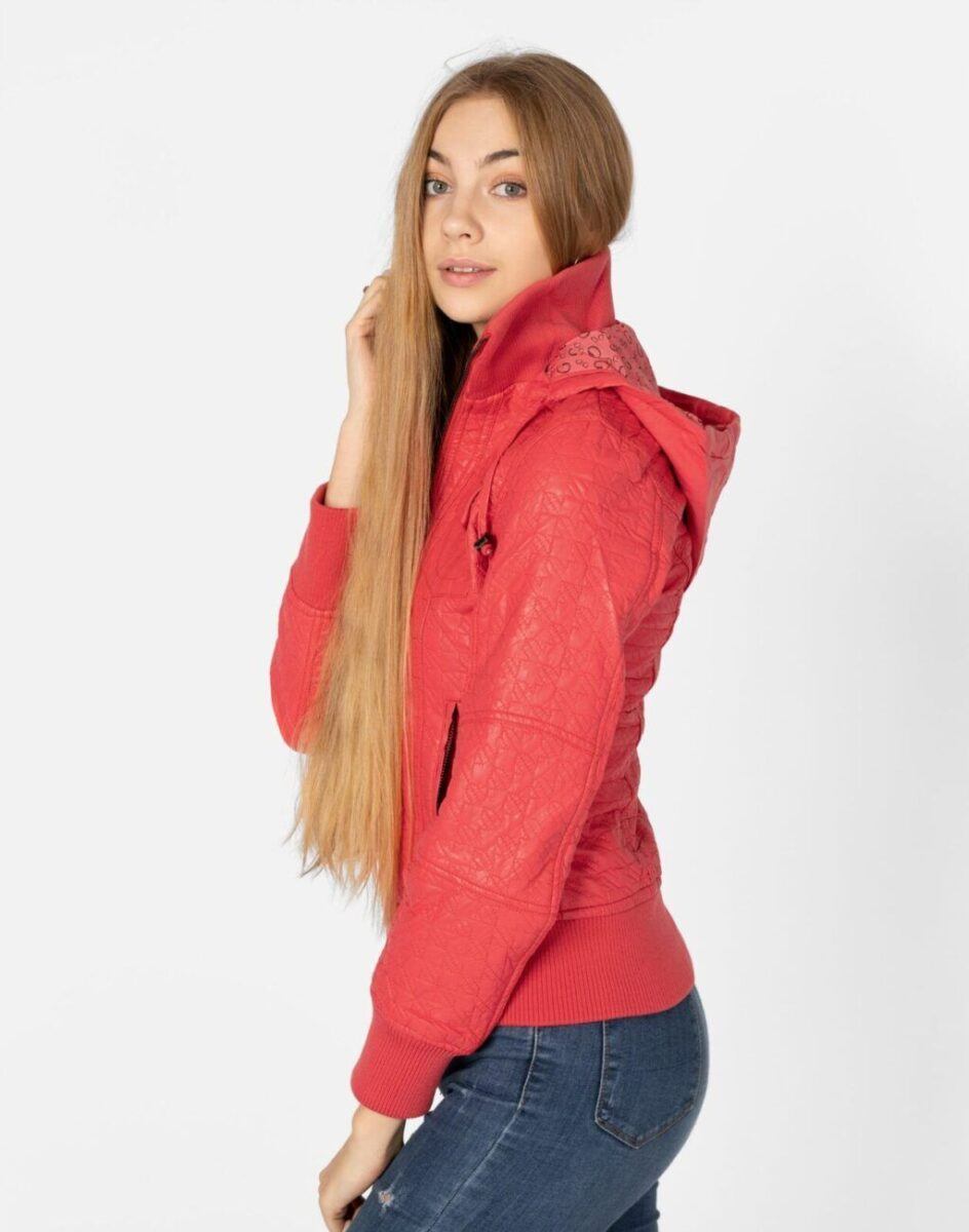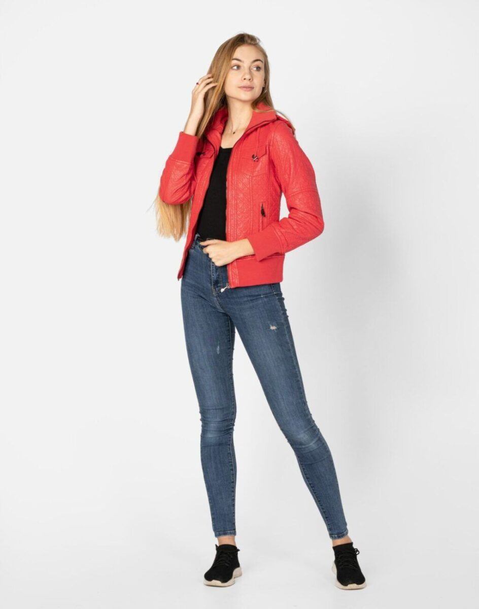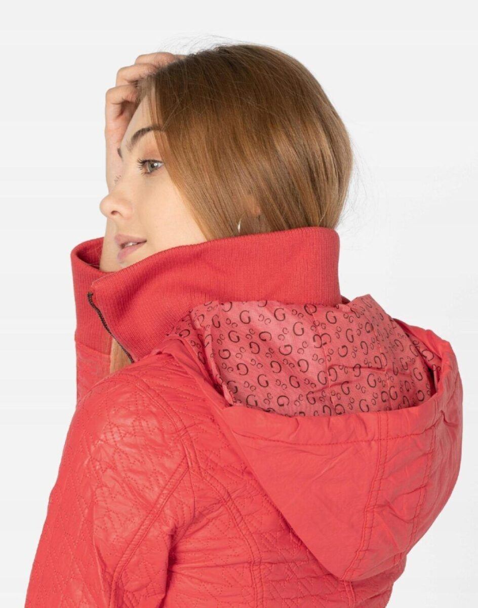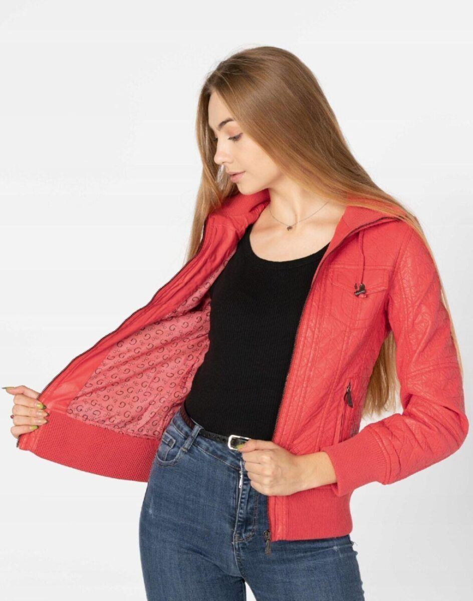 Kurtka jest lekko taliowana i zasuwana w całości na zamek błyskawiczny. Suwaki zasuwają również dwie kieszonki na dłonie na bokach kurtki. Na piersiach dwie małe kieszonki kryte patkami zapinanymi na ozdobne metaliczne napy. Wysoki kołnierz/stójka (z możliwością wyłożenia na boki) zasłania szyję i chroni gardło a często zastępuje nawet szalik co jest bardzo wygodne i skutecznie chroni przed zimnem i wiatrem. Praktyczny kaptur jest odpinany na zamek błyskawiczny i posiada możliwość regulacji wielkości i dopasowania za pomocą materiałowej tasiemki z metalowymi stoperami. Wewnętrzna strona kurtki wykończona jest materiałową podszewką. Wykonana z miękkiej, ozdobnie pikowanej skóry ekologicznej do złudzenia przypominającej prawdziwą skórę. Materiał zewnętrzny jest wiatroszczelny i wodoodporny zapewniając wygodę i komfort użytkowania nawet w mniej sprzyjających warunkach pogodowych. Talia zgrabnie podkreślona szerokim elastycznym ściągaczem efektownie podkreśla kobiecą sylwetkę. Całość tworzy najmodniejszy styl prezentowany obecnie szeroko na modowych blogach.