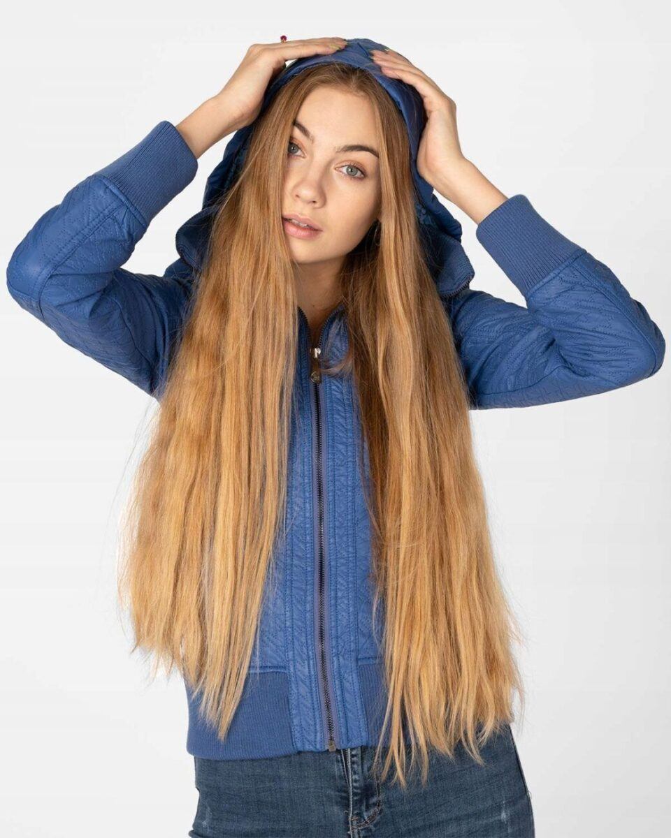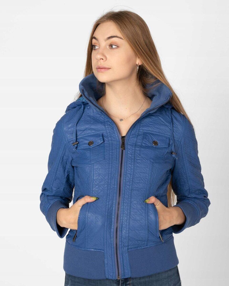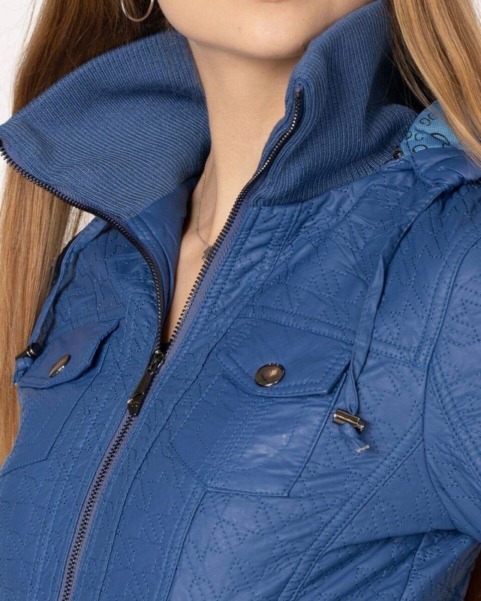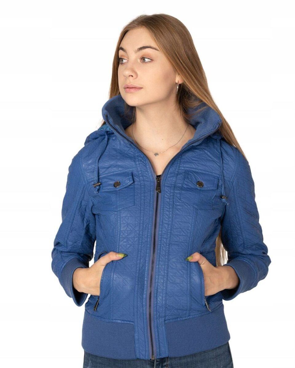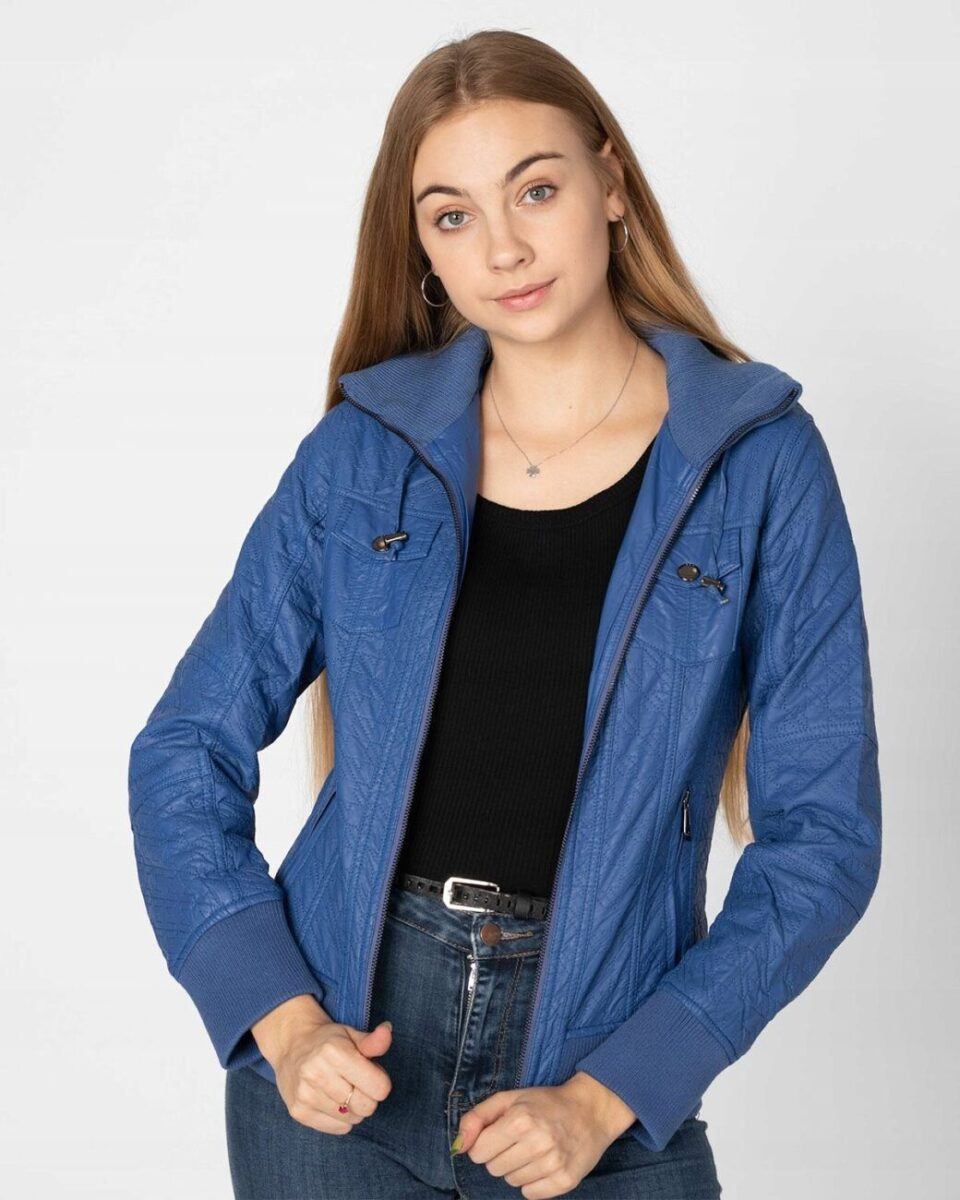 Kurtka jest lekko taliowana i zasuwana w całości na zamek błyskawiczny. Suwaki zasuwają również dwie kieszonki na dłonie na bokach kurtki. Na piersiach dwie małe kieszonki kryte patkami zapinanymi na ozdobne metaliczne napy. Wysoki kołnierz/stójka (z możliwością wyłożenia na boki) zasłania szyję i chroni gardło a często zastępuje nawet szalik co jest bardzo wygodne i skutecznie chroni przed zimnem i wiatrem. Praktyczny kaptur jest odpinany na zamek błyskawiczny i posiada możliwość regulacji wielkości i dopasowania za pomocą materiałowej tasiemki z metalowymi stoperami. Wewnętrzna strona kurtki wykończona jest materiałową podszewką. Wykonana z miękkiej, ozdobnie pikowanej skóry ekologicznej do złudzenia przypominającej prawdziwą skórę. Materiał zewnętrzny jest wiatroszczelny i wodoodporny zapewniając wygodę i komfort użytkowania nawet w mniej sprzyjających warunkach pogodowych. Talia zgrabnie podkreślona szerokim elastycznym ściągaczem efektownie podkreśla kobiecą sylwetkę. Całość tworzy najmodniejszy styl prezentowany obecnie szeroko na modowych blogach.