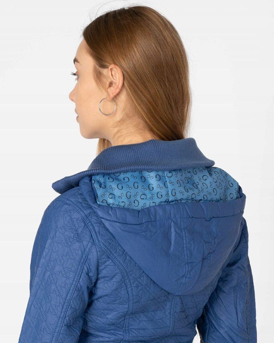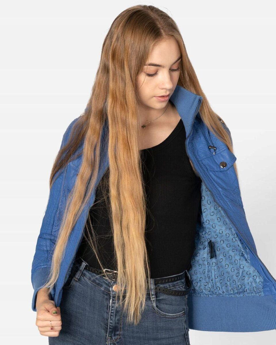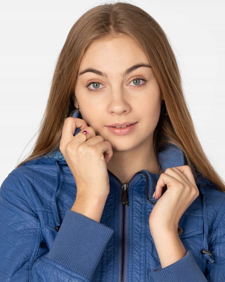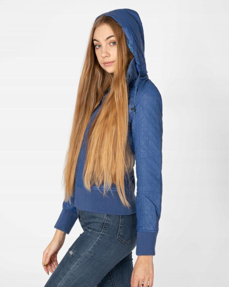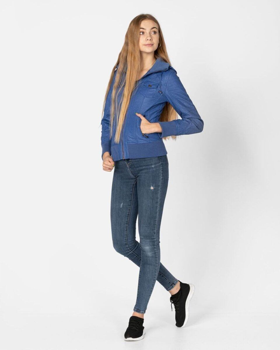 Kurtka jest lekko taliowana i zasuwana w całości na zamek błyskawiczny. Suwaki zasuwają również dwie kieszonki na dłonie na bokach kurtki. Na piersiach dwie małe kieszonki kryte patkami zapinanymi na ozdobne metaliczne napy. Wysoki kołnierz/stójka (z możliwością wyłożenia na boki) zasłania szyję i chroni gardło a często zastępuje nawet szalik co jest bardzo wygodne i skutecznie chroni przed zimnem i wiatrem. Praktyczny kaptur jest odpinany na zamek błyskawiczny i posiada możliwość regulacji wielkości i dopasowania za pomocą materiałowej tasiemki z metalowymi stoperami. Wewnętrzna strona kurtki wykończona jest materiałową podszewką. Wykonana z miękkiej, ozdobnie pikowanej skóry ekologicznej do złudzenia przypominającej prawdziwą skórę. Materiał zewnętrzny jest wiatroszczelny i wodoodporny zapewniając wygodę i komfort użytkowania nawet w mniej sprzyjających warunkach pogodowych. Talia zgrabnie podkreślona szerokim elastycznym ściągaczem efektownie podkreśla kobiecą sylwetkę. Całość tworzy najmodniejszy styl prezentowany obecnie szeroko na modowych blogach.