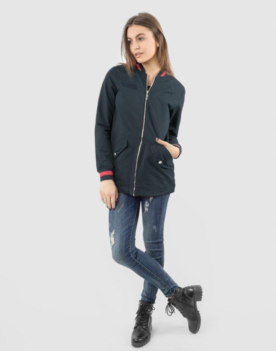 Kurtka zasuwana jest na zamek błyskawiczny i wykonana z mocnej tkaniny 100% bawełnianej o gęstym splocie włókien zapewniającej wygodę i komfort termiczny użytkowania nawet w mniej sprzyjających warunkach pogodowych. Z przodu kurtki dwie wpuszczane kieszenie na dłonie oraz dwie imitacje kieszeni kryte patkami zapinanymi na napy. Na lewym rękawie naszywka z efektownym firmowym logo. Dół kurtki który posiada możliwość regulacji szerokości i dopasowania za pomocą elastycznego ściągacza i stoperów oraz szerokie elastyczne ściągacze przy szyi i rękawach pozwalają na precyzyjne dopasowanie do ciała, zapobiegają utracie ciepła i skutecznie chronią przed podmuchami wiatru. Jak w typowych „bomberkach” wewnętrzna strona kurtki wykończona jest materiałową podszewką. Długość midi która z powodzeniem zakrywa części ciała wrażliwe na chłód jak plecy na wysokości nerek i pośladki.