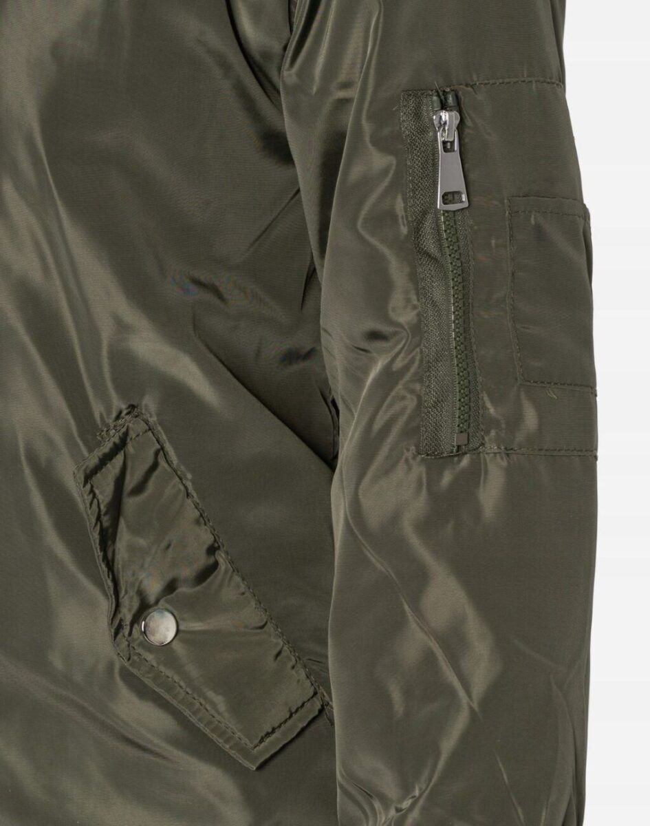 Zasuwana na zamek błyskawiczny i lekko ocieplona puchem syntetycznym. Na bokach dwie wpuszczane kieszenie na dłonie zapinane na napy. Na lewym rękawie imitacja kieszonki typu bomber z zamkiem błyskawicznym plus mała kieszonka naszywana. Szerokie elastyczne ściągacze u dołu kurtki przy szyi i rękawach pozwalają na precyzyjne dopasowanie do ciała, zapobiegają utracie ciepła i skutecznie chronią przed podmuchami wiatru. Długość midi z powodzeniem zakrywa części ciała wrażliwe na chłód jak plecy na wysokości nerek i pośladki. Materiał zewnętrzny jest wiatroszczelny i posiada właściwości odpychające wodę. Jak w typowych „bomberkach” wewnętrzna strona kurtki wykończona jest materiałową pikowaną podszewką w kontrastowym pomarańczowym kolorze.
