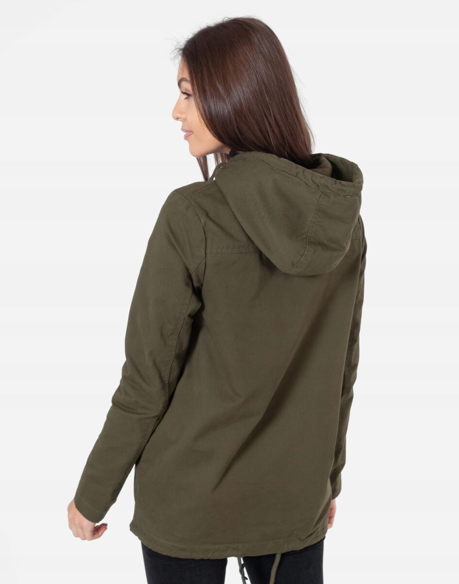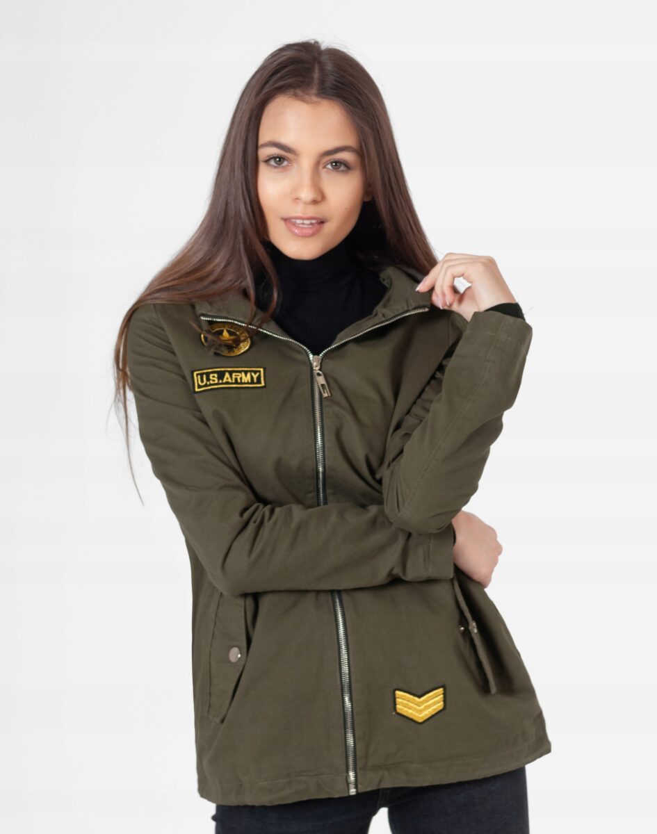 Przejściowa kurtka damska typu parka z kapturem, przekonująca efektownym fasonem i najmodniejszym obecnie militarnym stylem U.S. Army. Kurtka jest zasuwana w całości na zamek błyskawiczny a na bokach ma dwie wpuszczane kieszenie na dłonie kryte patkami zapinanymi na napy. Posiada praktyczny zintegrowany kaptur z możliwością regulacji wielkości i dopasowania za pomocą sznurkowego ściągacza. Wewnętrzna strona kurtki na materiałowej podszewce. Na prawej piersi i na dole kurtki firmowe naszywki w stylu U.S Army. Rękawy proste wykończone lamówką. Dół kurtki posiada możliwość regulacji szerokości i dopasowania za pomocą ściągacza i stoperów, które pozwalają na precyzyjne dopasowanie kurtki do ciała. Długość midi z powodzeniem zakrywa części ciała wrażliwe na chłód jak plecy na wysokości nerek i pośladki.