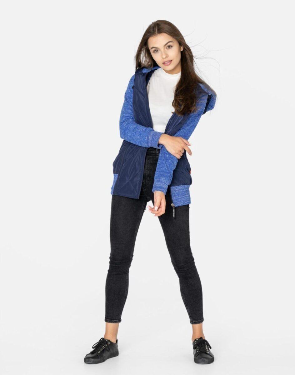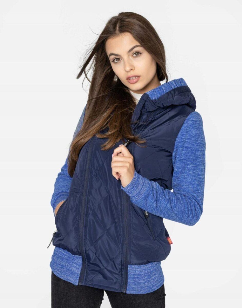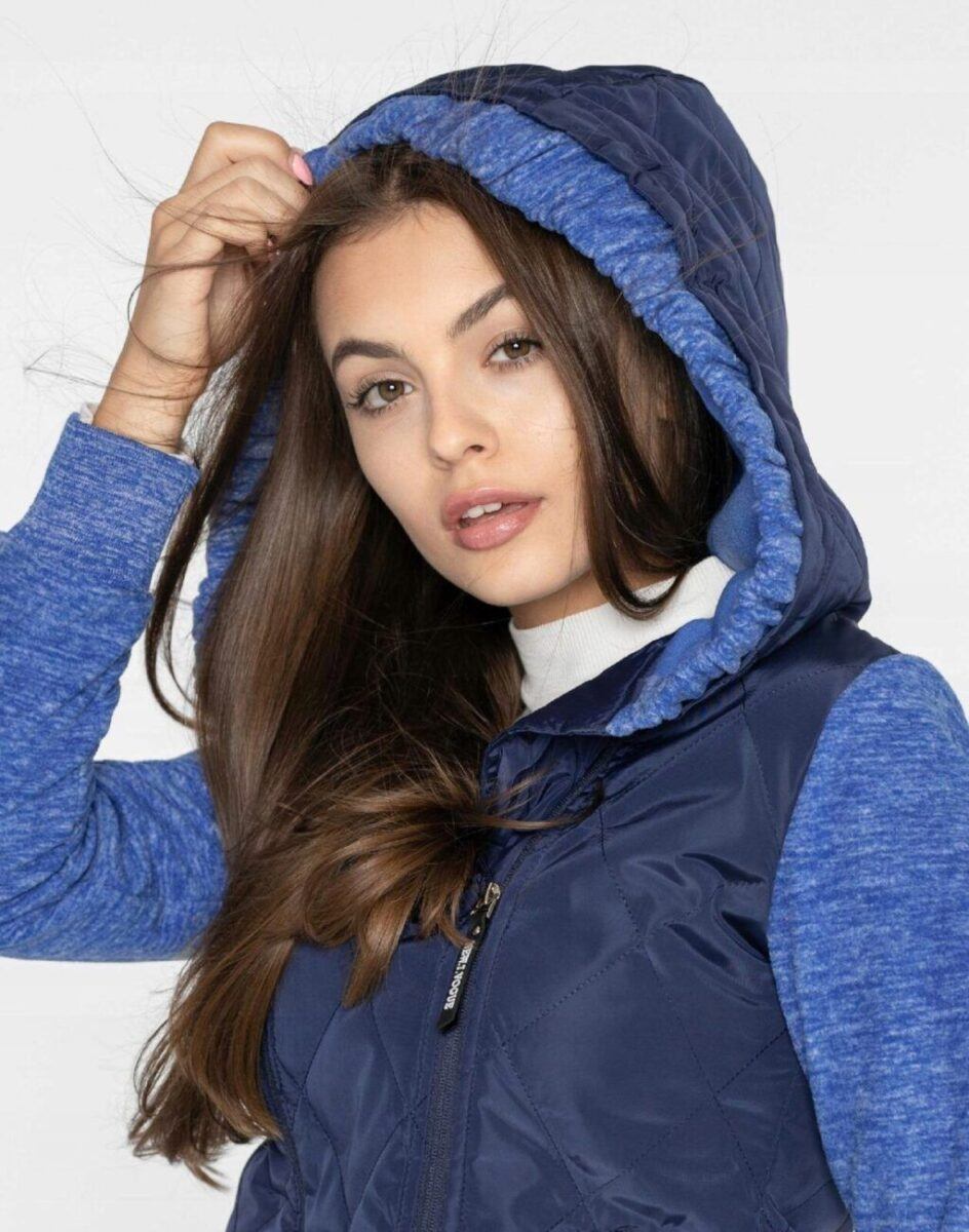 Znakomicie sprawdzi się w chłodniejsze dni a praktyczny ocieplony kaptur wykończony od wewnętrznej strony bawełnianą podszewką i ozdobiony polarowym ściągaczem skutecznie ochroni Twoją głowę przed wiatrem i chłodem. Bluza/kurtka jest lekko ocieplana, zasuwana w całości na asymetryczny zamek błyskawiczny i posiada dwie wpuszczane kieszenie na dłonie zasuwane na zamki. Dół bluzy oraz rękawy zakończone są szerokim elastycznym ściągaczem co pozwala na precyzyjne dopasowanie bluzy do ciała i zapobiega utracie ciepła. Długość midi która z powodzeniem zakrywa części ciała wrażliwe na chłód jak plecy na wysokości nerek i pośladki. Fason dostosowany do kobiecej budowy ciała doskonale wyprofilowana konstrukcja efektownie podkreślająca kobiecą sylwetkę. Modny układ pikowanych lekko ocieplonych ortalionowych paneli został efektownie połączony z polarowymi rękawami tworząc najmodniejszy obecnie styl prezentowany szeroko na modowych blogach.