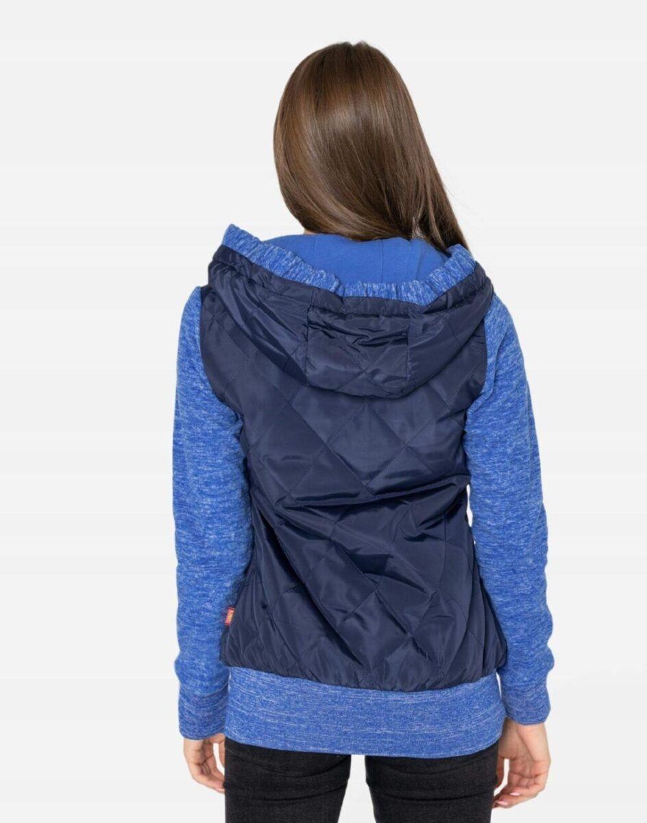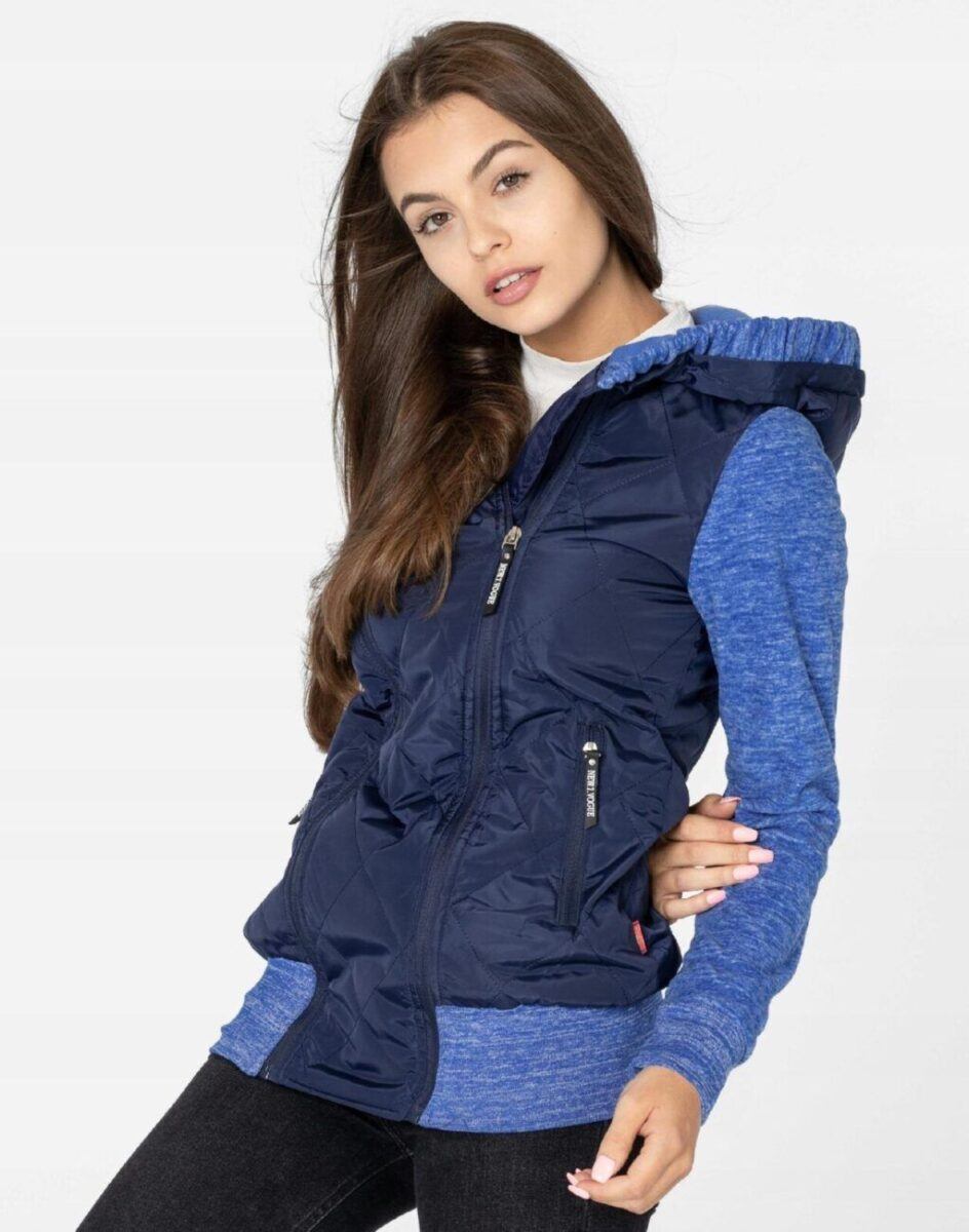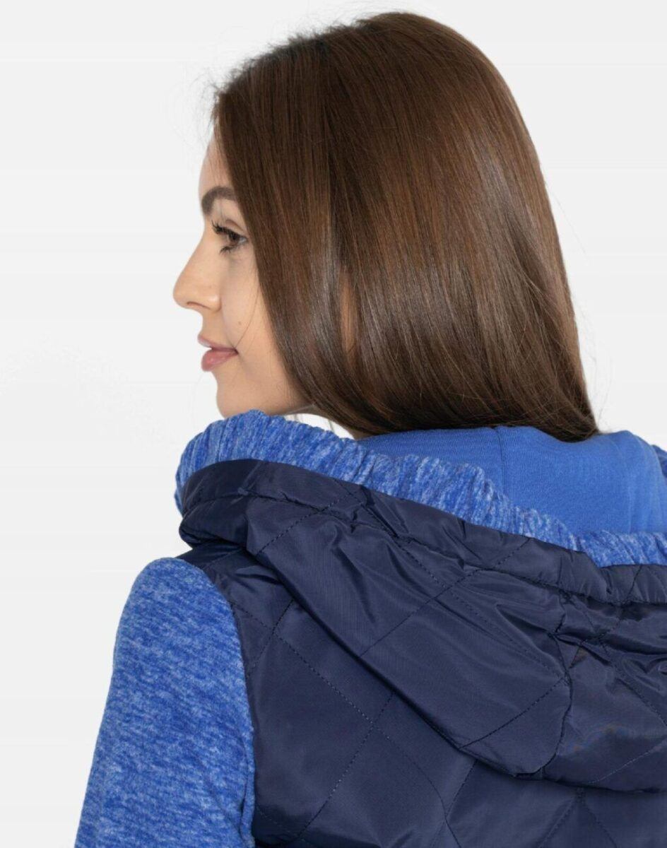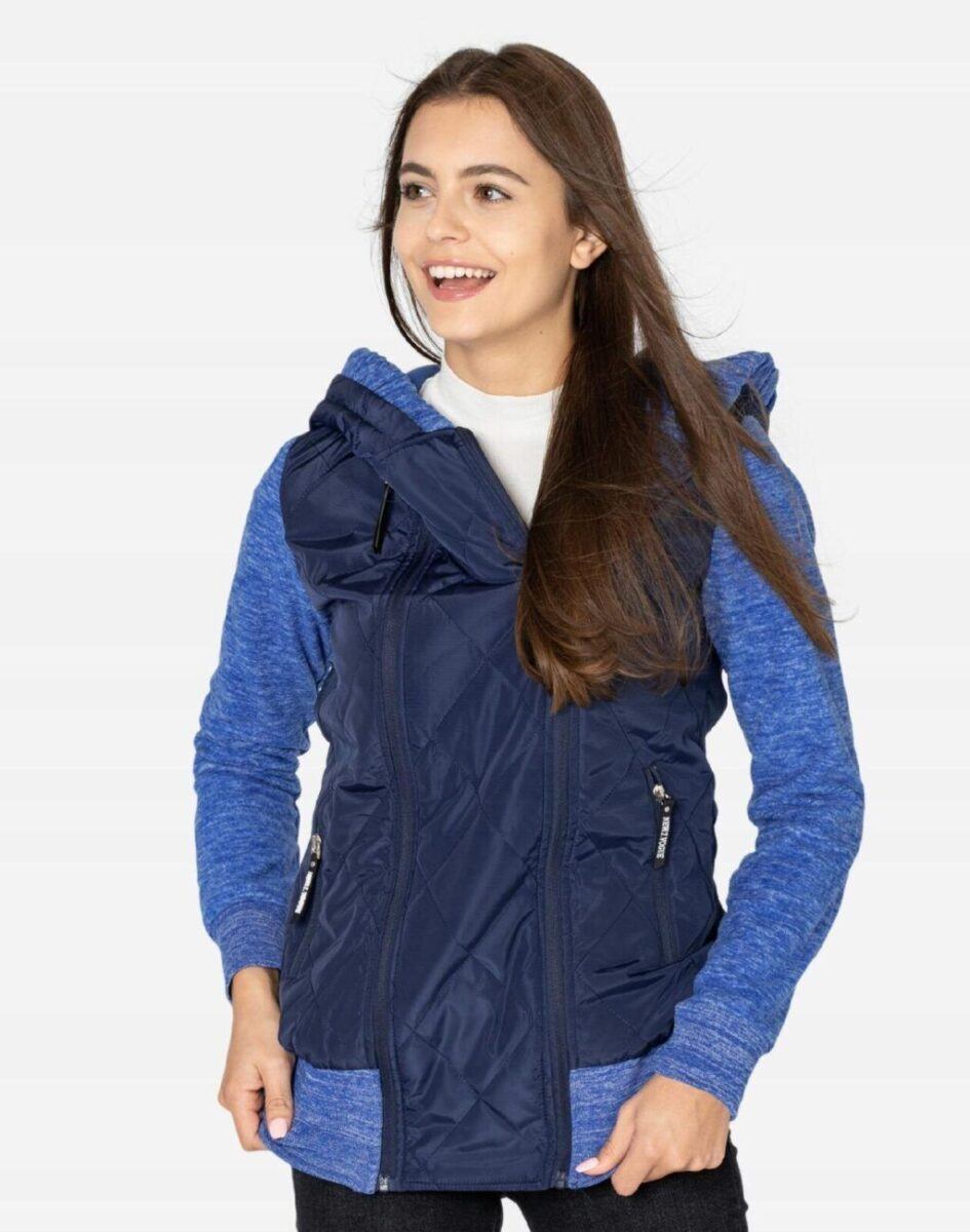 Znakomicie sprawdzi się w chłodniejsze dni a praktyczny ocieplony kaptur wykończony od wewnętrznej strony bawełnianą podszewką i ozdobiony polarowym ściągaczem skutecznie ochroni Twoją głowę przed wiatrem i chłodem. Bluza/kurtka jest lekko ocieplana, zasuwana w całości na asymetryczny zamek błyskawiczny i posiada dwie wpuszczane kieszenie na dłonie zasuwane na zamki. Dół bluzy oraz rękawy zakończone są szerokim elastycznym ściągaczem co pozwala na precyzyjne dopasowanie bluzy do ciała i zapobiega utracie ciepła. Długość midi która z powodzeniem zakrywa części ciała wrażliwe na chłód jak plecy na wysokości nerek i pośladki. Fason dostosowany do kobiecej budowy ciała doskonale wyprofilowana konstrukcja efektownie podkreślająca kobiecą sylwetkę. Modny układ pikowanych lekko ocieplonych ortalionowych paneli został efektownie połączony z polarowymi rękawami tworząc najmodniejszy obecnie styl prezentowany szeroko na modowych blogach.