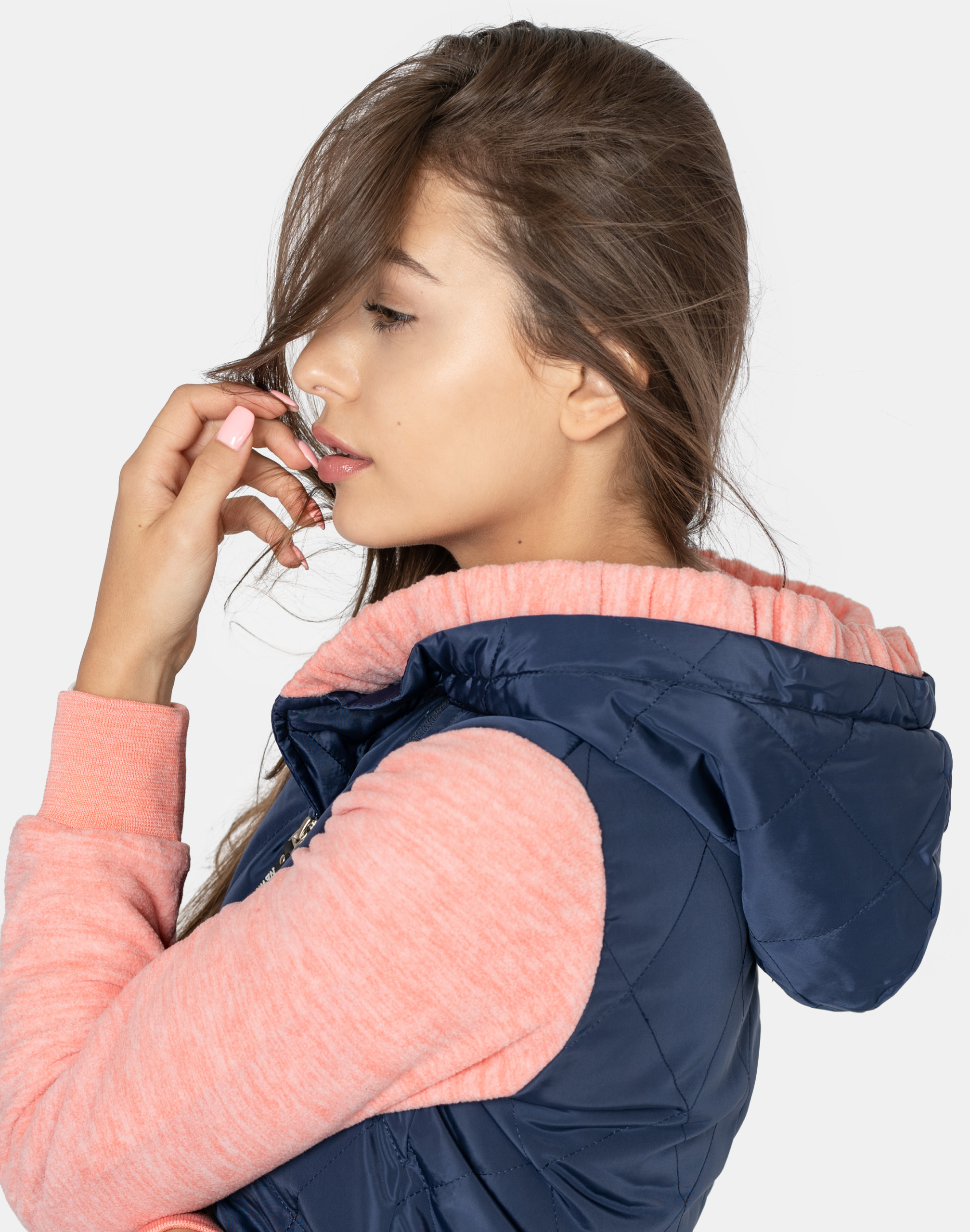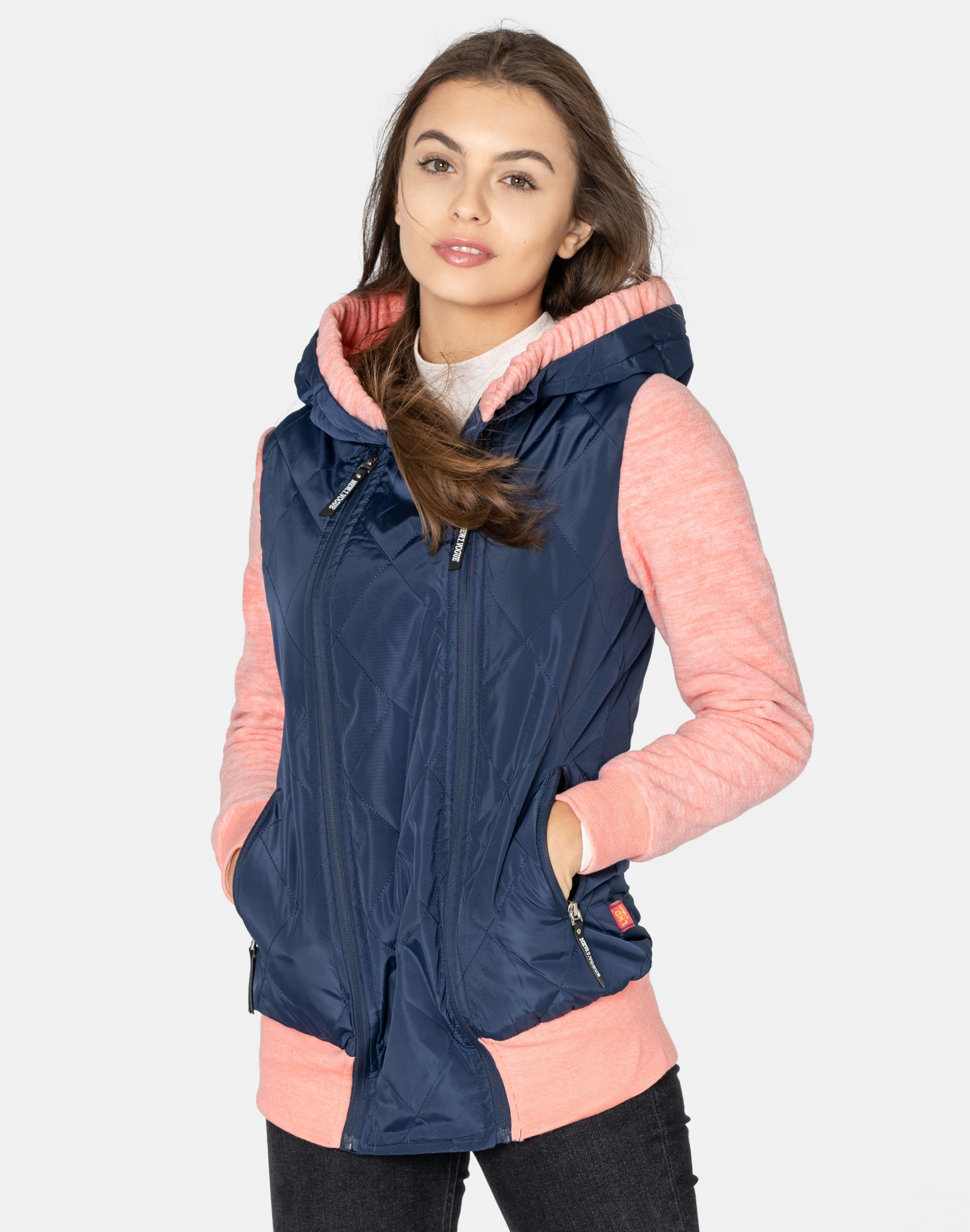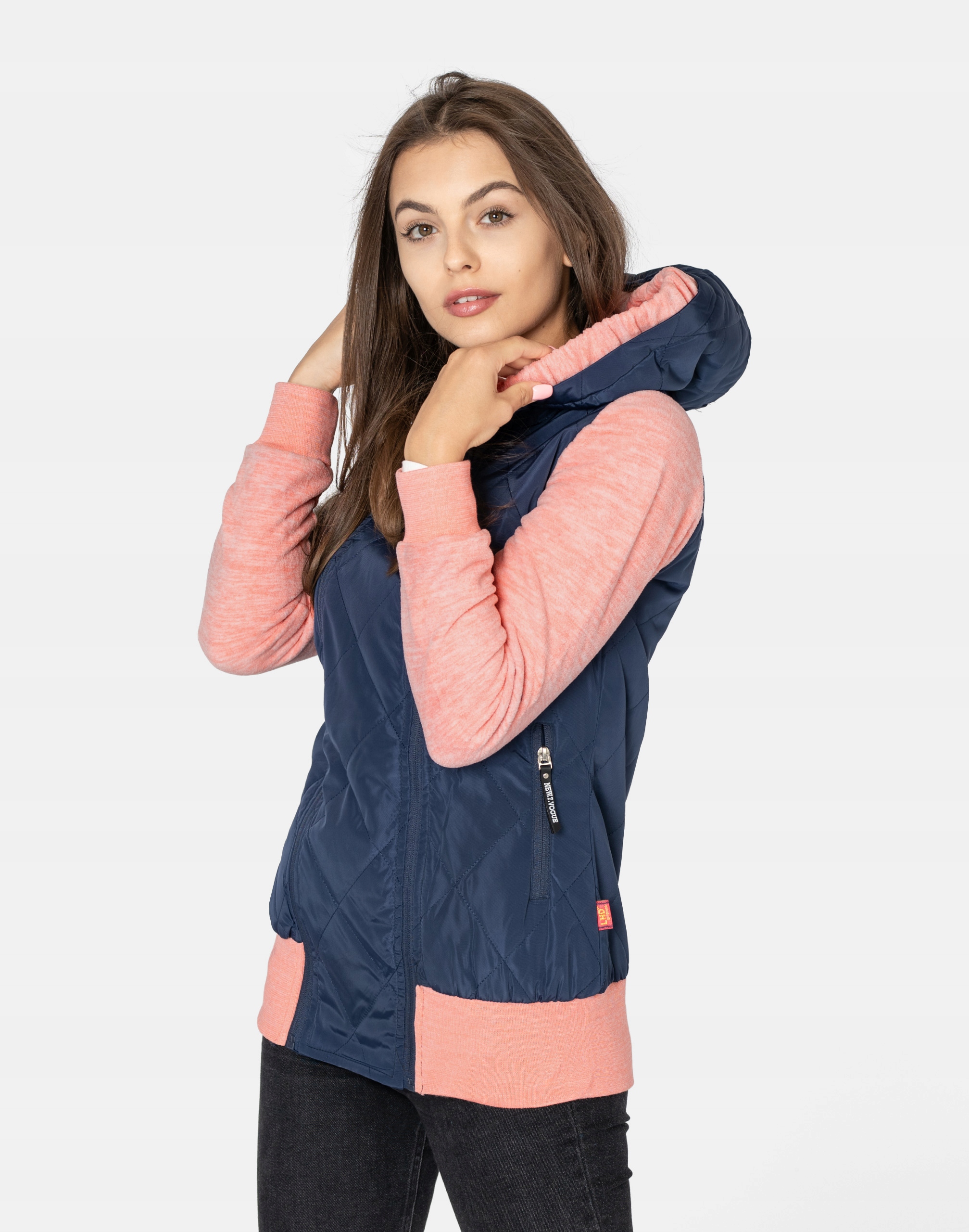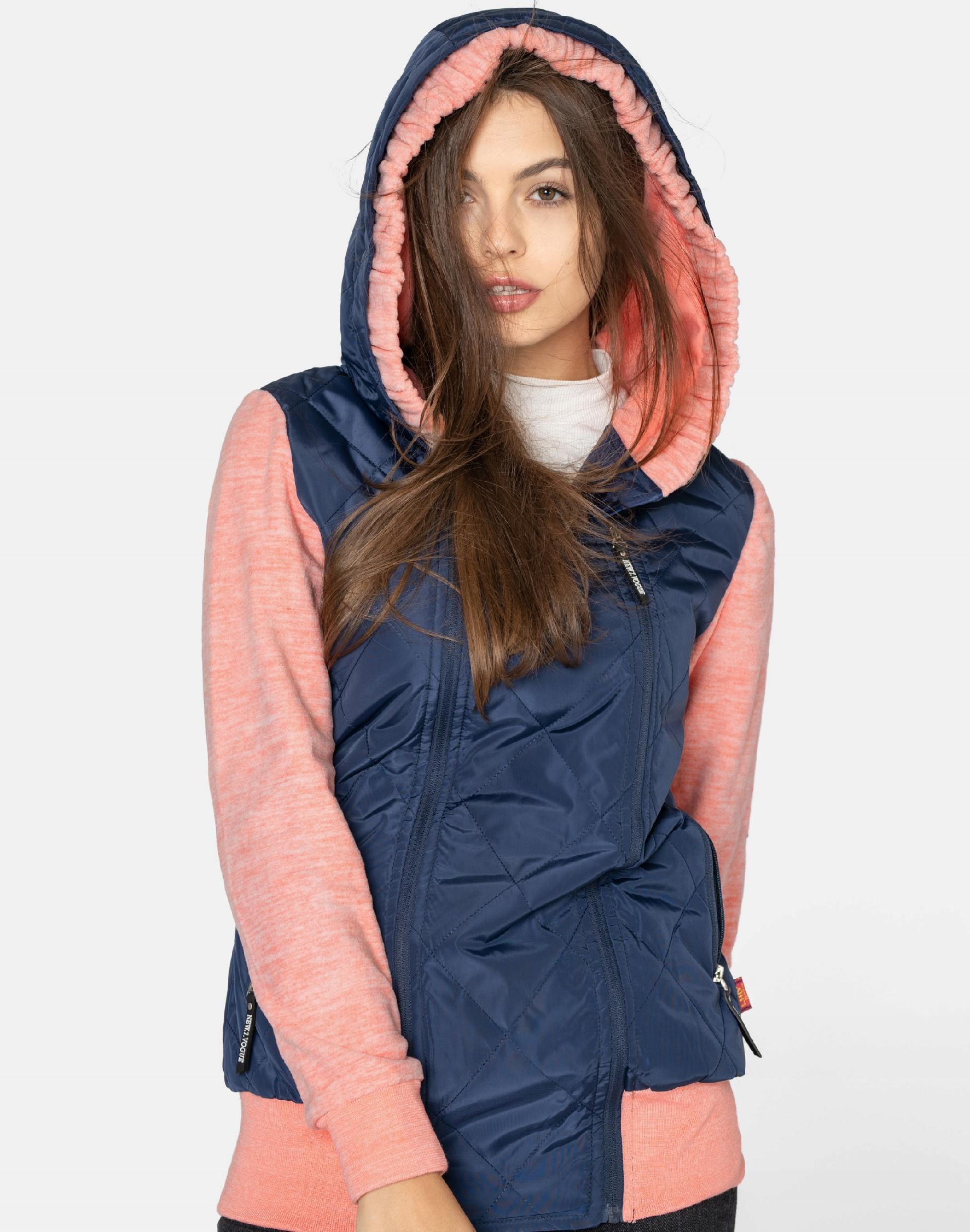 Znakomicie sprawdzi się w chłodniejsze dni a praktyczny ocieplony kaptur wykończony od wewnętrznej strony bawełnianą podszewką i ozdobiony polarowym ściągaczem skutecznie ochroni Twoją głowę przed wiatrem i chłodem. Bluza/kurtka jest lekko ocieplana, zasuwana w całości na asymetryczny zamek błyskawiczny i posiada dwie wpuszczane kieszenie na dłonie zasuwane na zamki. Dół bluzy oraz rękawy zakończone są szerokim elastycznym ściągaczem co pozwala na precyzyjne dopasowanie bluzy do ciała i zapobiega utracie ciepła. Długość midi która z powodzeniem zakrywa części ciała wrażliwe na chłód jak plecy na wysokości nerek i pośladki. Fason dostosowany do kobiecej budowy ciała doskonale wyprofilowana konstrukcja efektownie podkreślająca kobiecą sylwetkę. Modny układ pikowanych lekko ocieplonych ortalionowych paneli został efektownie połączony z polarowymi rękawami tworząc najmodniejszy obecnie styl prezentowany szeroko na modowych blogach.