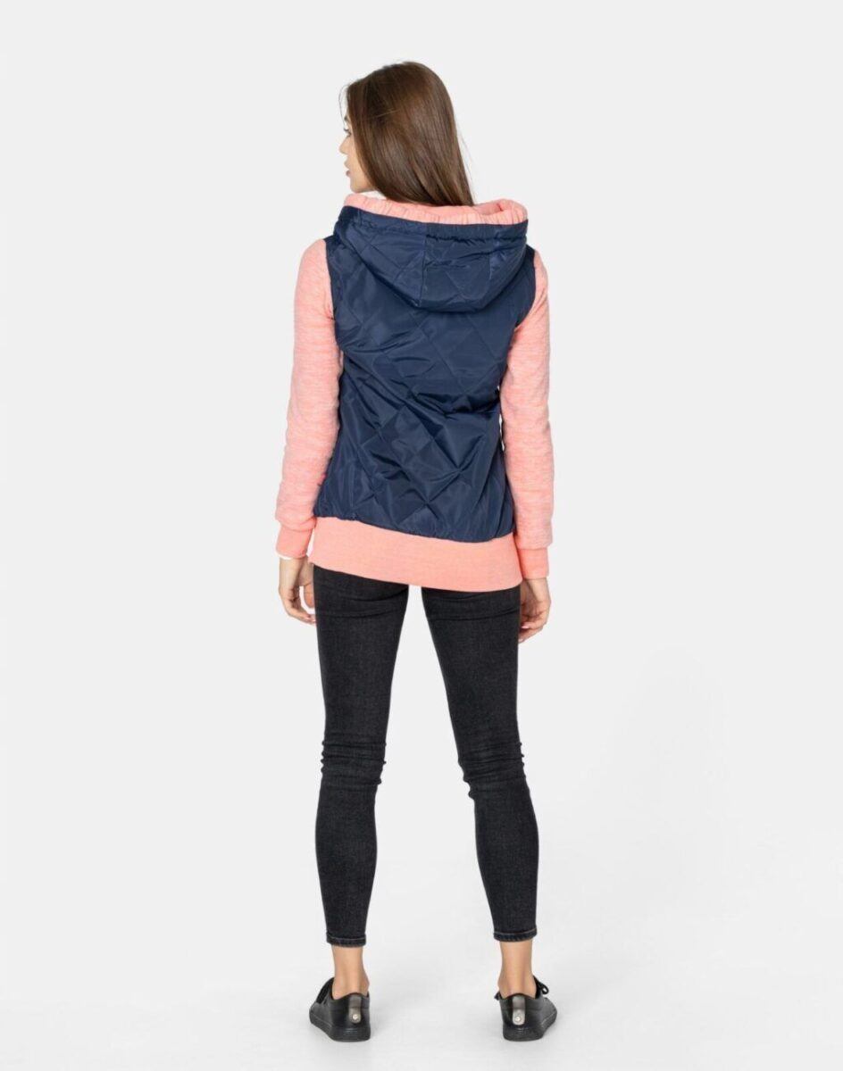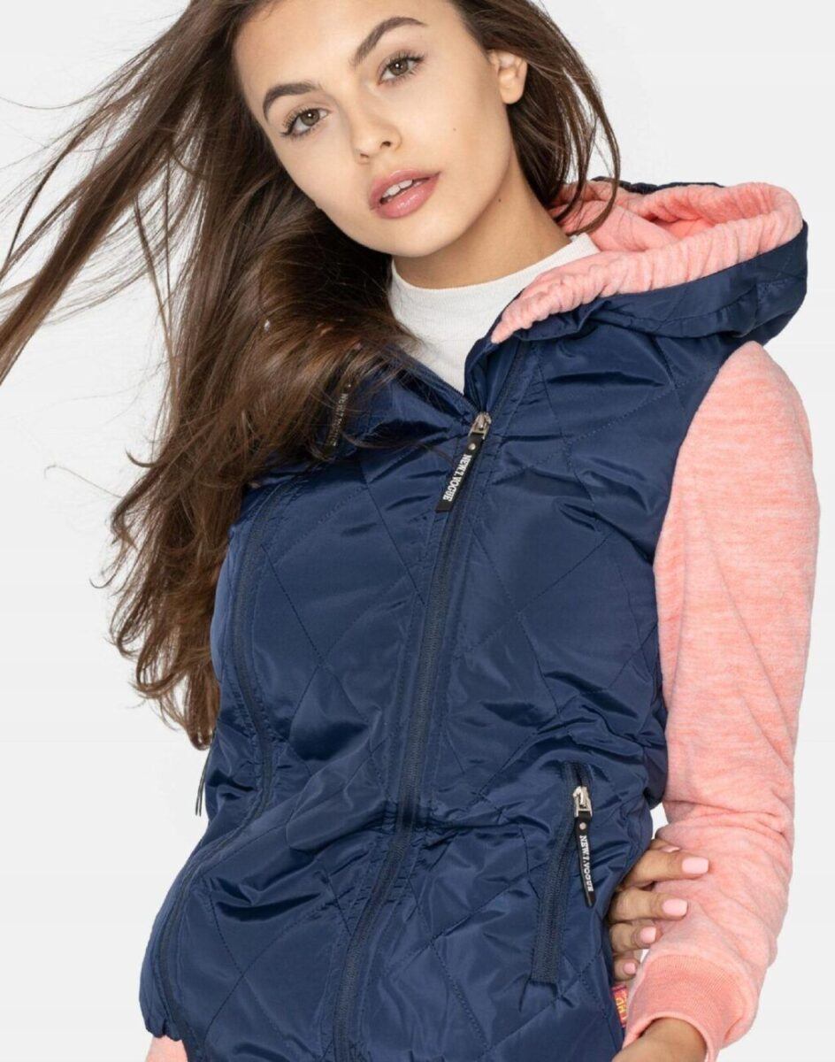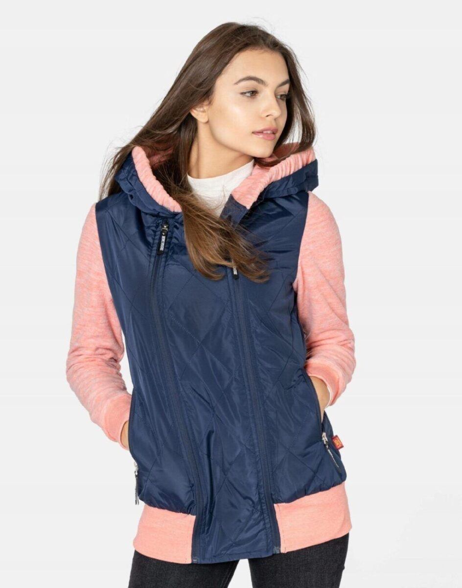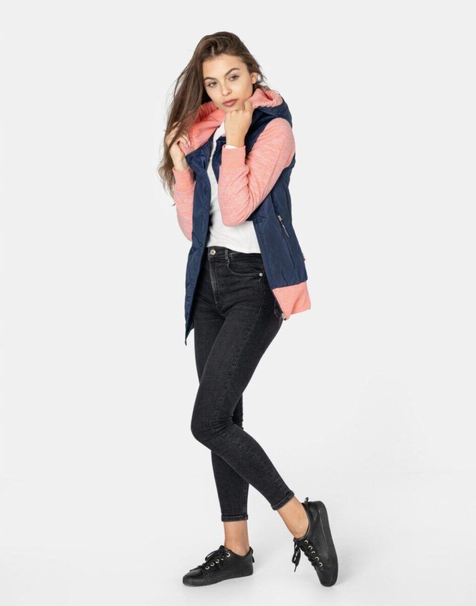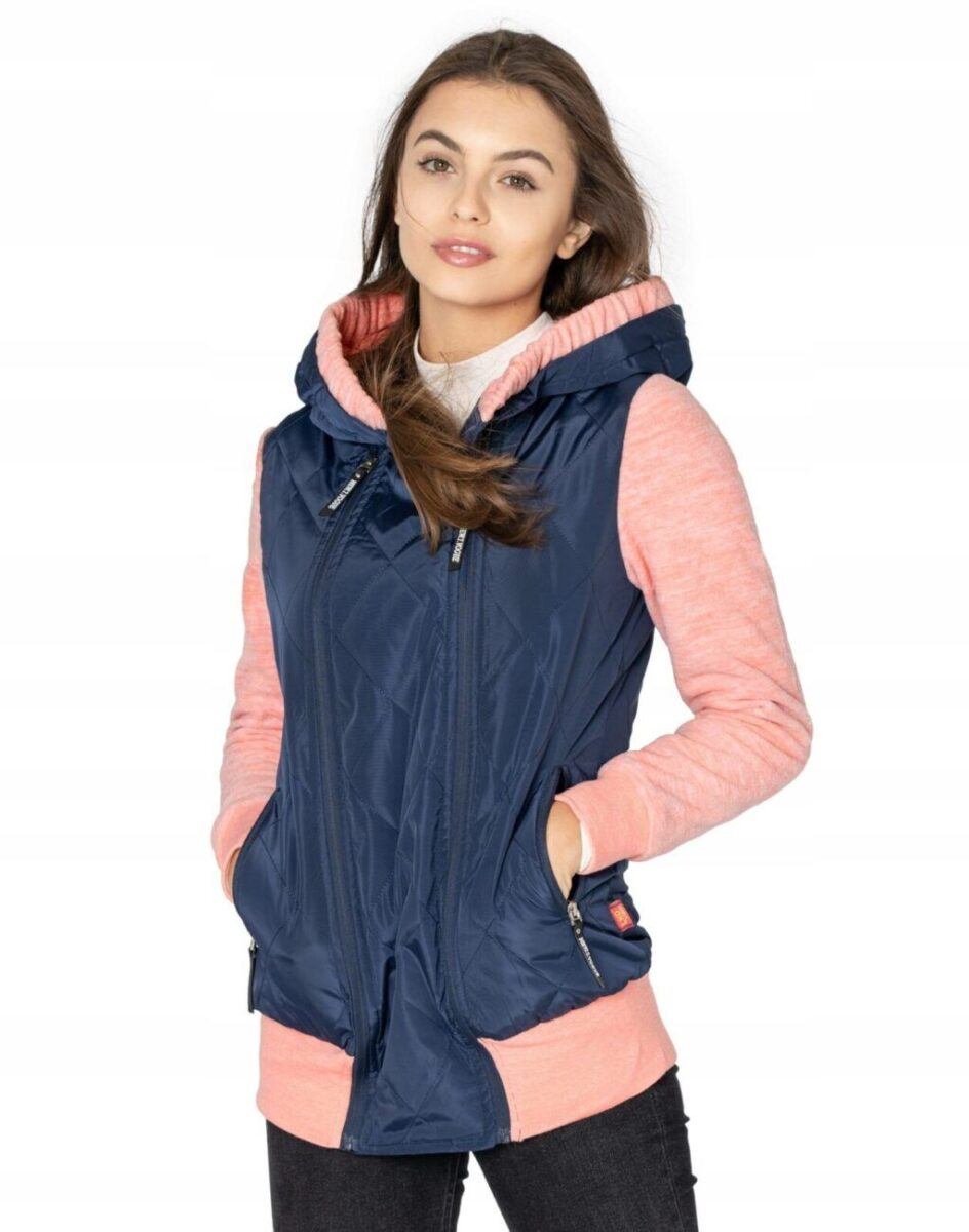 Znakomicie sprawdzi się w chłodniejsze dni a praktyczny ocieplony kaptur wykończony od wewnętrznej strony bawełnianą podszewką i ozdobiony polarowym ściągaczem skutecznie ochroni Twoją głowę przed wiatrem i chłodem. Bluza/kurtka jest lekko ocieplana, zasuwana w całości na asymetryczny zamek błyskawiczny i posiada dwie wpuszczane kieszenie na dłonie zasuwane na zamki. Dół bluzy oraz rękawy zakończone są szerokim elastycznym ściągaczem co pozwala na precyzyjne dopasowanie bluzy do ciała i zapobiega utracie ciepła. Długość midi która z powodzeniem zakrywa części ciała wrażliwe na chłód jak plecy na wysokości nerek i pośladki. Fason dostosowany do kobiecej budowy ciała doskonale wyprofilowana konstrukcja efektownie podkreślająca kobiecą sylwetkę. Modny układ pikowanych lekko ocieplonych ortalionowych paneli został efektownie połączony z polarowymi rękawami tworząc najmodniejszy obecnie styl prezentowany szeroko na modowych blogach.