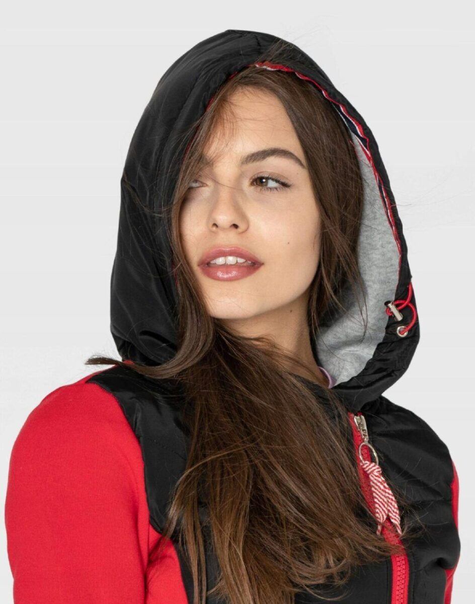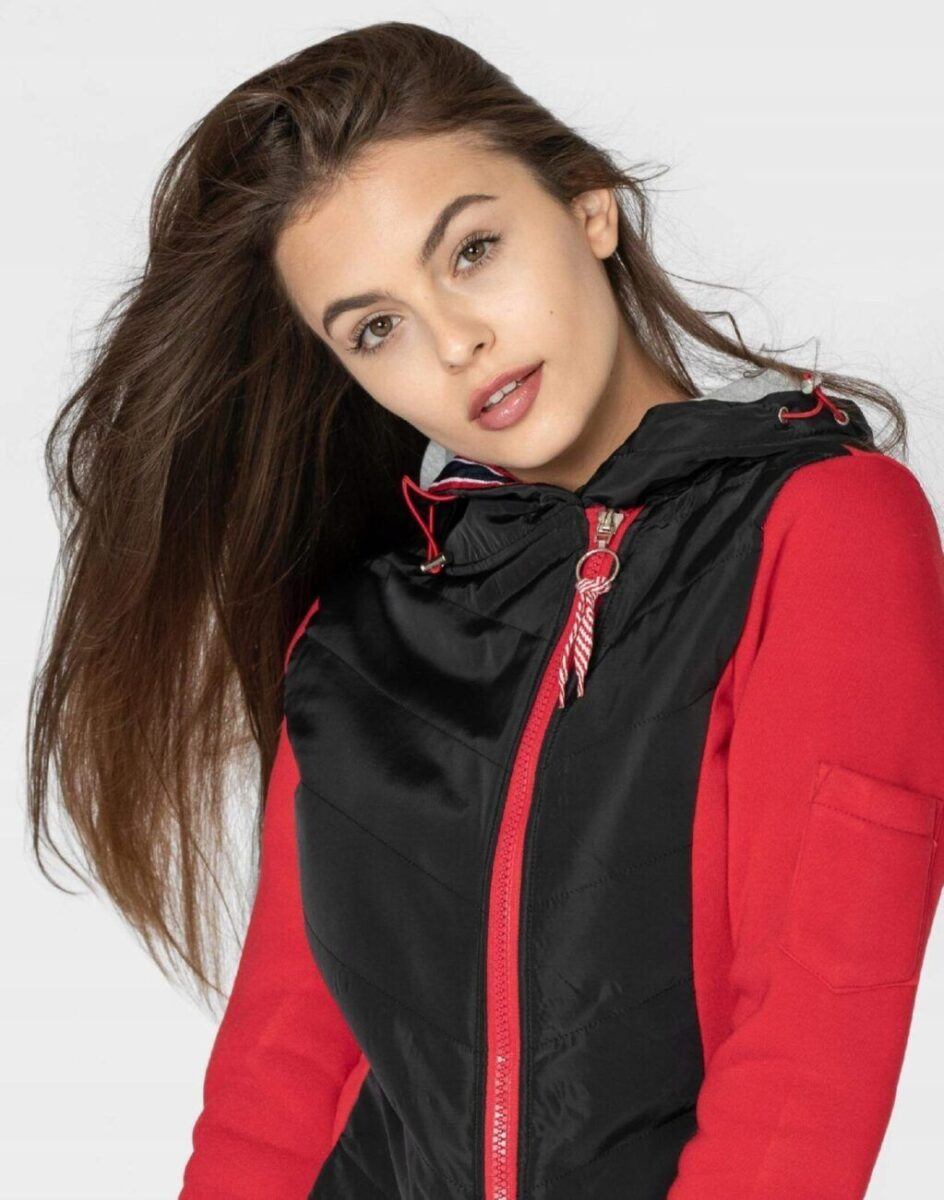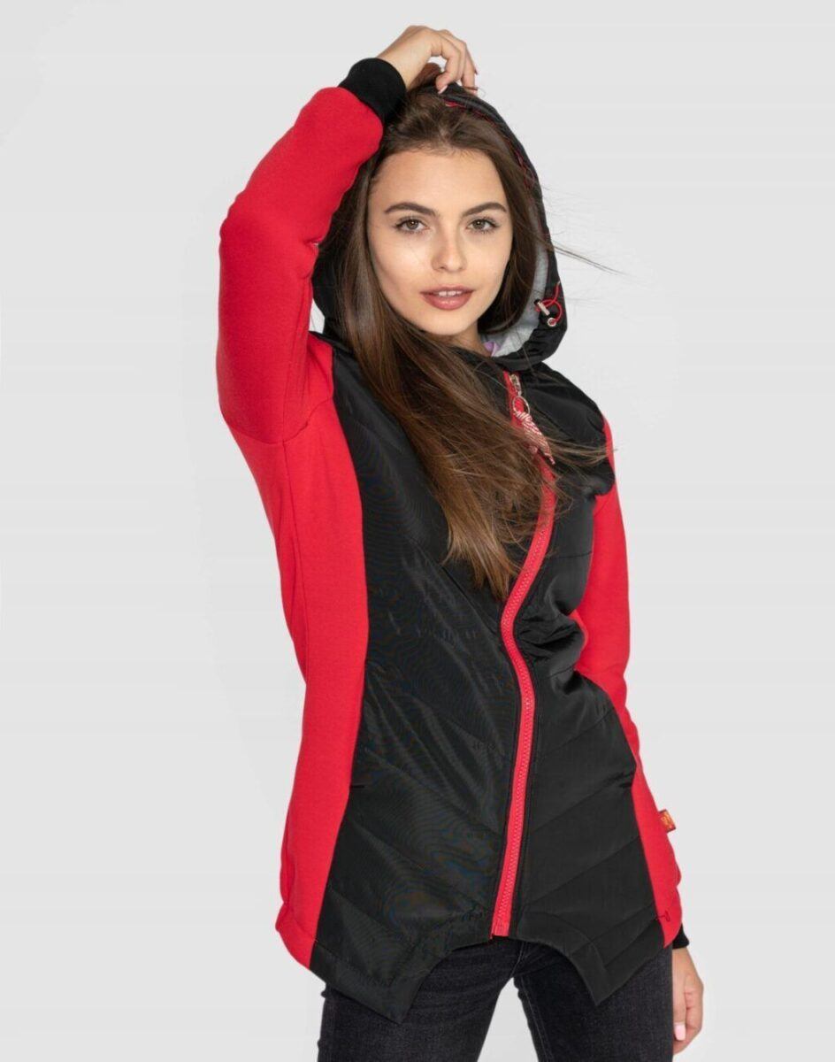 Znakomicie sprawdzi się w chłodniejsze dni a praktyczny ocieplony kaptur wykończony od wewnętrznej strony bawełnianą dzianiną z elastycznym gumowym ściągaczem ze stoperami skutecznie ochroni Twoją głowę przed wiatrem i chłodem. Bluza/kurtka jest lekko ocieplana, zasuwana w całości na asymetryczny zamek błyskawiczny i posiada dwie wpuszczane kieszenie na dłonie i jedną ozdobną na przedramieniu. Rękawy zakończone są szerokim elastycznym ściągaczem co pozwala na precyzyjne dopasowanie bluzy do ciała i zapobiega utracie ciepła. Dół bluzy asymetryczny z wydłużonym tyłem.  Długość midi która z powodzeniem zakrywa części ciała wrażliwe na chłód jak plecy na wysokości nerek i pośladki. Fason dostosowany do kobiecej budowy ciała doskonale wyprofilowana konstrukcja efektownie podkreślająca kobiecą sylwetkę. Modny układ pikowanych lekko ocieplonych ortalionowych paneli został efektownie połączony z dzianinowymi rękawami tworząc najmodniejszy obecnie styl prezentowany szeroko na modowych blogach.