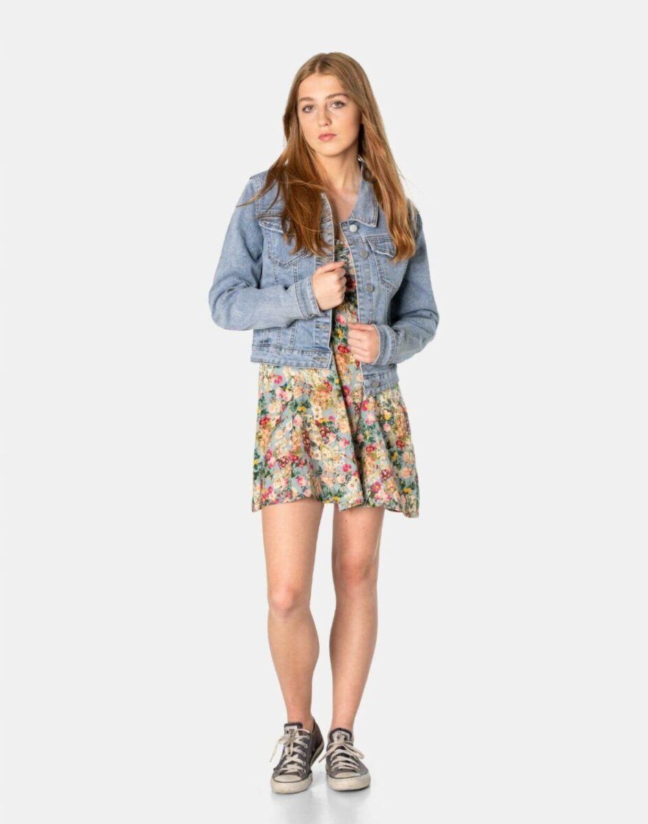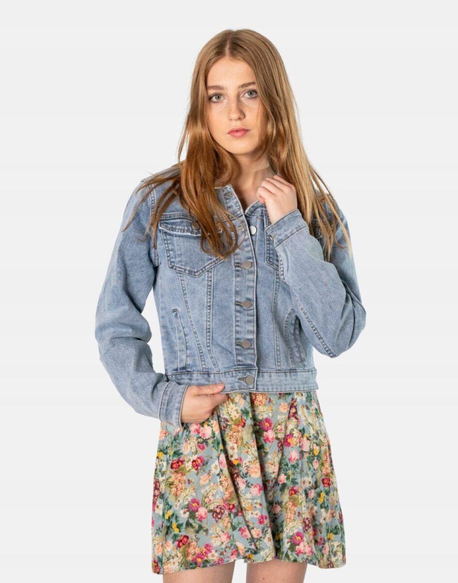 Damska kurtka jeansowa o ponadczasowym, klasycznym kroju uszyta z jeansu w kolorze niebieskim „Light Blue” w nieśmiertelnym stylu Vintage z modnym fabrycznym efektem sprania i przetarciami „used-look”, które dodają jej wyjątkowego charakteru. W procesie produkcji poddana została specjalnym zabiegom postarzającym materiał polegającym na wycieraniu, wielokrotnym wypieraniu barwnika i tworzeniu efektownych przetarć. Efektowne rozjaśnienia i wytarcia mają na celu wywołanie tak modnego efektu starej, długo noszonej, zużytej jeansowej kurtki przez co jest ubraniem, które nigdy się nie nudzi i zawsze będzie na czasie. Taka kurtka to najbardziej wyraźny przykład na to, że jeans po prostu nigdy się nie starzeje.