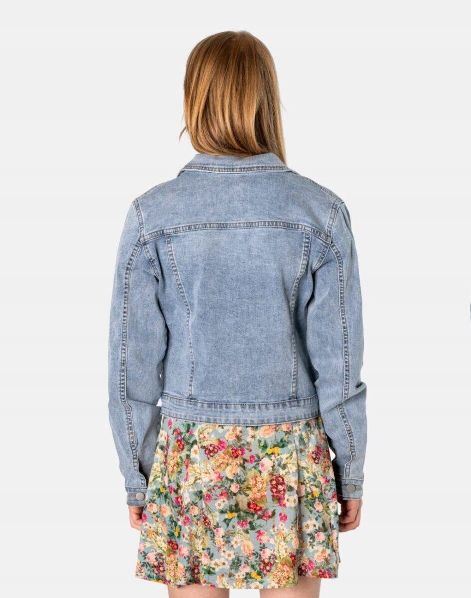 Damska kurtka jeansowa o ponadczasowym, klasycznym kroju uszyta z jeansu w kolorze niebieskim „Light Blue” w nieśmiertelnym stylu Vintage z modnym fabrycznym efektem sprania i przetarciami „used-look”, które dodają jej wyjątkowego charakteru. W procesie produkcji poddana została specjalnym zabiegom postarzającym materiał polegającym na wycieraniu, wielokrotnym wypieraniu barwnika i tworzeniu efektownych przetarć. Efektowne rozjaśnienia i wytarcia mają na celu wywołanie tak modnego efektu starej, długo noszonej, zużytej jeansowej kurtki przez co jest ubraniem, które nigdy się nie nudzi i zawsze będzie na czasie. Taka kurtka to najbardziej wyraźny przykład na to, że jeans po prostu nigdy się nie starzeje.