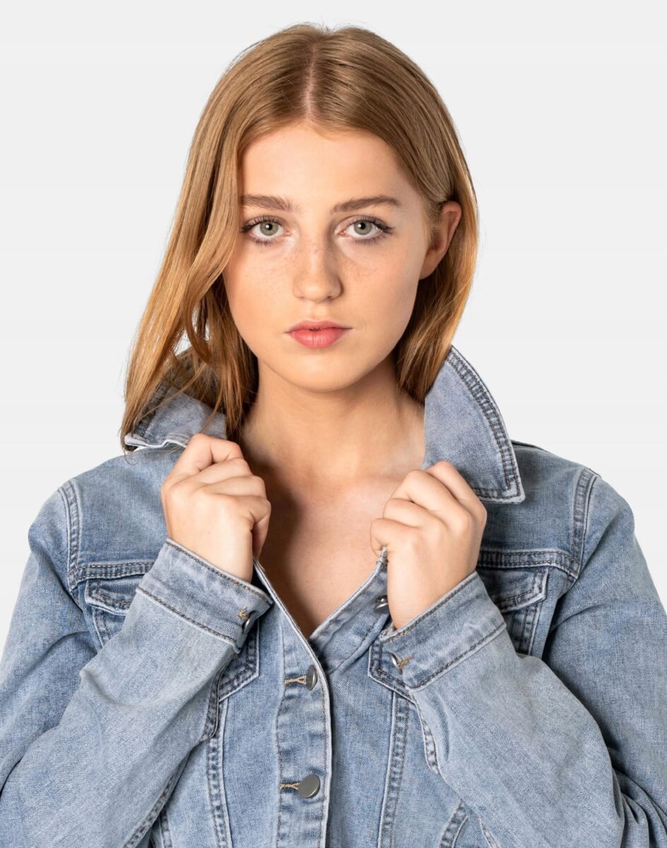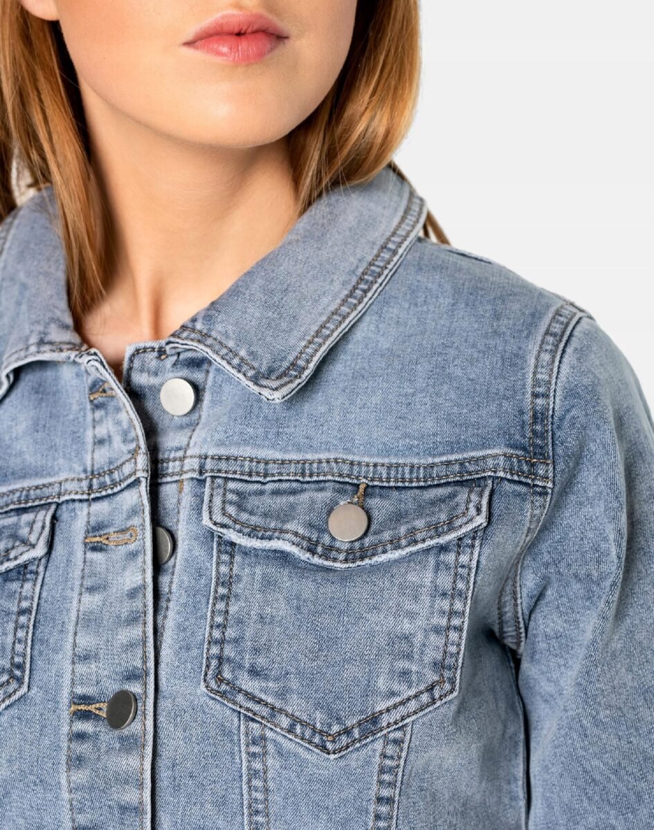 Damska kurtka jeansowa o ponadczasowym, klasycznym kroju uszyta z jeansu w kolorze niebieskim „Light Blue” w nieśmiertelnym stylu Vintage z modnym fabrycznym efektem sprania i przetarciami „used-look”, które dodają jej wyjątkowego charakteru. W procesie produkcji poddana została specjalnym zabiegom postarzającym materiał polegającym na wycieraniu, wielokrotnym wypieraniu barwnika i tworzeniu efektownych przetarć. Efektowne rozjaśnienia i wytarcia mają na celu wywołanie tak modnego efektu starej, długo noszonej, zużytej jeansowej kurtki przez co jest ubraniem, które nigdy się nie nudzi i zawsze będzie na czasie. Taka kurtka to najbardziej wyraźny przykład na to, że jeans po prostu nigdy się nie starzeje.