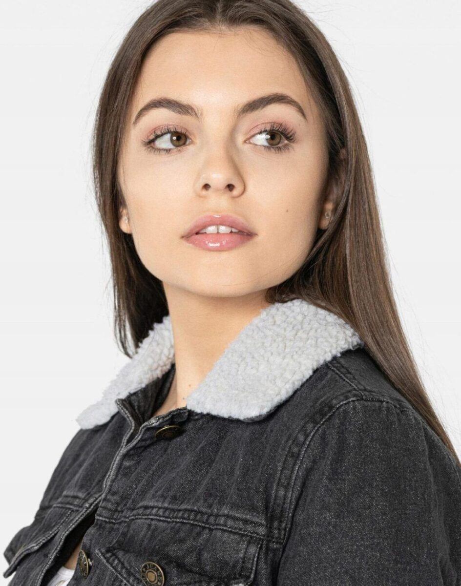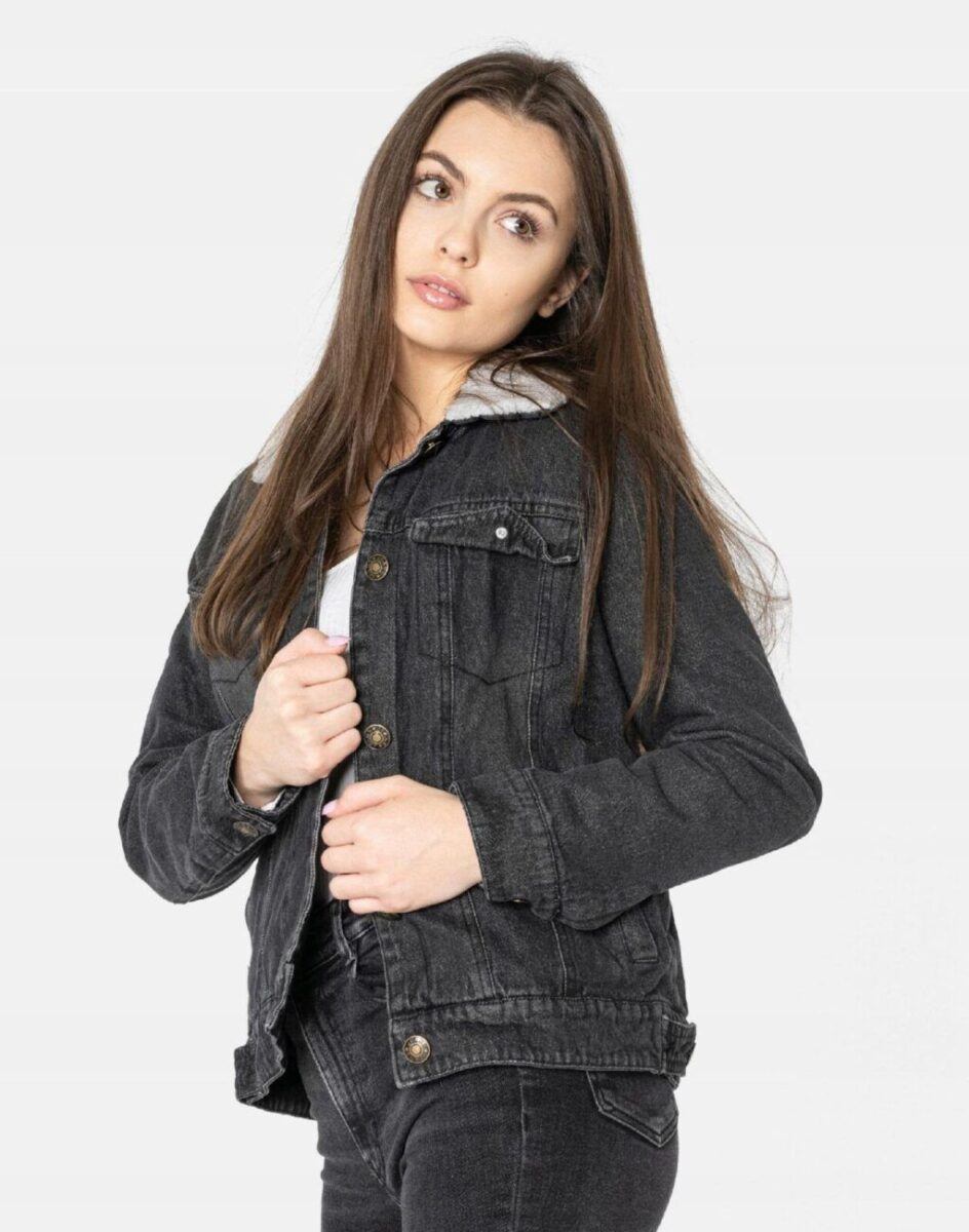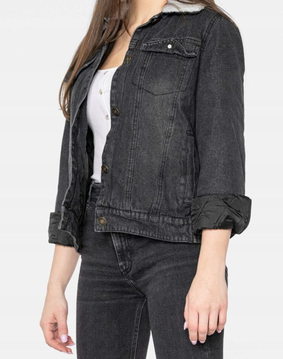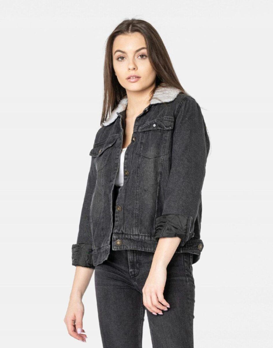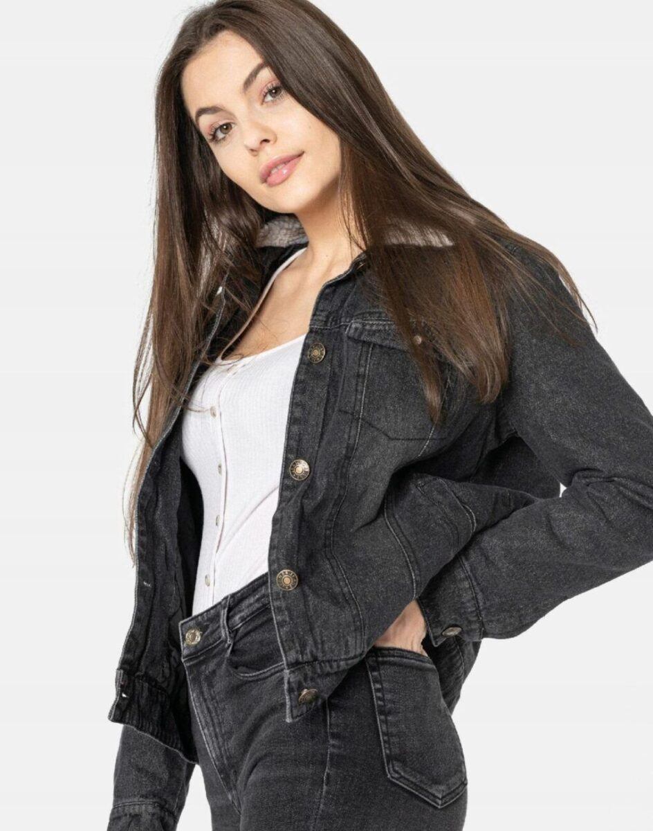 Damska kurtka jeansowa o ponadczasowym, klasycznym kroju uszyta z jeansu w kolorze czarnym „Super Black” w nieśmiertelnym stylu Shearling Jacket, z fabrycznym efektem sprania i przetarciami. Kołnierz ozdobiony jest niezwykle modnym w tym sezonie jasnym kożuszkiem barankiem. Zapinana w całości na rząd metalowych guzików. Po bokach posiada dwie, wpuszczane kieszenie na dłonie. Na piersiach atrapy kieszeni krytych patkami zapinanymi na guziki. Nie krępuje ruchów i jest bardzo wygodna w noszeniu, a do tego praktyczna. Wewnętrzna strona kurtki wykończona jest lekko ocieploną pikowaną materiałową podszewką. Zaprojektowana została specjalnie dla wygody i długiego użytkowania z zachowaniem najwyższej jakości. Solidnie wykonana, niezwykle wytrzymała i odporna na rozdarcia, będzie Tobie służyła przez wiele lat. W takim outficie będzie ci ciepło i wygodnie, a jej subtelny szyk w stylu paryskich i londyńskich „it girls” z pewnością spotka się z uznaniem otoczenia. Doskonała propozycja na okres wiosenny i jesienny oraz na chłodne letnie wieczory.