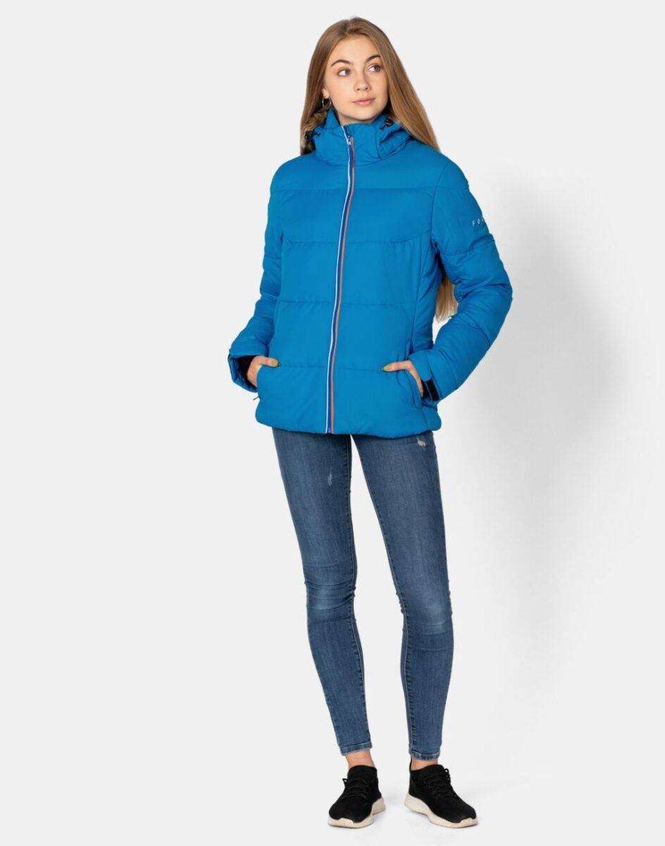 Kurtka narciarska damska Foxi-Club Ski wykonana w najnowszej technologii jak również według najnowszych trendów sportowej mody. Jest wyjątkowo ciepła bo ocieplona w całości puchem syntetycznym. Materiał na zewnątrz posiada wykończenie typu Water Repellency, które zapobiega nasączeniu warstwy zewnętrznej wodą. Kurtka termoaktywna „oddychająca” Foxi-Club Ski dzięki zastosowaniu specjalnej membrany utrzymuje ciepło wewnątrz i odprowadza nadmiar pary wodnej na zewnątrz. Skutecznie zabezpiecza użytkownika przed chłodem, wiatrem, deszczem, jest wodoodporna, elastyczna, a także odporna na działanie czynników atmosferycznych. Wspomaga generowanie i utrzymanie ciepła.