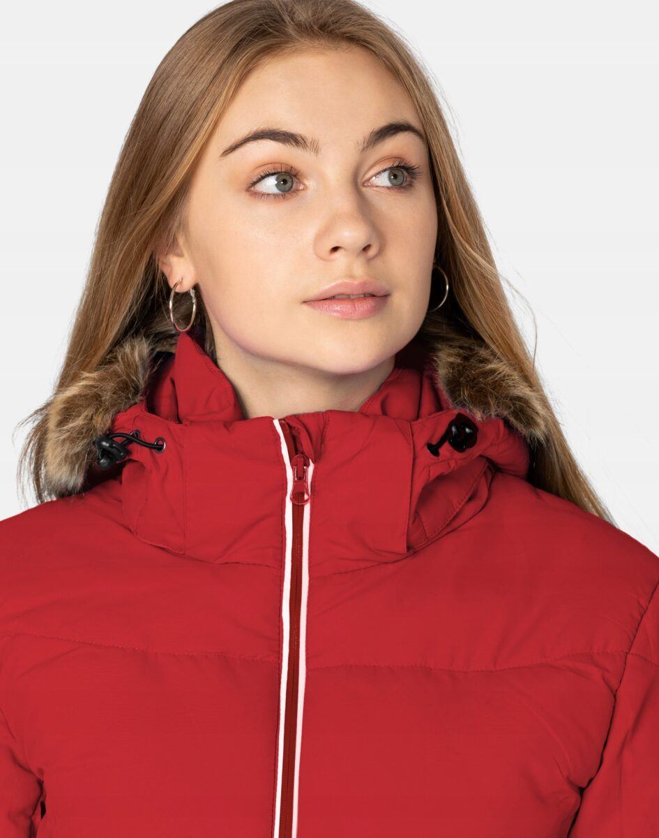 Kurtka jest zgrabnie taliowana i zasuwana w całości na wodoodporny zamek błyskawiczny. Posiada dwie kieszenie przednie na dłonie zasuwane na kryte wodoodporne zamki błyskawiczne, a wewnątrz praktyczne kieszenie na telefon kom./MP3/MP4 (z wyjściem na słuchawki) gogle/rękawiczki/kominiarkę/dokumenty itp . Na lewym rękawie zasuwana na  wodoodporny zamek kieszeń na SKIPASS. Regulowany w 3D i ocieplany kaptur osłoni Twoją głowę przed deszczem, wiatrem i chłodem a wysoki kołnierz/stójka skutecznie chroni podbródek i szyję a często zastępuje nawet szalik co jest bardzo wygodne. Dół kurtki posiada możliwość regulacji szerokości i dopasowania za pomocą elastycznego ściągacza i stoperów, które pozwalają na precyzyjne dopasowanie kurtki do ciała a wszyte w rękawach pół-rękawiczki zapobiegają utracie ciepła i skutecznie chronią przed podmuchami wiatru. Kurtka posiada również antypoślizgowy pas przeciwśnieżny zabezpieczający przed utratą ciepła i zapobiegający dostawaniu się zimna, wilgoci, wody, śniegu od dołu kurtki. Zgrabnie taliowana, idealnie dostosowana do kobiecej budowy ciała, wykonana w najnowszej technologii, jak również według najnowszych trendów sportowej mody.
